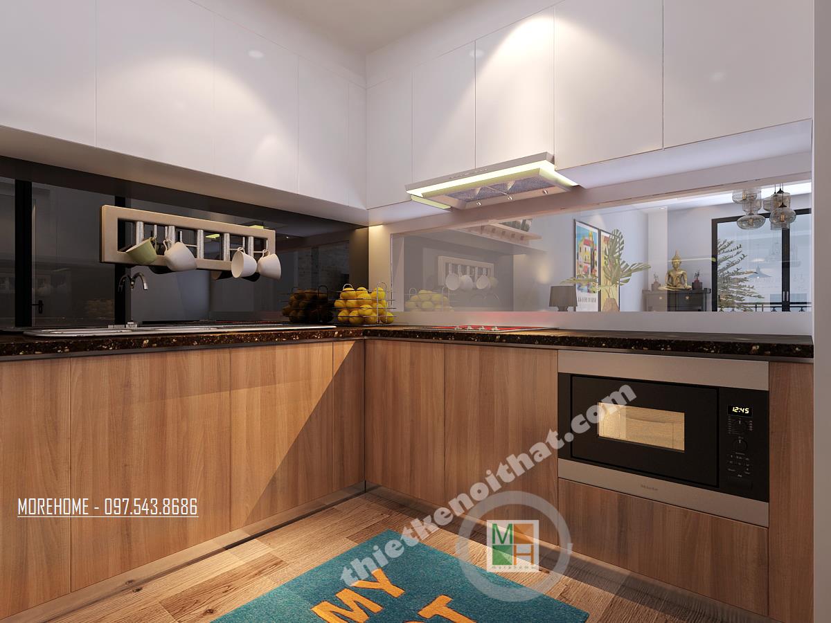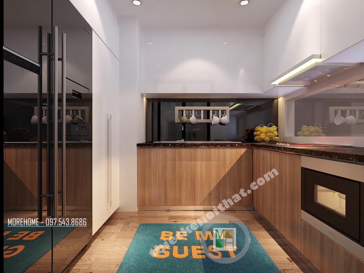 Thiết kế nội thất phòng bếp hiện đại sử dụng cửa kính cường lực giúp tạo độ mở cho căn phòng. Diện tích phòng bếp không quá rộng nhưng được bố trí hợp lý thành một căn phòng nhỏ nhưng vẫn không gây ra cảm giác bí bách và khó chịu. Điểm đặc biệt nhất của căn phòng này có lẽ là thiết kế khung chữ nhật khá to nhìn thẳng và thông với khu vựa bàn ăn. Nhìn vào thiết kế này, ta có thể dễ dàng thấy sự tương đồng với những nhà hàng hiện đại, trẻ trung, kiểu thiết kế này cũng giúp tọa tầm nhìn rộng và bao quát gần như liên thông với phòng ăn. Thiết kế kệ tủ bếp đơn giản với tông màu veneer sáng mang đến hiệu ứng ánh sáng và màu sắc hài hòa với tông màu trắng gợi cảm giác dễ chịu và tinh tế.