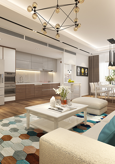 Giải pháp tối ưu được lựa chọn cho những căn hộ chung cư đó là nội thất thiết kế với không gian mở nhằm tận dụng tối đa ánh sáng thiên nhiên. Với diện tích nằm trong tầm trung nên các kiến trúc sư đã lồng ghép không gian phòng khách – ăn – bếp thành một không gian sinh hoạt chung thống nhất nhưng vẫn đảm bảo có sự riêng tư nhất định.