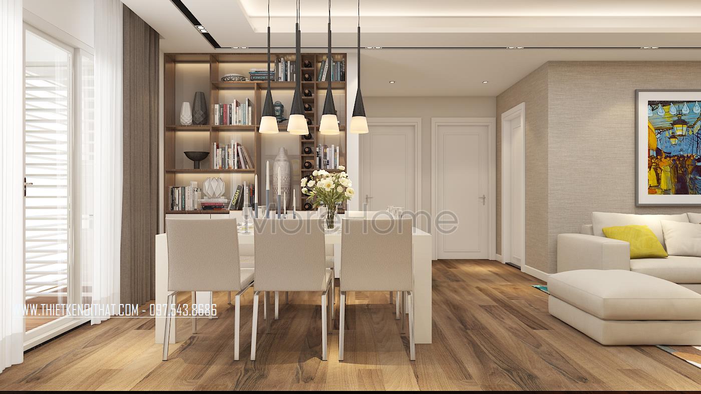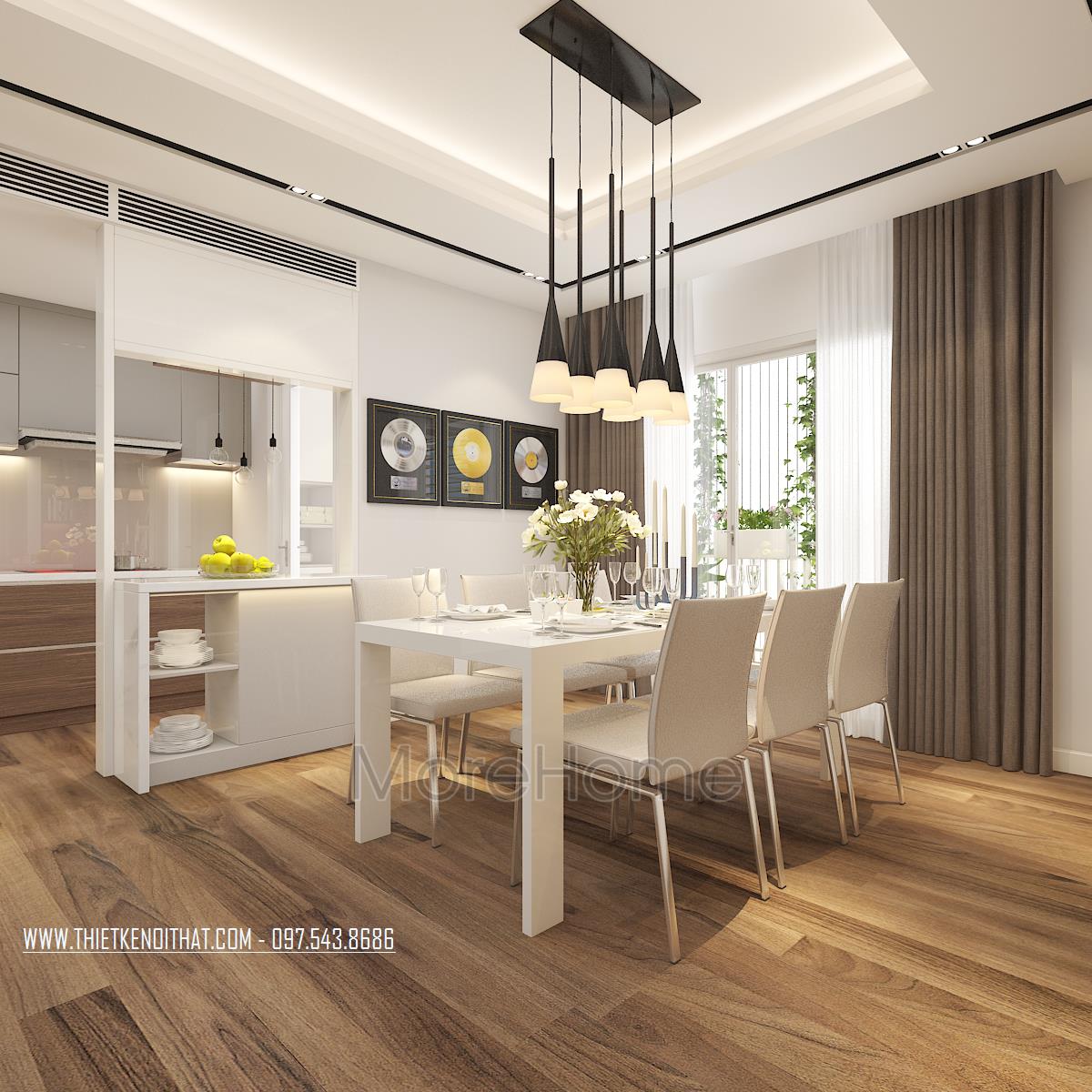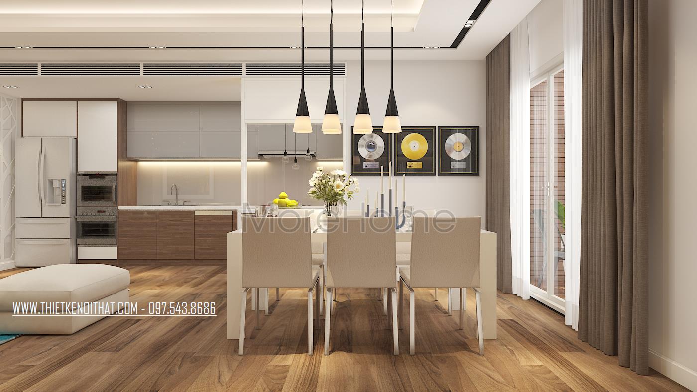 Từ cửa chính bước vào thì bên tay trái là khu vực phòng ăn với thiết kế đơn giản bàn ăn hiện đại dành cho 6 người trong trường hợp có khách thì có thể kê thêm ghế cho 8 – 10 người ăn, bàn ăn được thiết kế cạnh cửa kính có logia bên ngoài. Phía bên tay phải là phòng khách với bộ sofa nỉ góc chữ L màu trắng sữa. Có thể nói điểm nhấn đặc biệt cho phòng khách đó là những chiếc gối ôm trang trí và tạo nên một không gian hoàn hảo. Thêm vào đó là đèn chùm trang trí phá cách. Sofa kê sát bức tường nhấn có sử dụng giấy dán tường cùng tông và đậm hơn một chút. Đối diện bộ sofa là khu vực nấu nướng với tủ bếp hiện đại được làm từ gỗ công nghiệp. Không gian bếp nhỏ nhưng vẫn đảm bảo đầy đủ tiện nghi và công năng cần thiết.