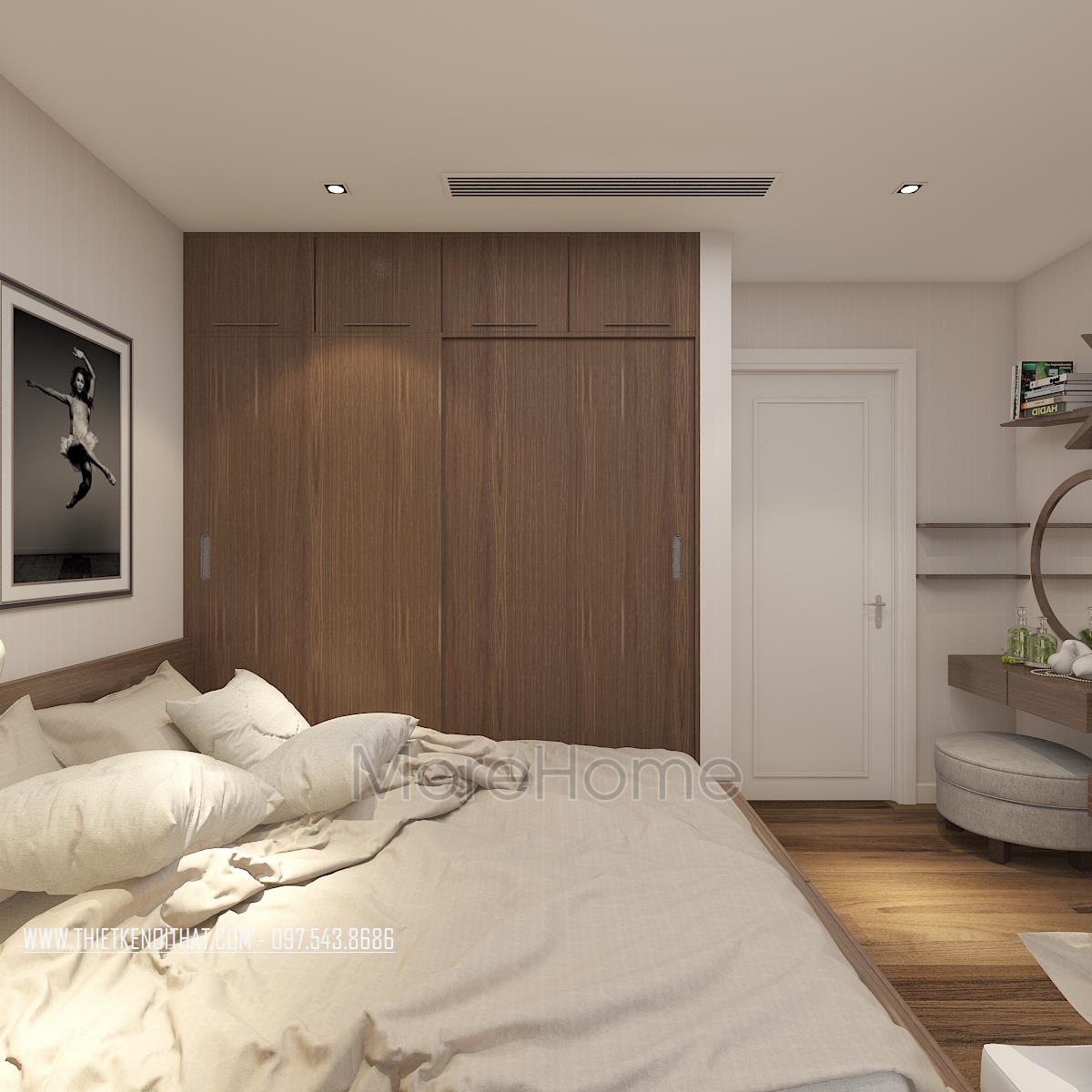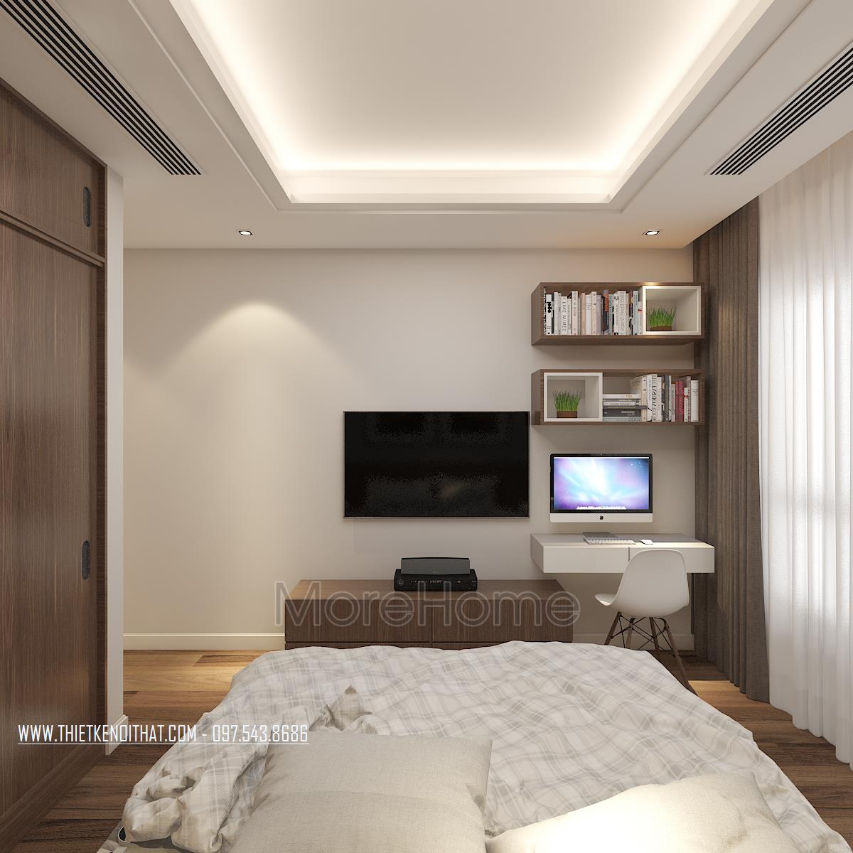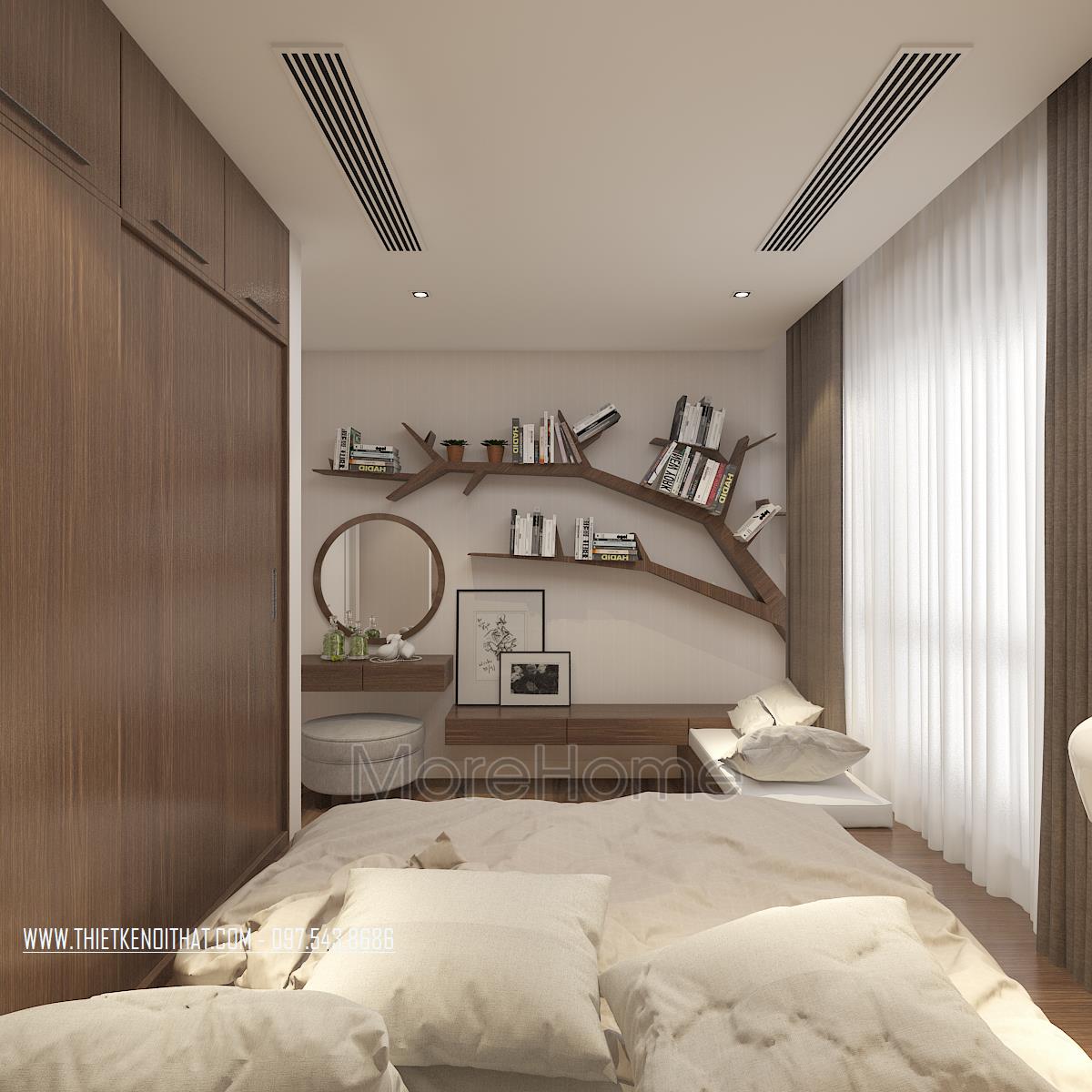Tiếp đến là thiết kế nội thất phòng ngủ master sát cửa sổ thông thoáng. Đồ nội thất trongphòng chủ yếu được làm từ gỗ vời tủ áo được bố trí song song với giường và cửa sổ. Đối diện với giường là kệ tivi và bàn làm việc. Phía trên bàn làm việc là giá sách được thiết kế cách điệu. Hai bên táp đầu giường là tủ trag trí và cũng có công năng để đồ. Phòng ngủ con cũng được thiết kế tương tự với giường và tủ áo. Tuy nhiên do diện tích hạn hẹp bề ngang nên không thiết kế thêm tap đầu giường, bù lại diện tích chiều sâu là vị trí dành cho bàn học và bàn trang điểm.