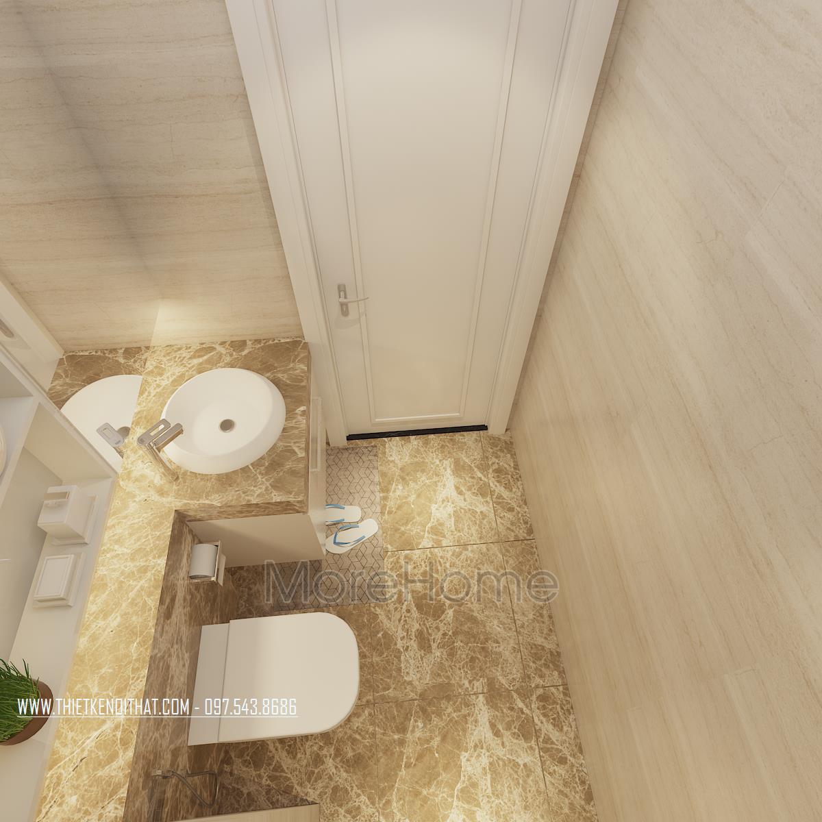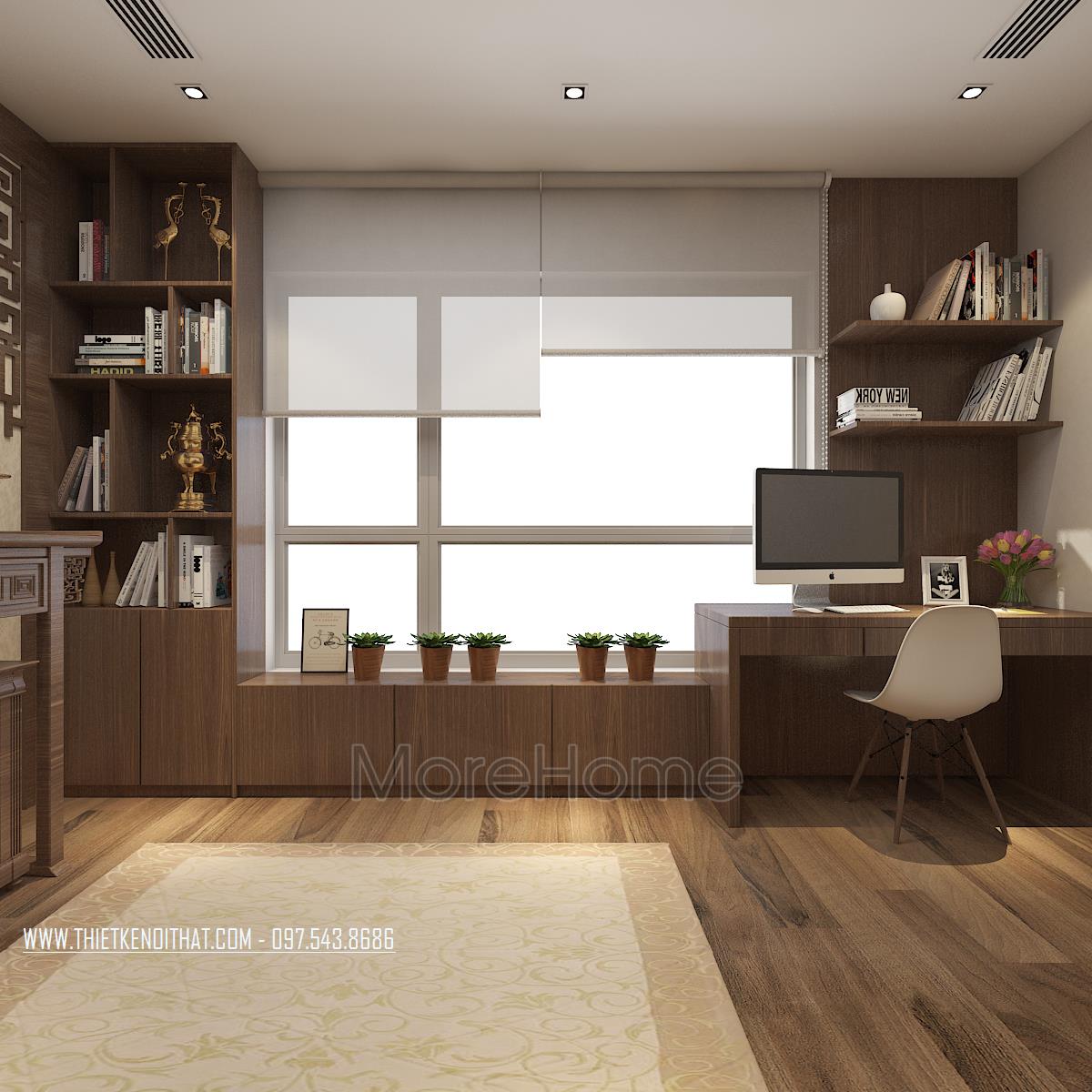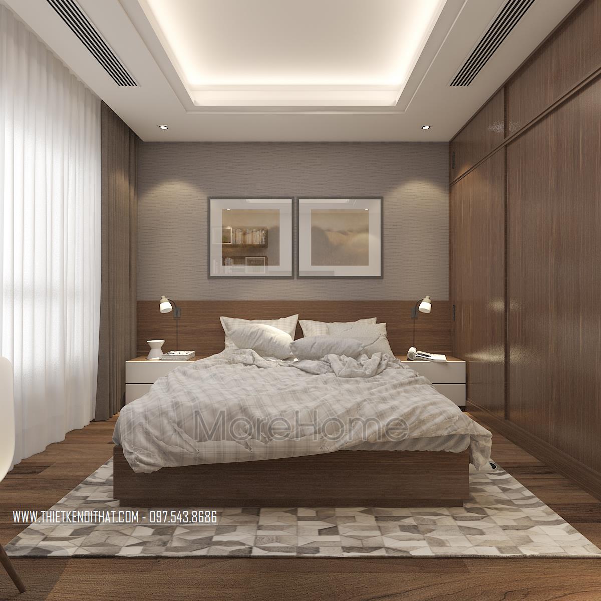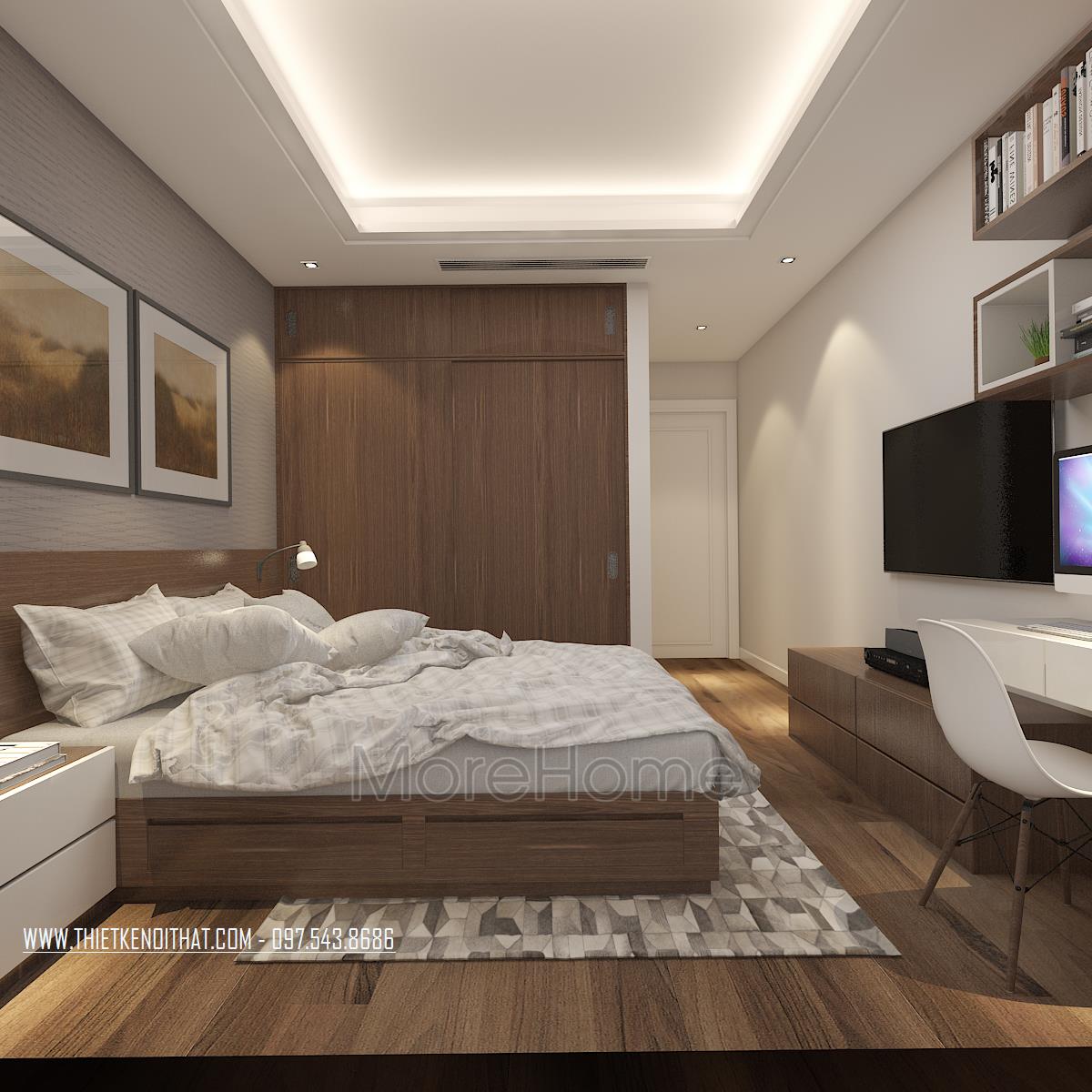 Tiếp đến là thiết kế nội thất phòng ngủ master sát cửa sổ thông thoáng. Đồ nội thất trongphòng chủ yếu được làm từ gỗ vời tủ áo được bố trí song song với giường và cửa sổ. Đối diện với giường là kệ tivi và bàn làm việc. Phía trên bàn làm việc là giá sách được thiết kế cách điệu. Hai bên táp đầu giường là tủ trag trí và cũng có công năng để đồ. Phòng ngủ con cũng được thiết kế tương tự với giường và tủ áo. Tuy nhiên do diện tích hạn hẹp bề ngang nên không thiết kế thêm tap đầu giường, bù lại diện tích chiều sâu là vị trí dành cho bàn học và bàn trang điểm.