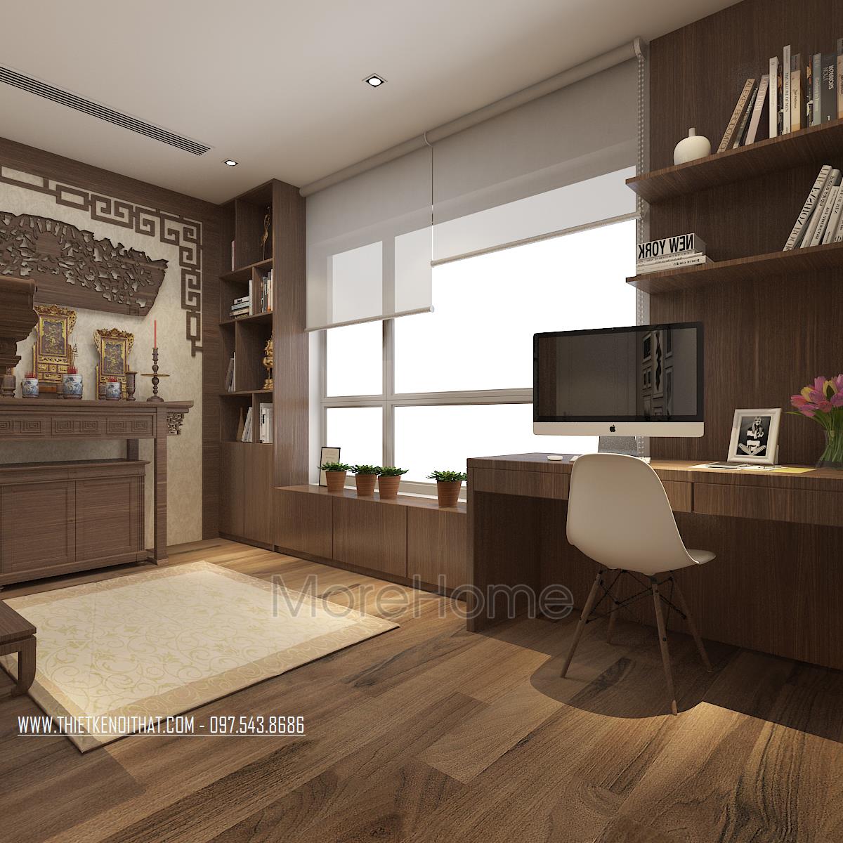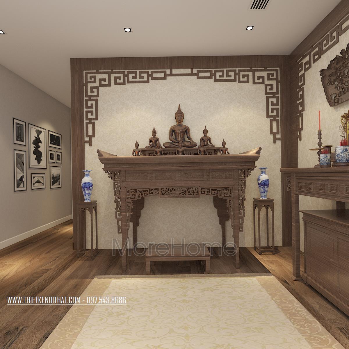 Thiết kế không gian tâm linh như phòng thờ cũng được chủ nhà khá chú trọng và đầu tư nhiều. Thiết kế vuông góc kết hợp, một bên là bàn thờ phật, một bên là bàn thờ gia tiên kết hợp với tủ thờ. Vách cnc phòng thờ là những hoa văn nhấn và tạo sự mềm mại. Sát với cửa sổ là hệ thống tủ kệ trang trí và góc làm việc, thư giãn nho nhỏ cho gia chủ
