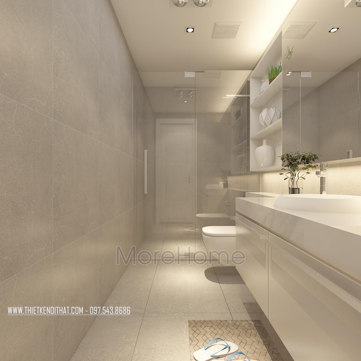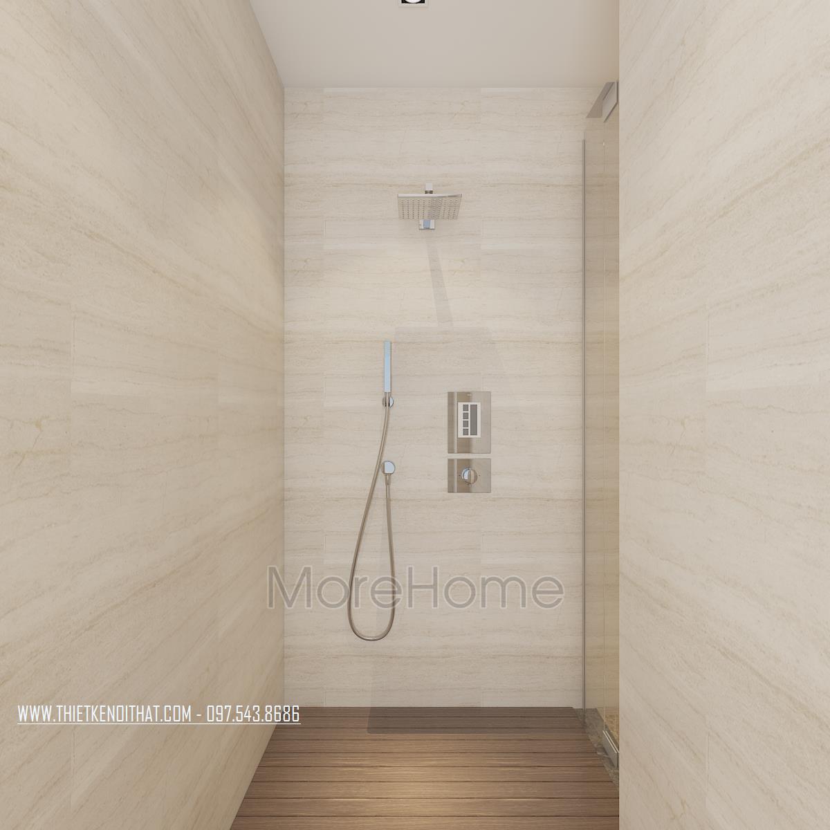 Các phòng tắm đều sử dụng kính cường lực làm vách tắm kính. Đặc tính của kính có thể khiến không gian được nới rộng hơn rất nhiều, đồng thời vách tắm kính cũng giúp không gian vệ sinh được khô dáo