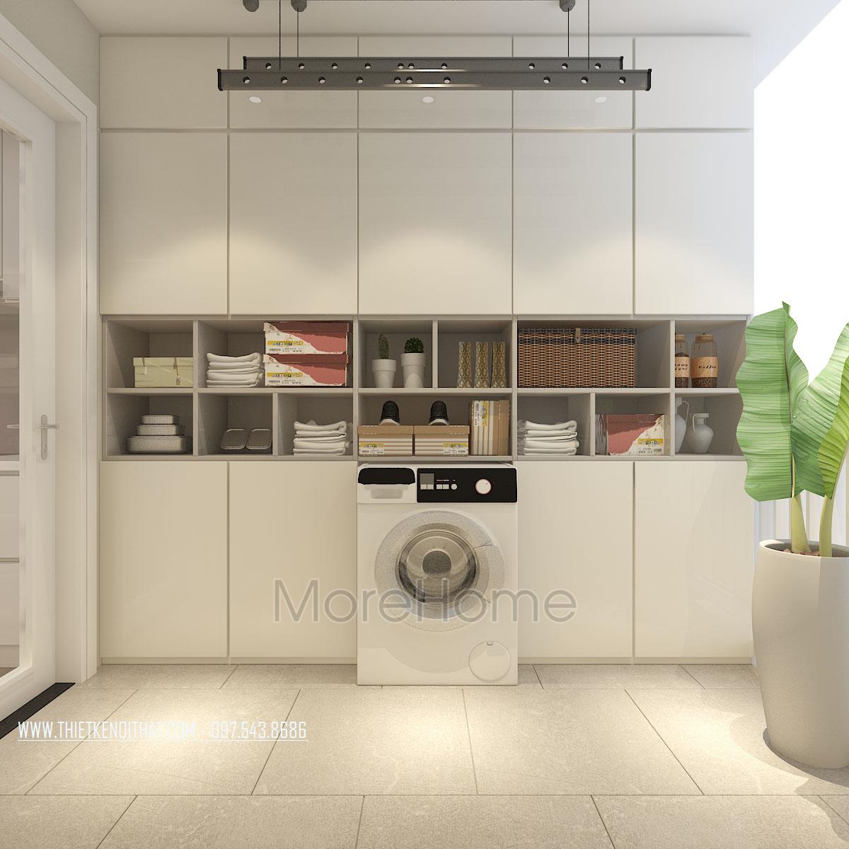 Hệ thống hút mùi được thiết kế ngang trần đảm bảo sự thông thoáng cho toàn bộ không gian liên thông này. Trần thạch cao giật cấp với điểm nhấn là hệ thống đèn âm tường sử dụng ánh sáng trắng tươi mới phơi sáng. Trong không gian chung này còn sử dụng vách cnc trang trí đồng thời tạo sự phân cách với góc tủ để đồ dùng sinh hoạt chung của cả gia đình