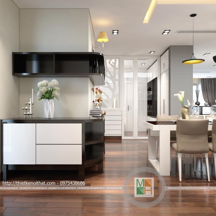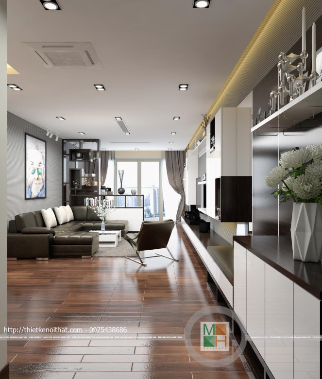 Không gian trong căn hộ này là một không gian mở, thông phòng khách phòng ăn và nhà bếp. Phòng khách hiện đại trang nhã với hai gam màu trắng và nâu sẫm chủ đạo, nét tương phản này làm nổi bật sự hiện đại, tinh tế của cả căn phòng. Bộ sô pha được đặt chính giữa đối diện với TV và kệ. Hệ thống chiếu sáng của căn phòng đến từ những bộ âm trần được bố trí đều khắp, tạo ánh sáng đến từng chi tiết nhỏ trong phòng. Ngoài ra còn có cửa kính lớn bên cạnh hướng ánh sáng tự nhiên cho phòng.