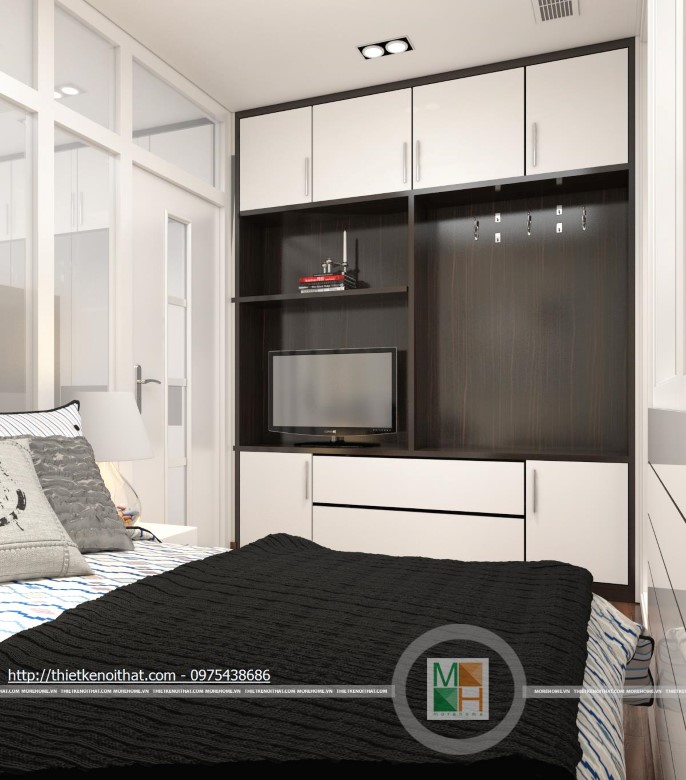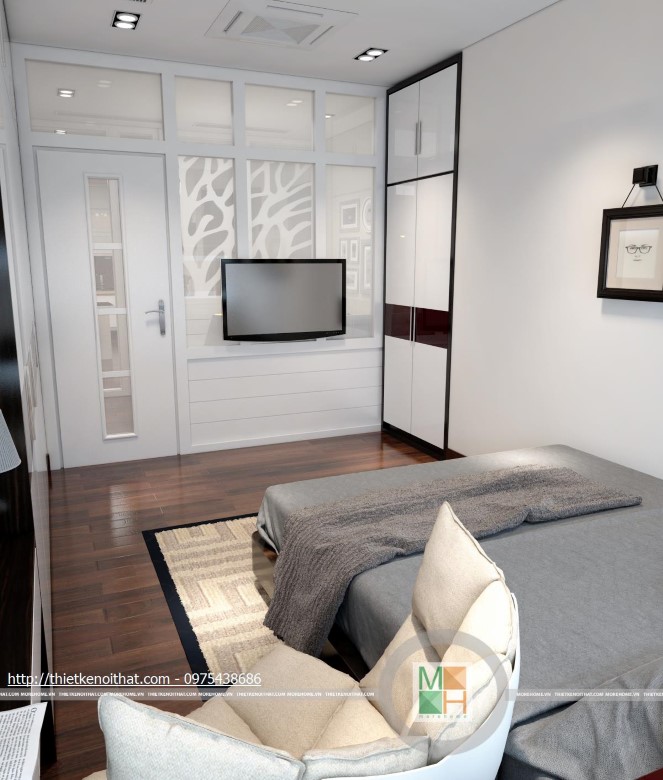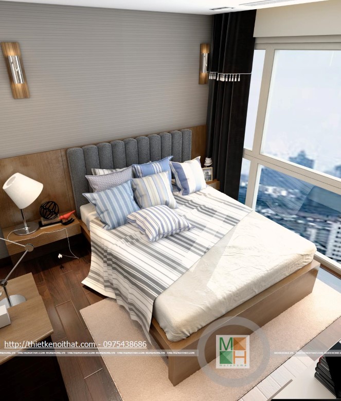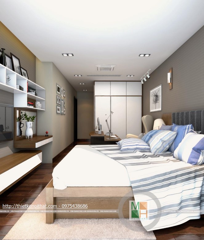 Phòng ngủ lớn được thiết kế hiện đại cùng gam màu sáng chủ đạo thích hợp với lứa tuổi trẻ trung và năng động. Hệ thống cửa lớn tạo không gian cho căn phòng. Các chi tiết trang trí đều rất hài hòa phù hợp với màu sắc cũng như không gian phòng.