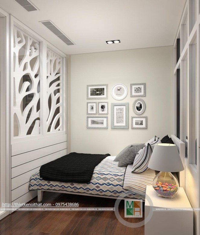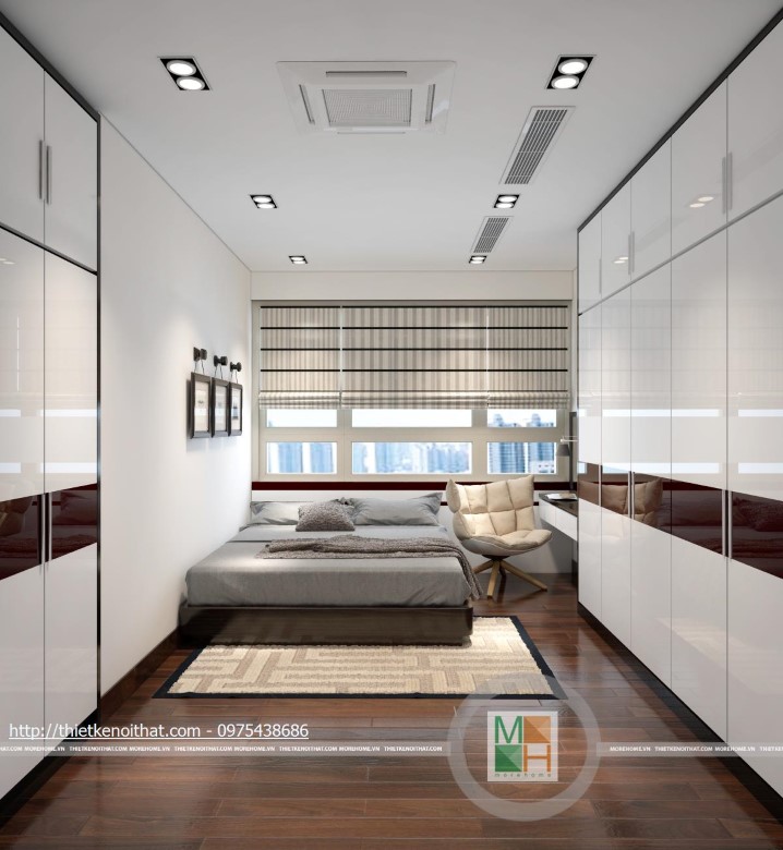 Phòng ngủ nhỏ nổi lên những đường nét hiện đại và năng động, phòng ngủ này thích hợp với những đôi vợ chồng trẻ. Cách thiết kế nội thất phòng ngủ đơn giản với tủ đồ được đặt sát hai bên tường. Cửa sổ lớn nơi đầu giường mang ánh sáng tự nhiên và không khí cho căn phòng. Bên cạnh giường là một chiếc ghế tựa để gia chủ có thể ngồi đọc sách báo hoặc uống cà phê vào buổi sáng.