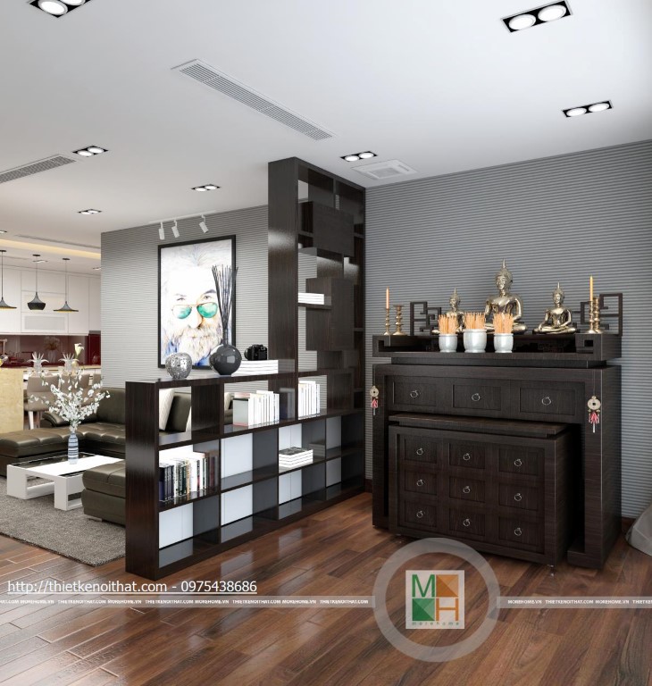 Phòng thờ thông với phòng khách nhưng vẫn giữ được sự tách biệt nhờ kệ sách lớn nằm giữa ngăn cách. Việc đặt bàn thờ bên phong khách làm tăng thêm sự ấm cúng cho căn phòng.