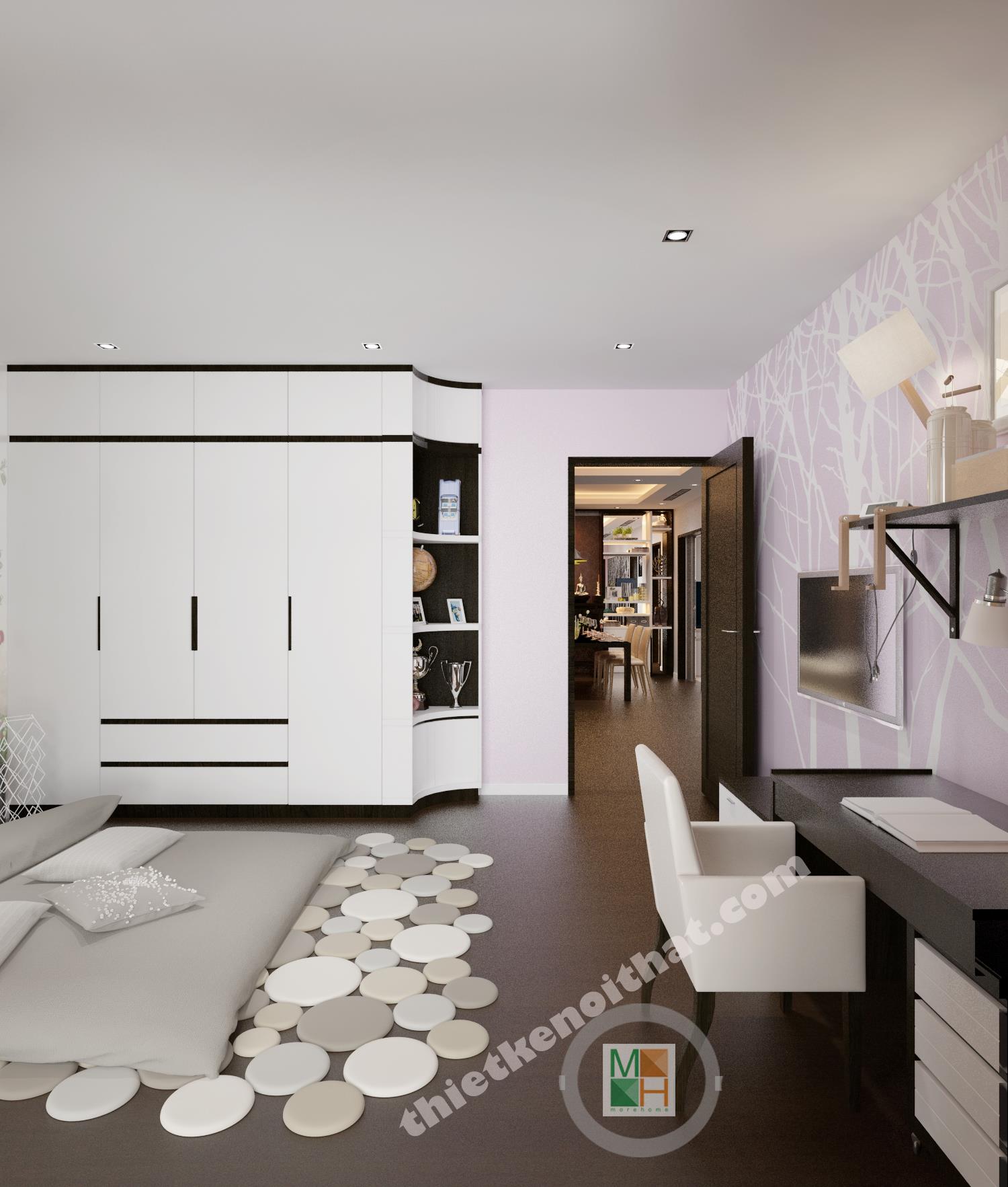 Phòng ngủ của con gái có chung một lối thiết kế và phối màu với gian khách bếp với màu trắng và nâu đen nổi bật. Tuy nhiên ở đây màu trắng là màu chủ đạo và màu nâu là điểm nhấn. Những viền nâu gỗ trên tủ đồ đã giúp màu trắng của chiếc tủ không còn nhàm chán. Sự phối hợp giữa màu trắng và nâu gỗ cũng được thể hiện ở bàn làm việc. Tuy nhiên những nét nhẹ nhàng nữ tính dành cho con gái vẫn được thể hiện rõ nét ở các chi tiết giường đệm, chăn ga gối hay là những chi tiết trang trí trên tường. Điểm khá đặc biệt ở đây là nhà thiết kế đã không sử dụng giường cho căn phòng mà chỉ dùng đệm lớn và đặt lên trên những tấm mút tròn rất mới mẻ và hiện đại. Bàn trang điểm được đặt ở cạnh giường là một thiết kế đúng và phù hợp với phòng của con gái. Ánh sáng của căn phòng được lấy từ khung cửa kính lớn và điều chỉnh bằng rèm. Hệ thống chiếu sáng được loại bỏ đèn chùm để giảm chi tiết và được lắp đèn mắt trâu âm trần để căn phòng giữ được nét hiện đại và năng động vốn có.