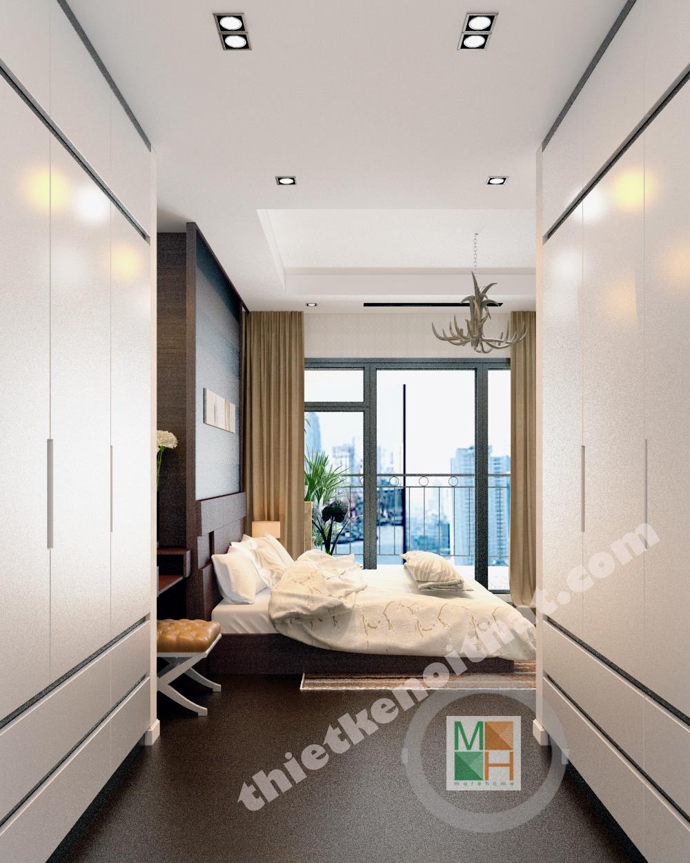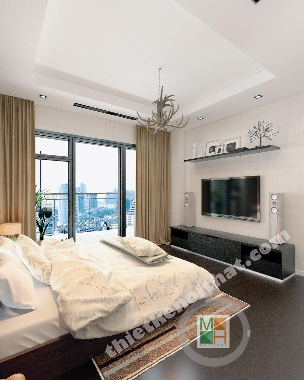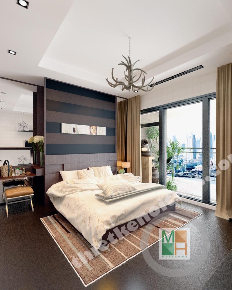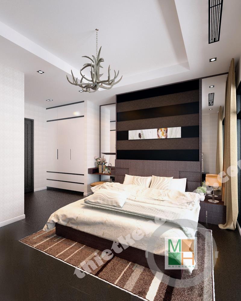 Chủ nhà đã lớn tuổi, do đó thiết kế nội thất phòng ngủ master có những nét khác biệt để phù hợp với tuổi tác. Màu sắc của căn phòng được phối với tông màu trầm hơn với màu nâu và màu ghi làm chủ đạo. Vách tường đầu giường được phối nhiều giữa hai màu trầm là màu nâu và màu ghi, tạo sự dịu nhẹ cho căn phòng. Màu nâu xám còn được thể hiện ở màu gạch. Phòng không quá lớn nhưng việc sắp đặt khoa học đã giúp căn phòng có một không gian khá thoải mái. Tủ lớn được đặt dọc lối ra vào của phòng, tiết kiệm được rất nhiều không gian. Cuối phòng là hệ thống các thiết bị giải trí, chỉ là màn hình và hệ thống loa đơn giản, phù hợp nhu cầu của người lớn tuổi. Ánh sáng tự nhiên của căn phòng luôn tràn ngập nhờ khung của kính lớn hướng ra ban công và được điều chỉnh bằng rèm. Hệ thống đèn chiếu sáng của phòng sử dụng đèn hắt trần và đèn mắt trâu, tuy nhiên điểm nhất của căn phòng là bộ đèn chùm với thiết kế khá độc đáo dạng sừng hươu. Những phối ghép về nội thất cũng như màu sắc vô cùng phù hợp với người lớn tuổi.