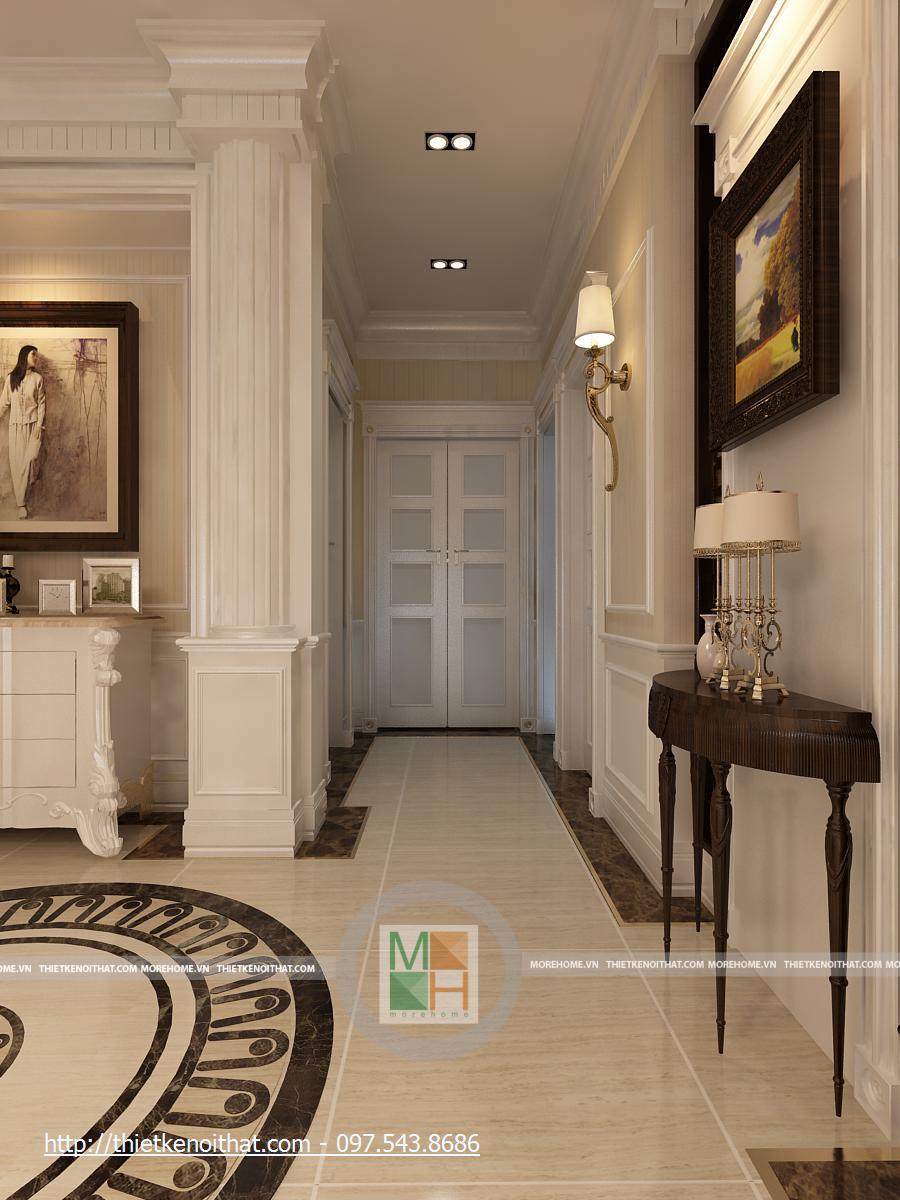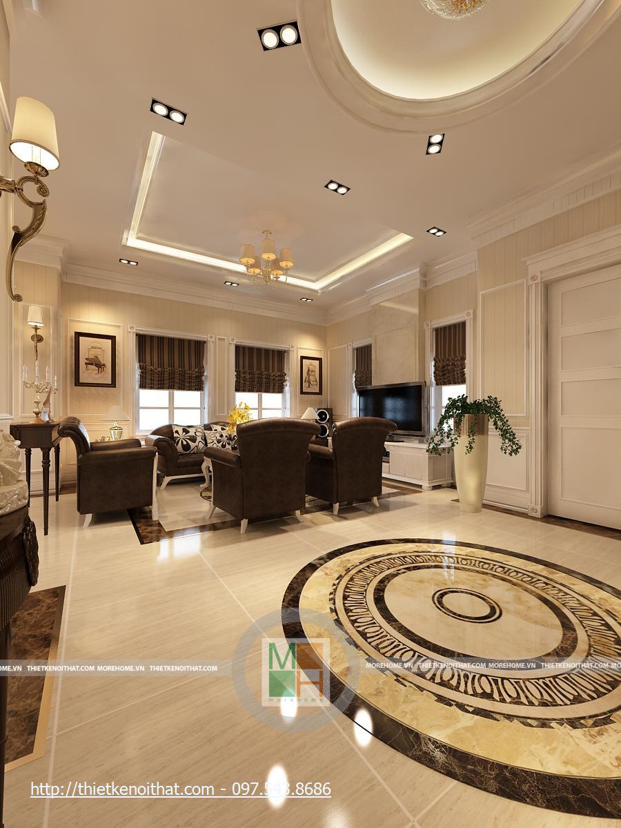 Một tổng thể sang trọng, đầy ánh sáng và sự tương phản mạnh mẽ là tổng quan chung của phòng khách. Ánh sáng tự nhiên được tận dụng nhờ khung kính lớn, hoàn toàn không chắp ghép. Không gian phòng khách được sắp đặt theo từng khu vực khá gọn gàng, tạo những không gian tách biệt. Nơi tiếp khách được lùi vào trong so với hành lang đi lại, tạo sự kín đáo nhẹ nhàng. Chúng ta có thể thấy được sự phối hợp màu sắc hài hòa trong căn phòng. Trong tổng thể sáng màu của màu gạch và màu tường thì bộ salon nâu sẫm lại là điểm nhấn. Việc kết hợp màu rèm cửa và màu salon là một nét tinh tế của căn phòng, giúp cho màu nâu sẫm của salon không bị lạc lõng và đơn điệu. Gian khách được tách biệt với hành lang chính từ cửa vào bằng một vách ngăn, tạo sự riêng tư cho từng khu trong căn phòng.