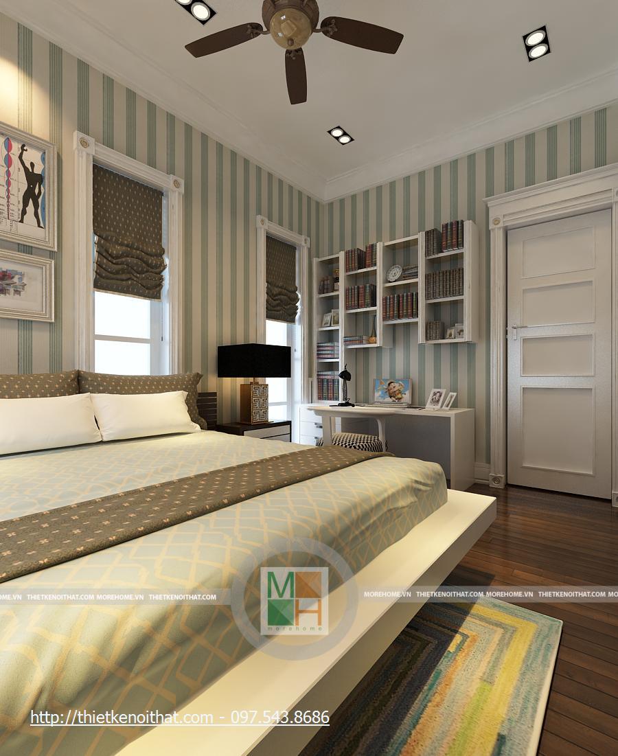 Phòng ngủ con tầng 3 được trang trí khá rực rỡ và trẻ trung. Có một chút giống nhau về nội thất với phòng ngủ của con ở tầng 2. Vẫn là 2 cửa sổ nhỏ cạnh giường, cửa sổ chính lớn và bàn làm việc cạnh đó, màn hình TV được đặt trên kệ đối diện giường. Tuy nhiên một chút màu sắc được đưa vào bộ chăn-ga –gối đã khiến cho căn phòng trẻ nên sinh động và đầy màu sắc. thay vì màu sẫm như phòng ngủ cho con ở tầng 2, chăn ga ở đây được sử dụng những sọc màu vàng kết hợp xanh lơ, tạo nên sự trẻ trung, sáng tạo cho căn phòng. Trền nền vàng ấm nhẹ của căn phòng là những khung tranh nhỏ, giúp cho nên tường không bị nhàm chán và hơn nữa là tăng thêm sự mới mẻ cho căn phòng. Căn phòng được thiết kế dành cho con gái.