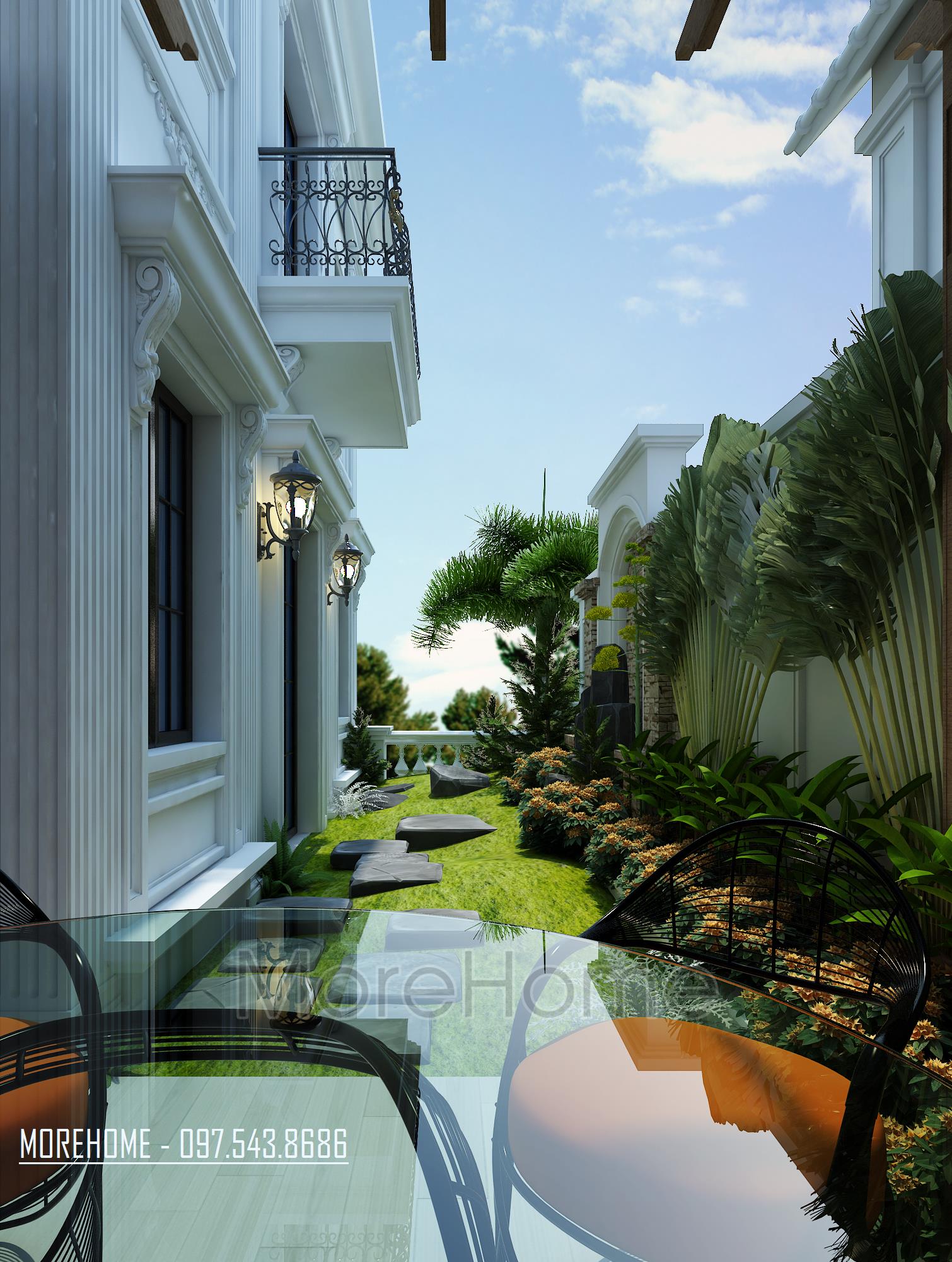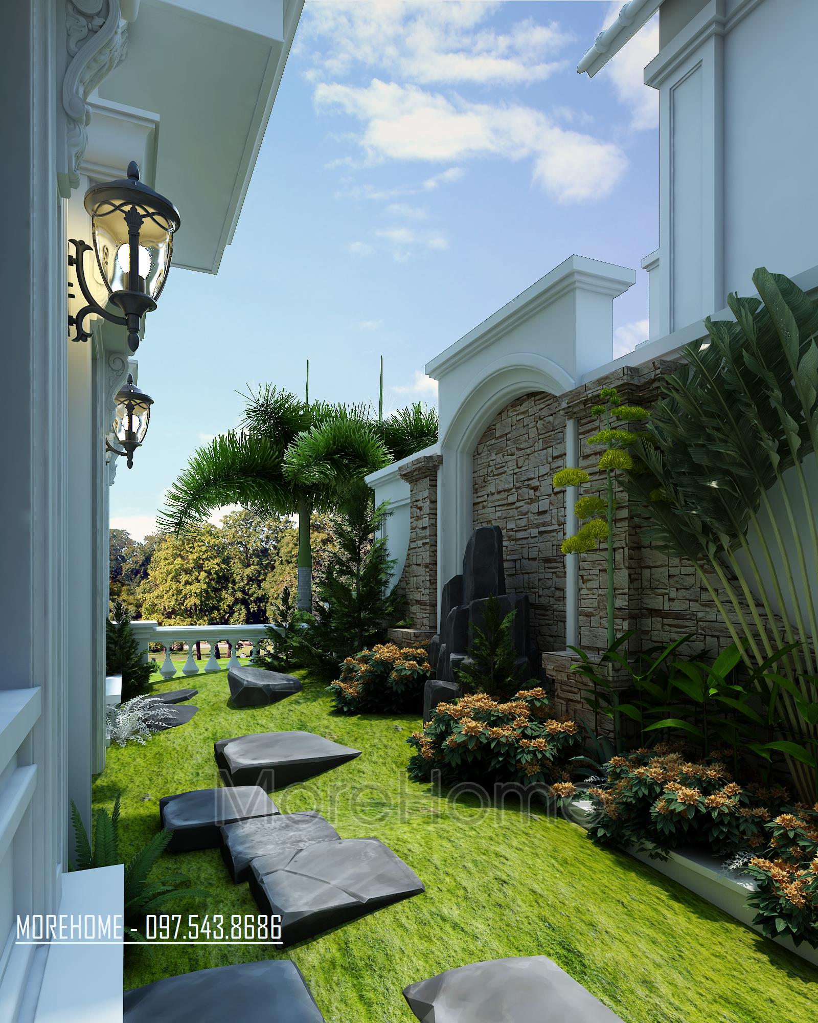 Không gian thiết kế xanh bao quanh căn nhà, kéo dài và ôm trọn căn biệt thự góp phần lớn tạo độ thoáng và phân chia không gian hợp lý hơn. Với các căn nhà trong thành phố, diện tích bao thường rất hẹp, gây ra một cảm giác khó chịu và khá tối tăm, thường sẽ là điểm xấu ảnh hưởng đến thẩm mỹ của căn nhà, tuy nhiên với thiết kế biệt thự tân cổ điển này, không gian bao quanh đủ rộng kết hợp hài hòa với không gian và tạo thêm điểm nhấn trong thiết kế cảnh quan biệt thự.