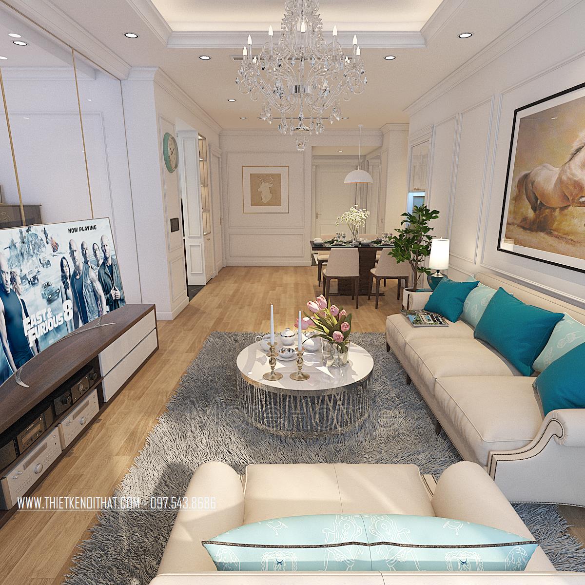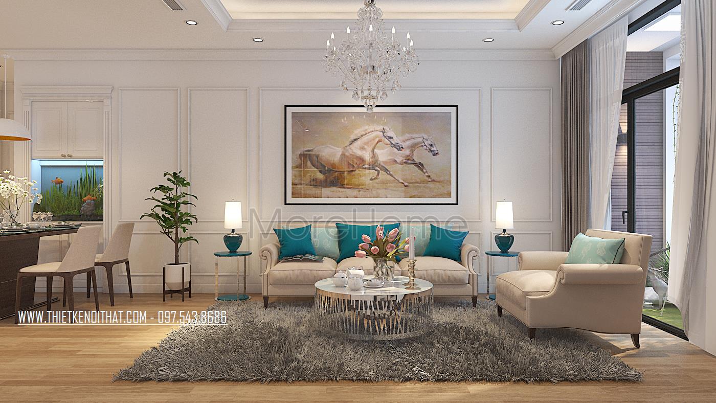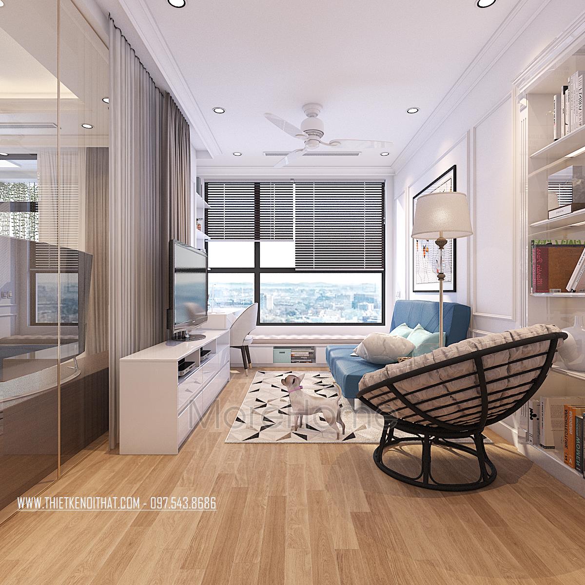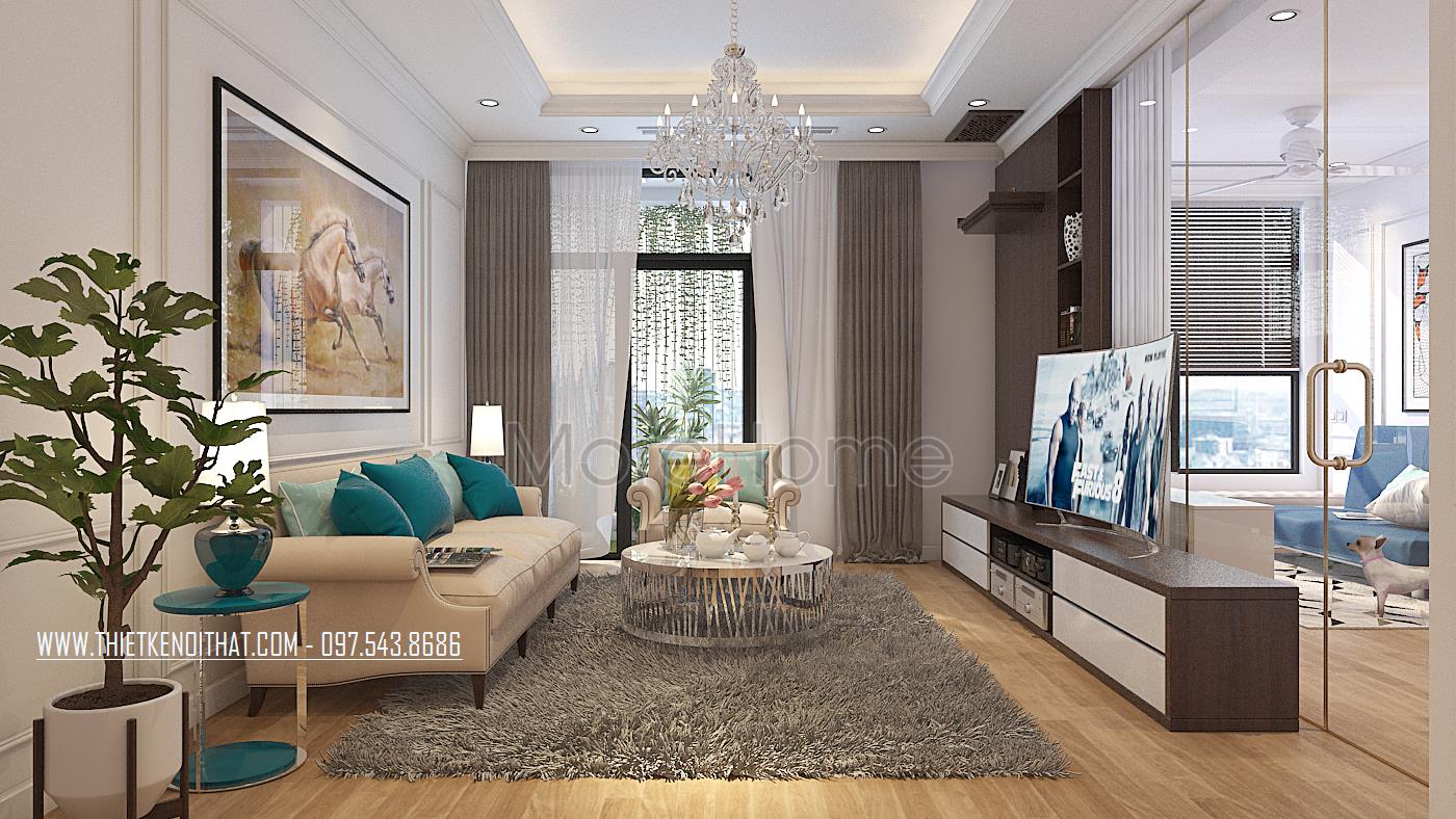 Thiết kế nội thất phòng khách hiện đại sử dụng tone màu be nhạt và trắng làm nền mang đến cho căn phòng cảm giác nhẹ nhàng và tươi mới. Thiết kế ghế sofa to rộng, chất liệu giả da êm ái giúp tạo sự thoải mái cho gia chủ. Thiết kế kệ tủ là một trong những điều khá đau đầu với nhiều gia chủ, làm sao để vừa đảm bảo tính thẩm mỹ, lại vừa đúng tỉ lệ và phù hợp với căn hộ, để giải quyết vấn đề này, kiến trúc sư đã khéo léo sử dụng các tủ gỗ đóng riêng cho căn hộ giúp mang đến sự ưng ý nhất cho gia chủ. Không quá nhấn mạnh vào chi tiết tuy nhiên tủ gỗ kết hợp kệ ti vi này lại vô cùng chú trọng đến tính công năng, vừa đảm bảo mang lại không gian sống gọn gàng lại góp phần tiết kiệm diện tích.
