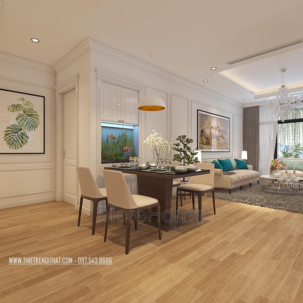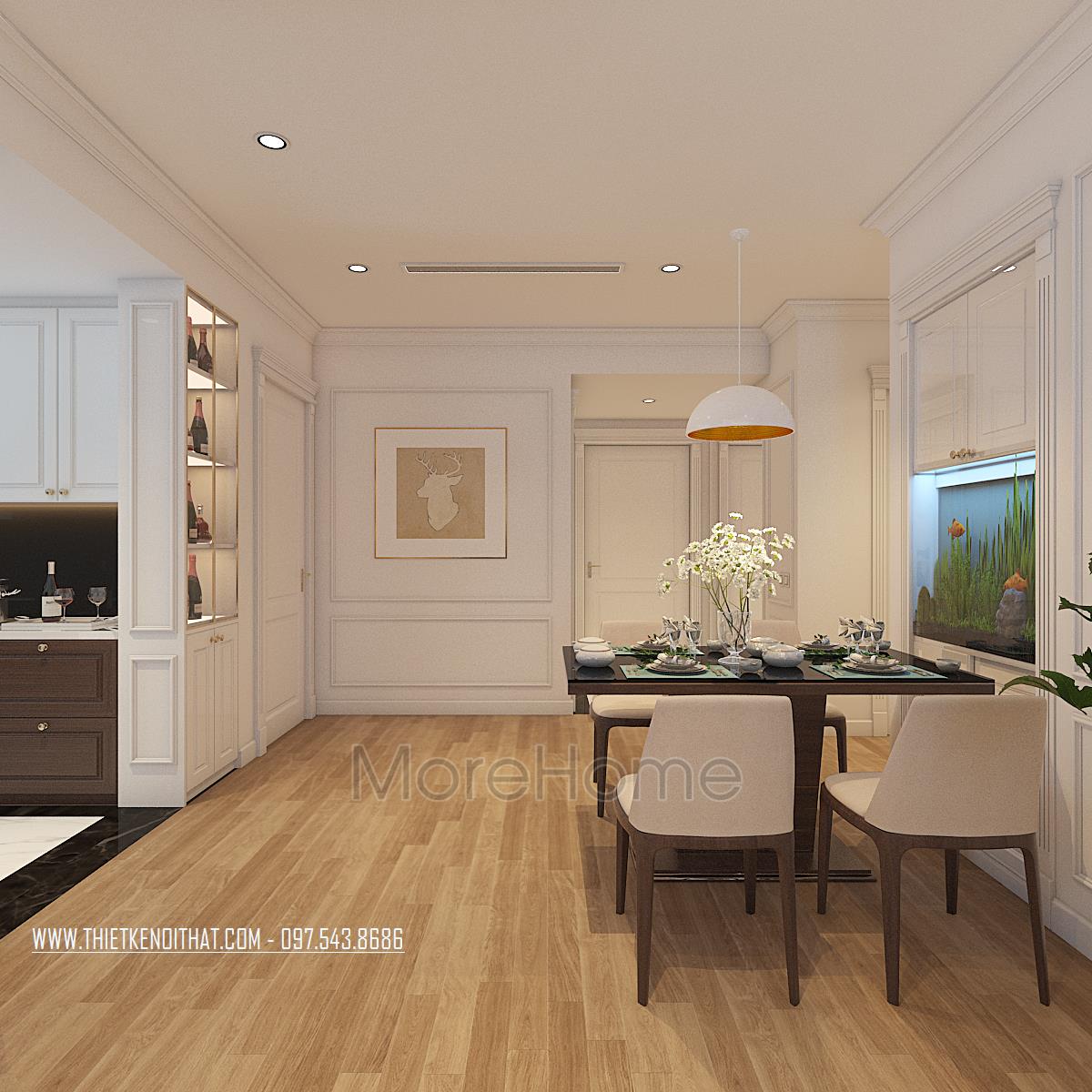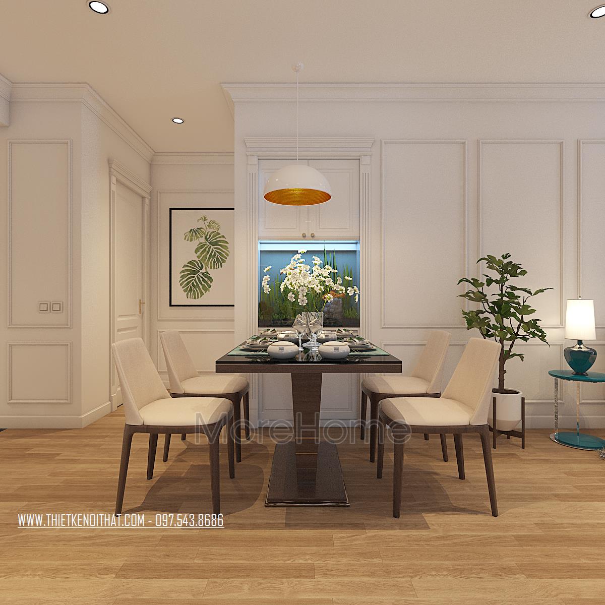 Thiết kế nội thất không gian bàn ăn phong cách hiện đại khá nhỏ gọn. Thiết kế gọn gàng phù hợp với căn hộ. Các chi tiết trang trí không quá cầu kỳ hay đi sâu vào chi tiết trạm khắc mà thay vào đó, tính công năng được nhấn mạnh hơn cả. Để giúp thiết kế trở nên mới lạ và tăng thêm tính thẩm mỹ cho không gian, kiến trúc sư đã khéo léo đặt một một bể cá nhỏ âm tường giúp tạo điểm nhấn cho không gian. Bên cạnh đó, các thiết kể nhỏ từ đèn chùm đến lọ hoa trên bàn đều góp phần lớn khơi gợi cảm xúc tích cực cho các thành viên bên bàn ăn nhỏ.