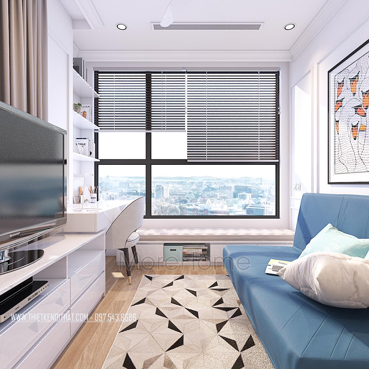 Thiết kế nội thất phòng ngủ đơn giản với sự phối hợp hài hòa của màu sắc, chi tiết, đường nét và cả màu sắc. Không gian nhỏ trở nên rất đa năng và tiện dụng nhờ vào các thiết kế kết hợp kệ tủ, vừa đảm bảo tính công năng lại giúp tiết kiệm diện tích. Ngoài ra, thiết kế mở nhờ vào ứng dụng kính cường lực trong suốt giúp mang lại ánh sáng tự nhiên, tăng độ mở và độ thoáng cho không gian hẹp.