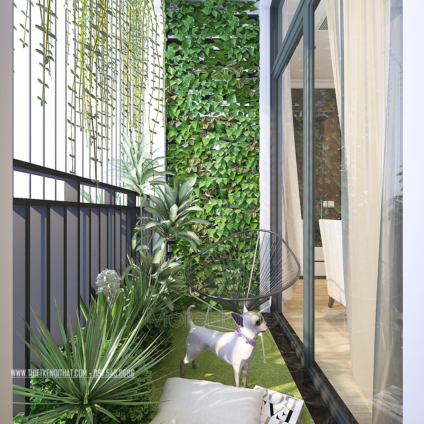 Một trong những không gian được ưa thích của căn hộ chính là thiết kế ban công xanh mát. Thiết kế vườn treo độc đáo với kế ngồi hướng tầm mắt ra khung cảnh toàn thành phố, đây thực sự là không gian thư giãn tuyệt với sau một ngày dài mệt nhọc. Bên cạnh đó, thiết kế thanh ngang gọn gàng làm kệ đồ còn tăng thêm tính công năng cho không gian sống.