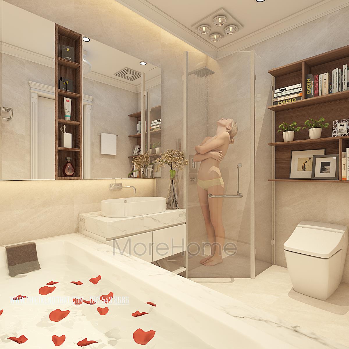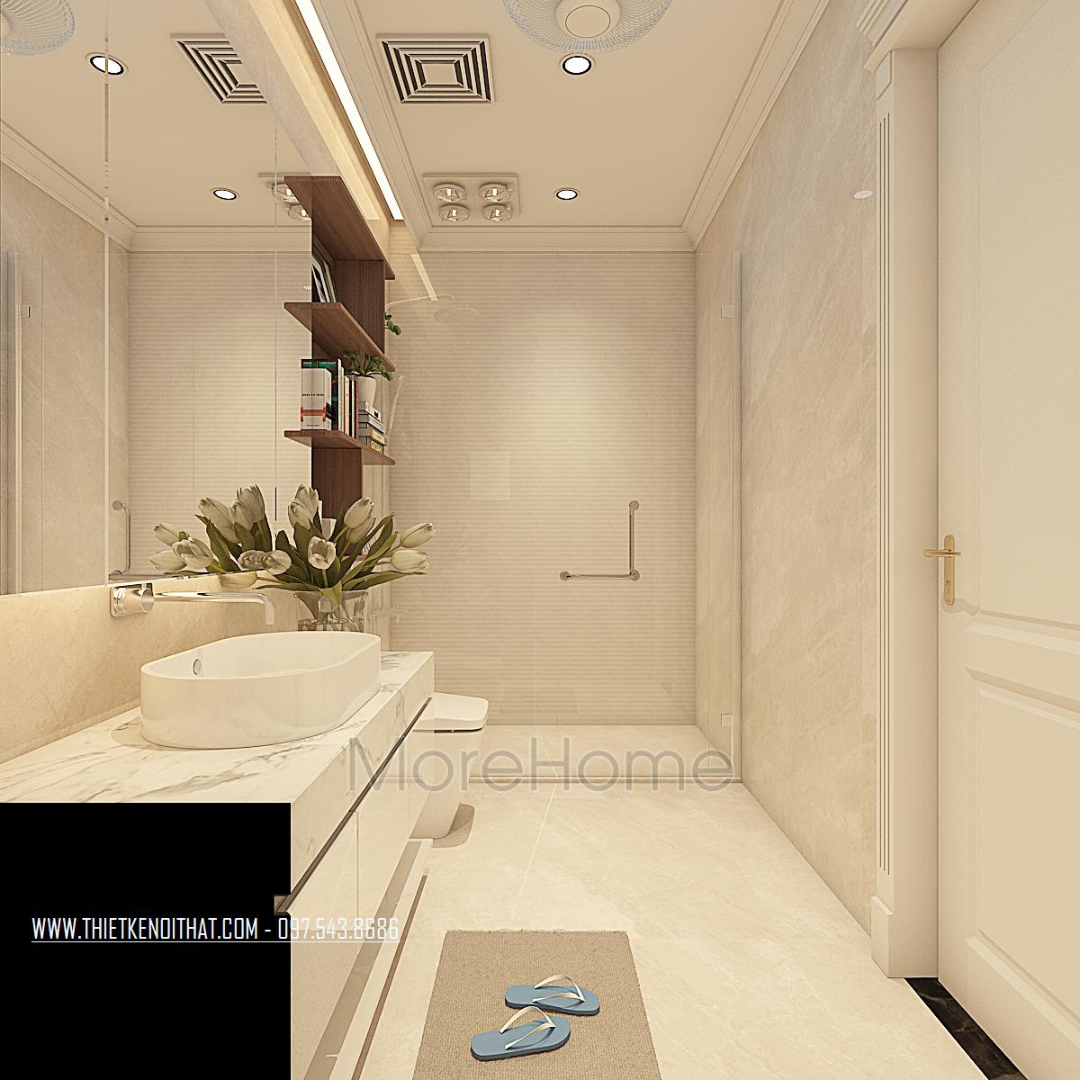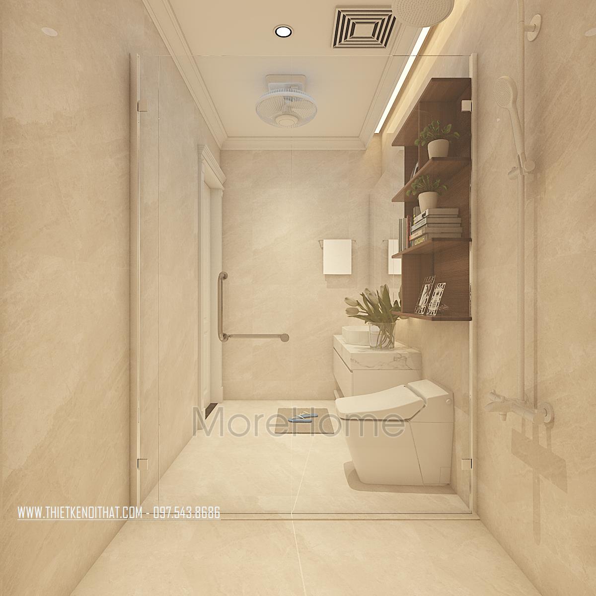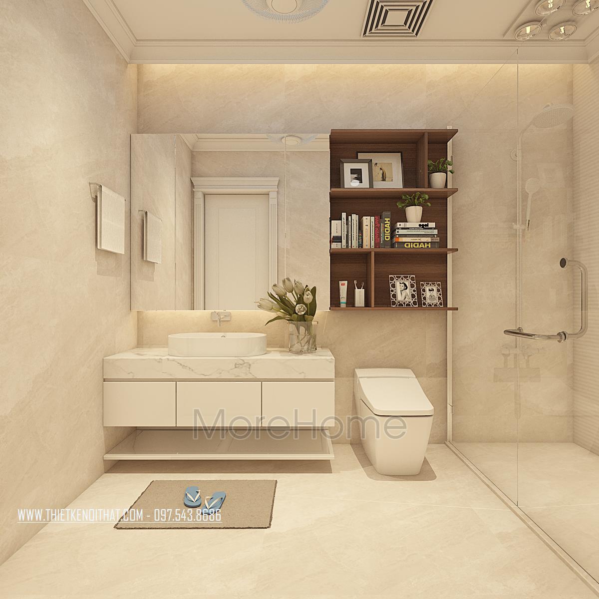 Cuối cùng là thiết kế nhà vệ sinh hiện đại. Tone màu trắng sáng được sử dụng giúp không gian trở nên sáng hơn, tạo hiệu ứng mở rộng không gian. Các thiết bị sử dụng được thiết kế đơn giản, chất liệu nhẹ như kính cường lực, gương, đá tự nhiên được sử dụng mang đến sự linh hoạt, góp phần tăng độ thoáng và mở cho căn phòng.