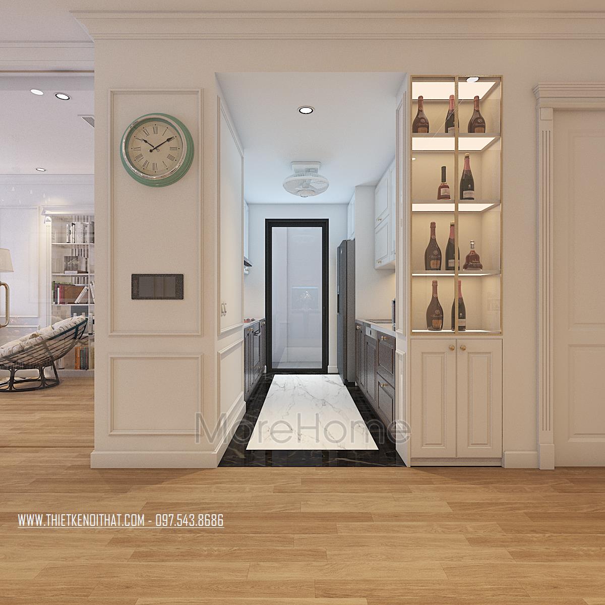 Căn bếp liền kề được thiết kế gọn gàng với tone màu đơn giản đảm bảo tính công năng, gọn gàng và tinh tế.