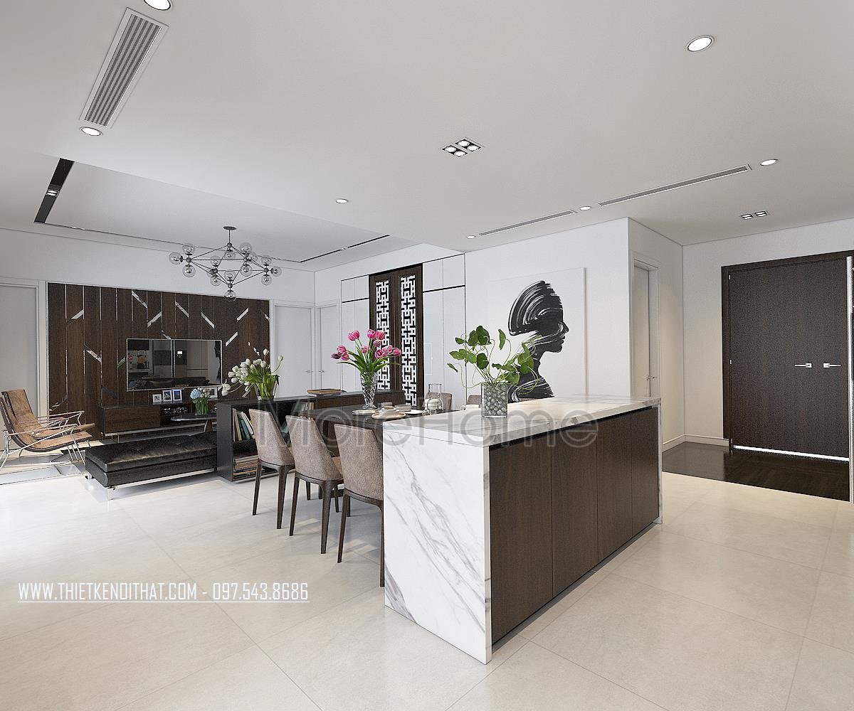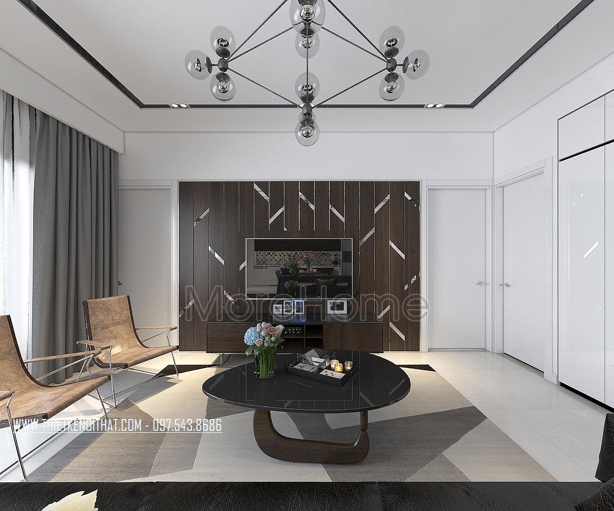 Thiết kế nội thất phòng khách hiện đại căn hộ Imperia Garden mang đến cho chúng ta cảm giác trẻ trung, hiện đại mà vô cùng tinh tế. Thiết kế sử dụng tone màu đen trắng là hai tone màu chủ đạo, đây cũng là một sự lựa chọn rất thông minh, bởi đây là hai tone màu cơ bản, không bao giờ lỗi thời, đảm bảo được tính cập nhật xu hướng. Thiết kế ghế sofa không quá rộng, kích cỡ cơ bản với thiết kế đơn giản, không đi sâu vào các chi tiết trạm khắc hay trang trí mà nhấn mạnh vào tính công năng nhiều hơn. Bên cạnh đó, chất liệu giả da cũng mang đến cho thiết kế một cái nhìn mới tràn đầy sự trẻ trung, năng động.