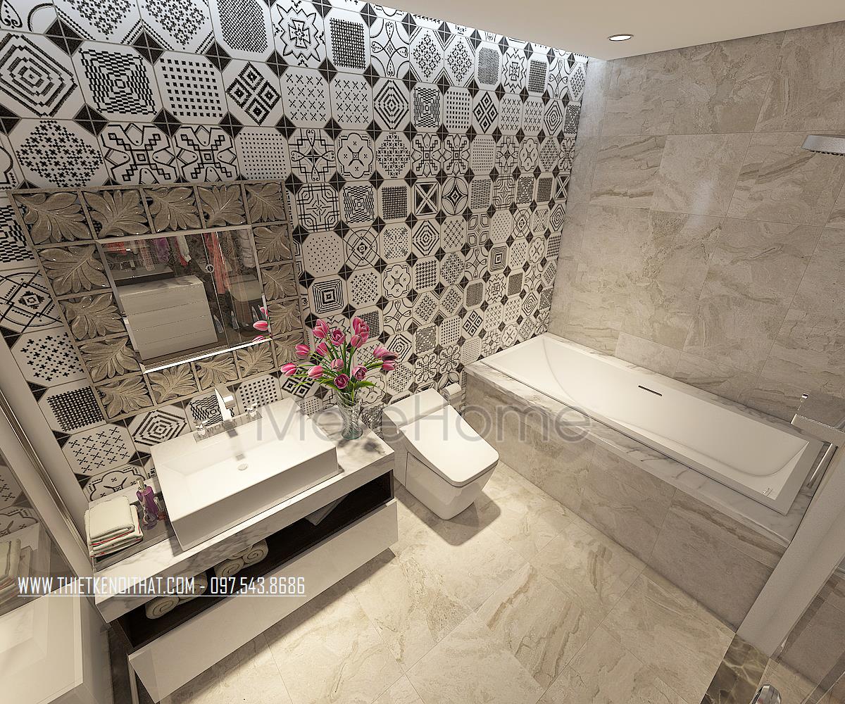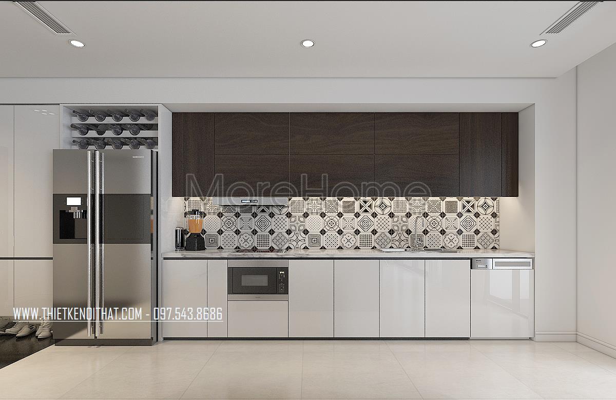 Thiết kế nội thất bếp hiện đại không hề cầu kỳ mà đơn giản tạo thành một mặt phẳng gọn gàng với đầy đủ tiện nghi của một căn bếp hiện đại. Một điểm nhấn thẩm mỹ đặc biệt của căn bếp chính là thiết kế gạch ốp hoa văn sáng tạo. Thay vì các thiết kế ốp gạch đơn thuần một màu thì ở đây, kiến trúc sư đã lựa chọn các họa tiết trang trí ô vuông ấn tượng làm điểm nhấn, tránh cảm giác nhàm chán và đơn điệu.