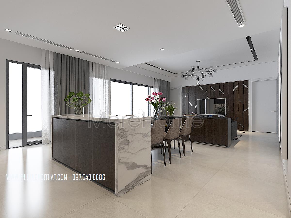 Tiếp theo là thiết kế nội thất không gian bàn ăn và bếp hiện đại. Thiết kế liền kề không hề có vách ngăn tạo một không gian sinh hoạt chung liền mạch giúp các hoạt động của gia đình trở nên dễ dàng và thuận tiện hơn rất nhiều. Bàn ăn được đặt gọn gàng với thiết kế đơn giản, không quá nổi bật về thiết kế và màu sắc. Tone màu nâu sữa nhẹ nhàng và nâu trầm veneer gỗ được kiến trúc sư ưu ái lựa chọn giúp tạo sự thống nhất về phong cách màu sắc sử dụng.