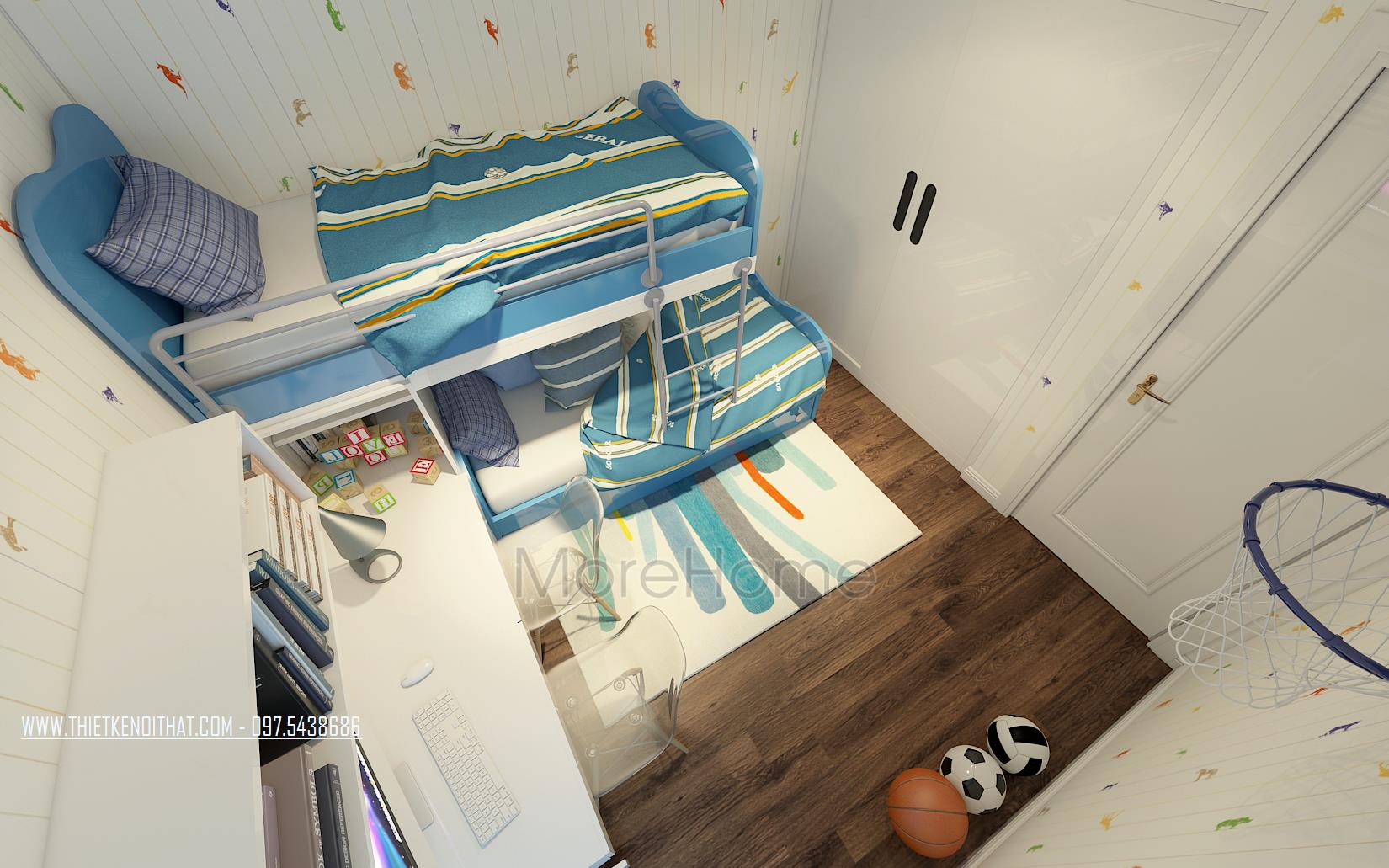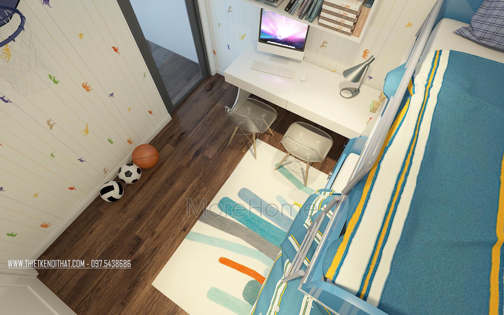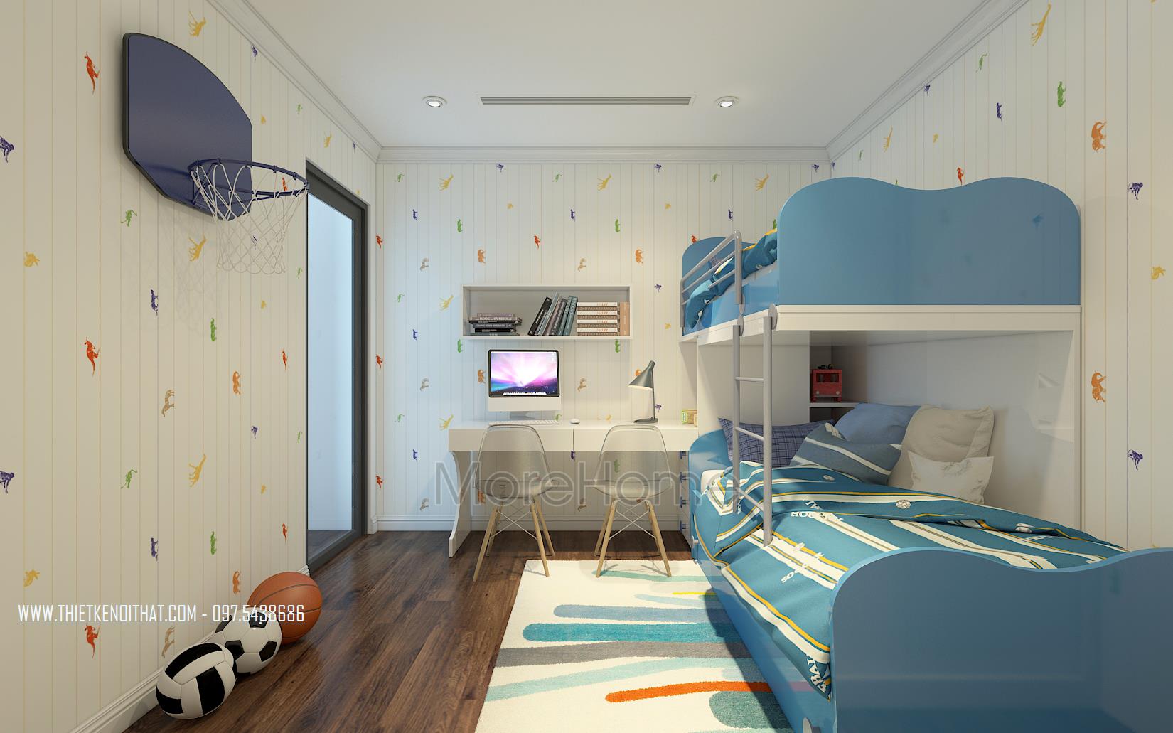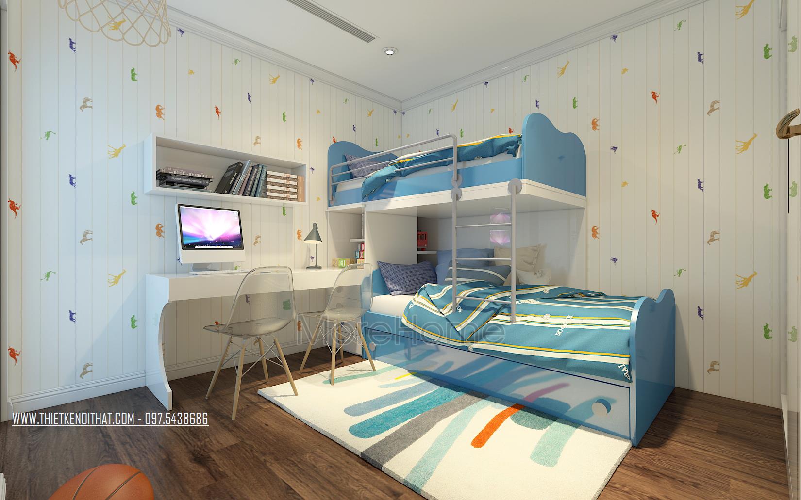 Đối với thiết kế nội thất phòng ngủ cho trẻ nhỏ, kiến trúc sư sử dụng nhiều hơn các màu sắc và chi tiết trang trí vui nhộn từ đó mang đến không gian riêng tư đầy sự sáng tạo, tươi trẻ và cuốn hút. Bằng việc sử dụng các vật liệu nhẹ như giấy dán tường, gỗ ép, thiết kế nội thất căn phòng cho trẻ cũng trở nên linh hoạt và dễ dàng thay thế hay sửa chữa. Thiết kế giường tầng kết hợp kệ gỗ hay ngăn kéo là ý tưởng không tồi vừa đảm bảo tính công năng cho căn phòng lại tiết kiệm đáng kể không gian.
