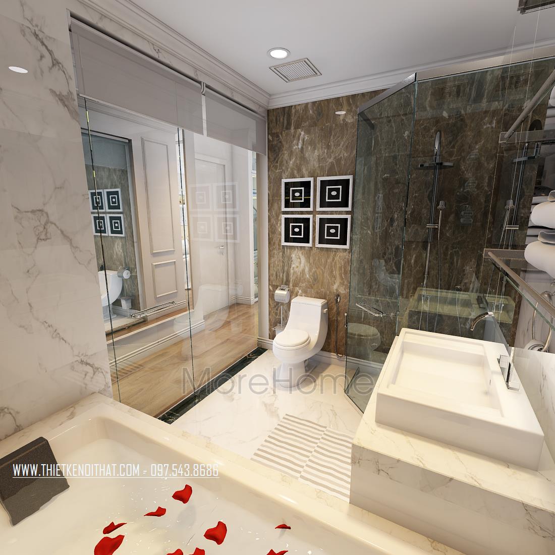 Cuối cùng là thiết kế nội thất phòng tắm hiện đại. Các vật liệu nhẹ như gương, kính cường lực trong suốt là các vật liệu được sử dụng nhiều nhất giúp tạo sự liền mạch và tăng độ mở cho không gian. Đá tự nhiên ốp tường hoa văn đơn giản, vừa đảm bảo tính thẩm mỹ lại dễ dàng lau chùi.