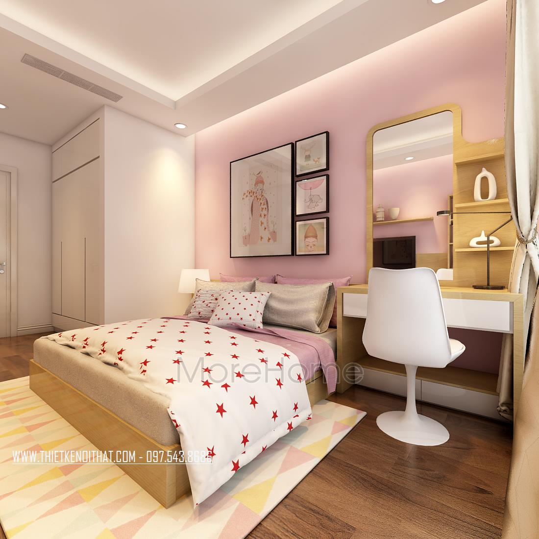 Một trong 3 không gian thiết kế nội thất phòng ngủ hiện đại sử dụng các tone màu sáng tạo hơn như hồng pastel, xanh, vàng làm điểm nhấn giúp không gian trở nên vô cùng ấn tượng. Ánh sáng tự nhiên vẫn là chi tiết được kiến trúc sư vô cùng chú trọng. Không gian mở với cửa kính rộng, trong suốt đem ánh sáng tự nhiên tràn ngập căn phòng. Các thiết kế gỗ ép được thiết kế riêng biệt cho không gian này với đầy đủ tính công năng và nổi bật về tính thẩm mỹ.