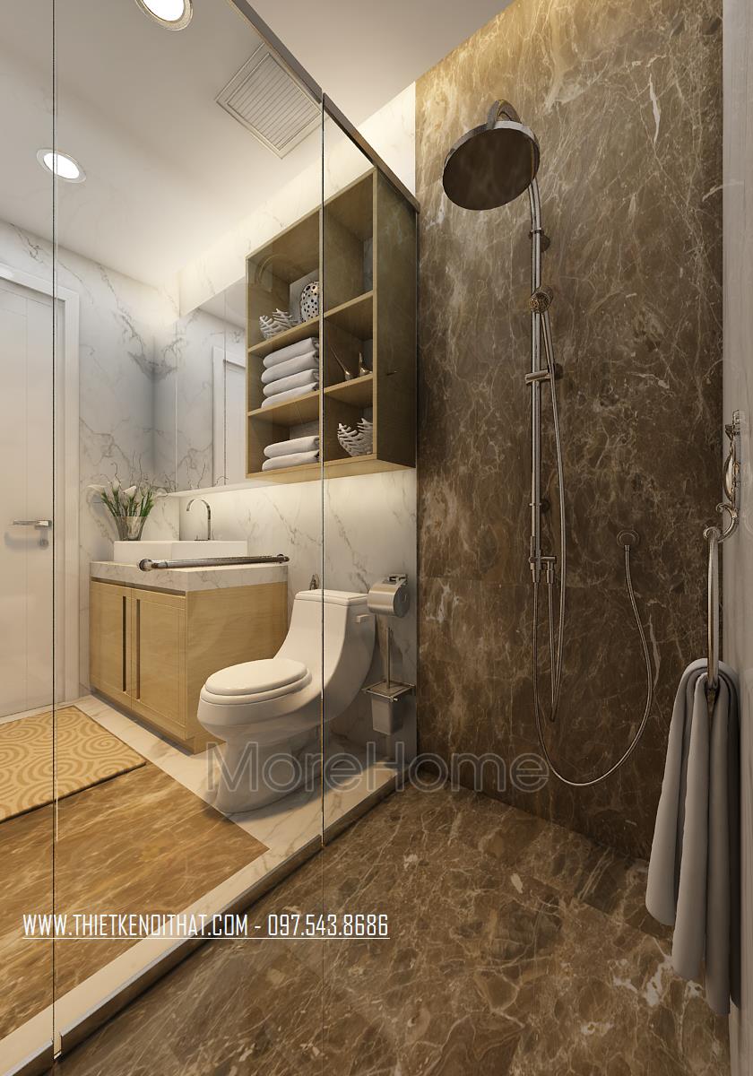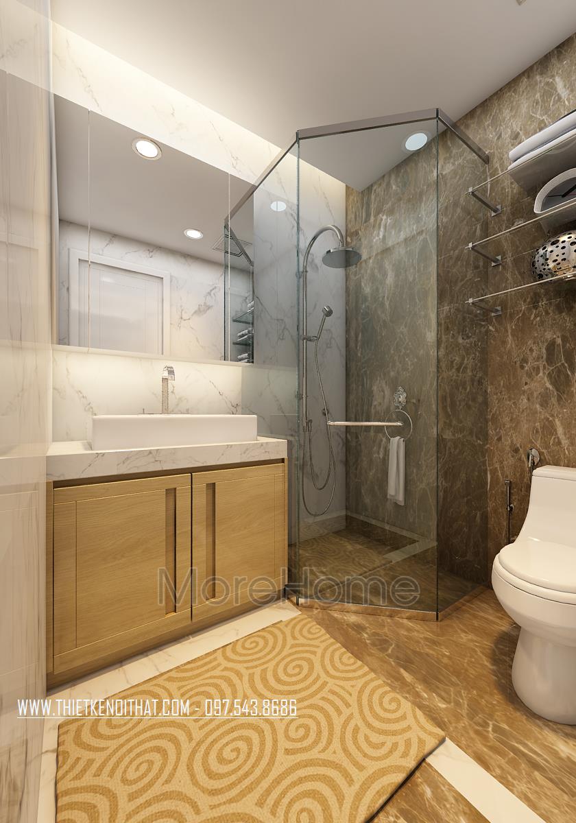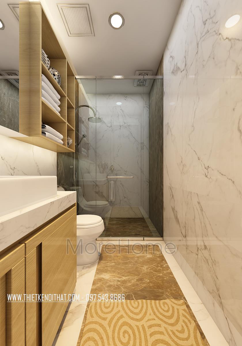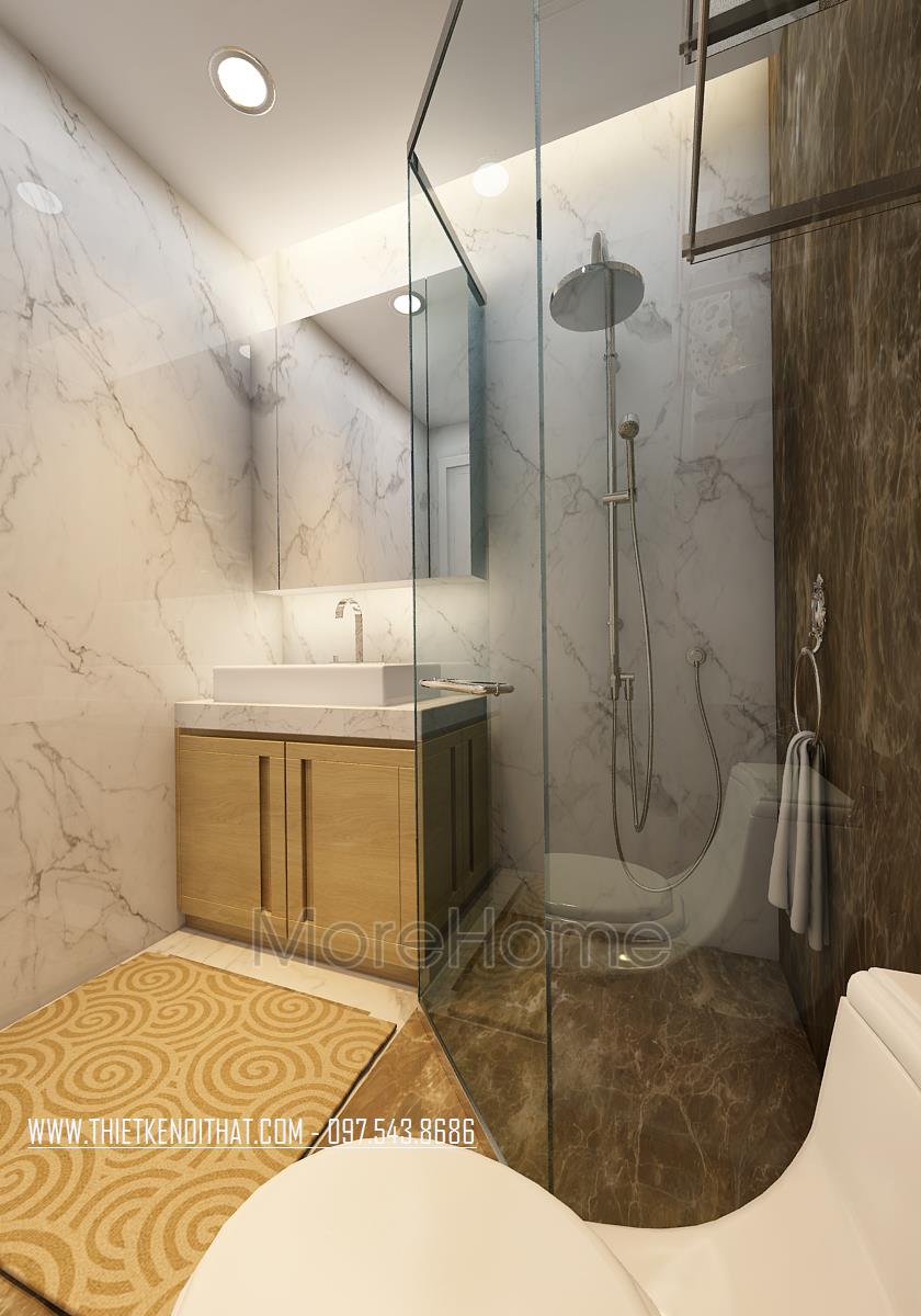 Cuối cùng là không gian thiết kế nội thất phòng tắm hiện đại. Thiết kế khá thu hút bởi kiến trúc sư đã sử dụng các vật liệu mát như đá tự nhiên và kính cường lực. Các vật liệu này là mấu chốt giúp mang lại một không gian thoáng và thư giãn cho căn phòng hẹp này. Độ phản chiếu nhẹ nhàng từ kính và gương giúp mang lại cảm giác cơi nới cho căn phòng, xóa tan sự bí bách, khó chịu.