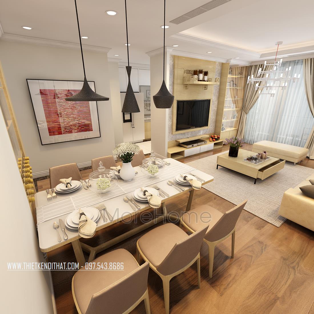 Tiếp theo là thiết kế nội thất không gian bàn ăn hiện đại. Không gian thiết kế được sắp xếp khá giản đơn với bộ bàn ghế nhỏ, không hề nhấn mạnh vào các chi tiết trang trí những thiết kế khá ấn tượng nhờ vào tính công năng. Thiết kế tủ gỗ kính trong suốt đa ngăn vừa đảm bảo tính công năng lại giúp không gian trở nên ấn tượng hơn, tạo điểm nhấn trong thiết kế. Ngoài ra, các chi tiết trang trí nhẹ nhàng như đèn chiếu sáng, tranh treo tường sáng tạo giúp không gian trở nên ấn tượng và thu hút hơn rất nhiều. Bàn ăn được đặt gọn gàng, thiết kế linh hoạt, dễ dàng biến thu gọn, mở ra không gian đa năng giúp tăng mục đích sử dụng cho không gian chung cư hẹp.
