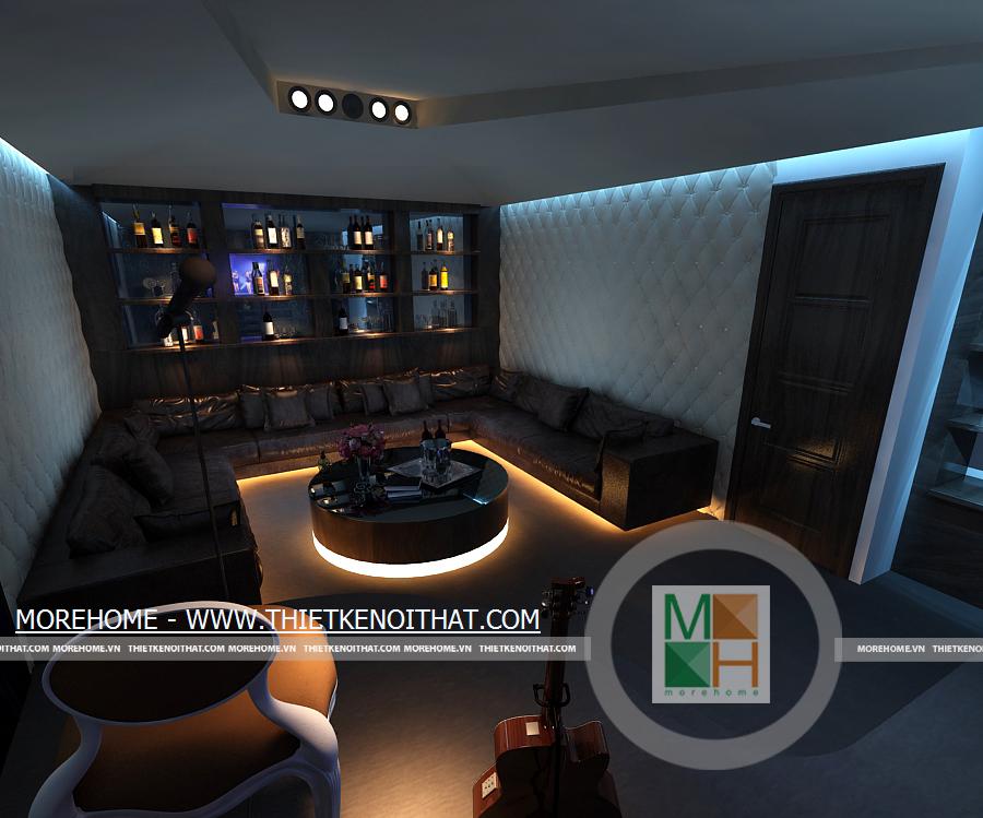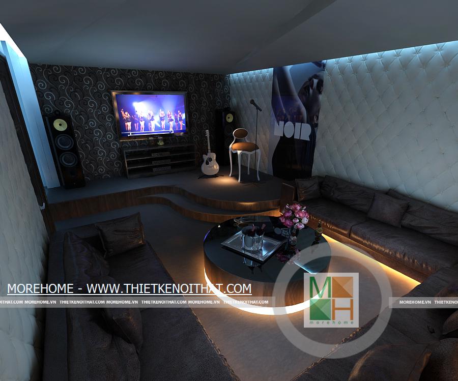 Vị trí của phòng karaoke được lựa chọn dưới tầng hầm, phù hợp để không ảnh hưởng tới các không gian sinh hoạt khác của gia đình. Ngoài ra, căn phòng cũng được xử lí cách âm tốt bằng các vật liệu như xốp, mút, bông thủy tinh… Hệ thống chiếu sáng được thiết kế hợp lí để phù hợp với từng lúc, từng đối tượng sử dụng.