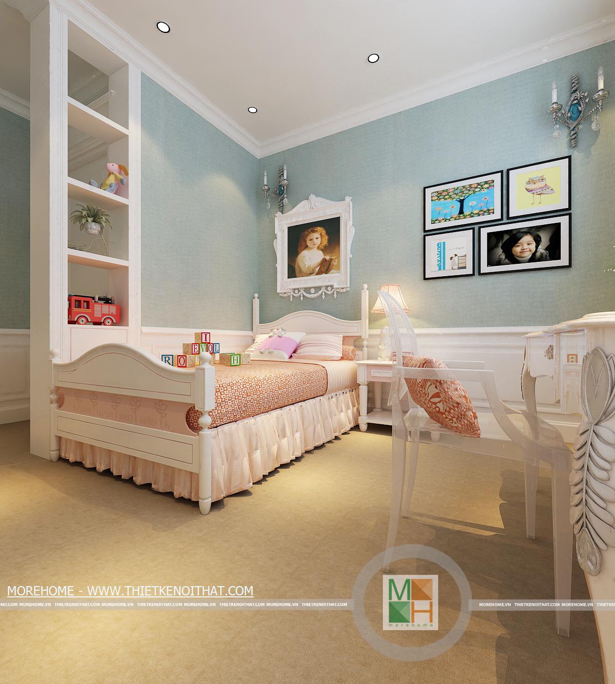 Phòng ngủ con gái thì sử dụng tông màu hồng nhạt với vách ngăn được kết hợp làm design và giá để đồ chơi. Góc học tập được kê sát cửa sổ với phần rèm cửa màu hồng cùng tông với màu căn phòng.