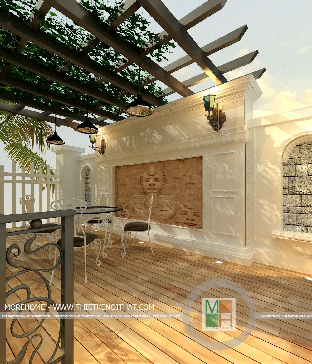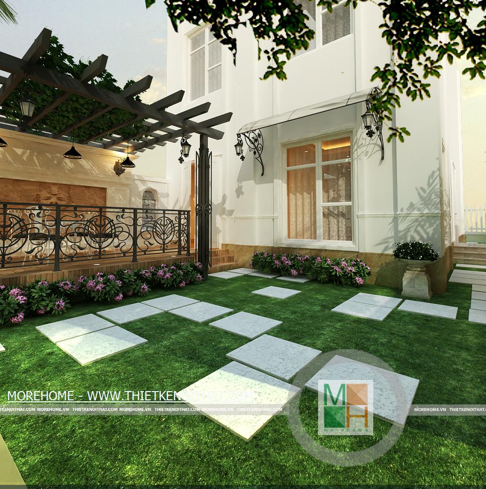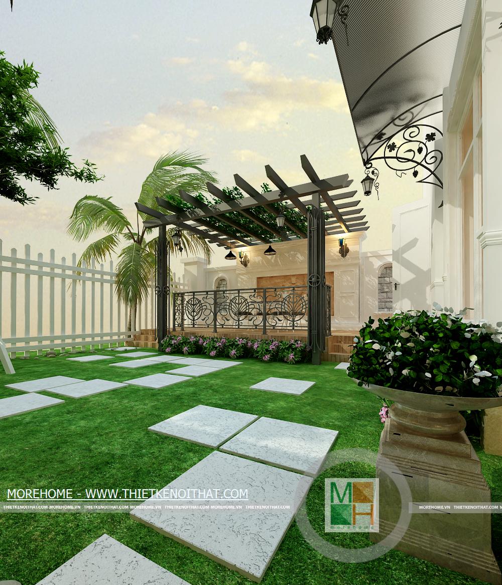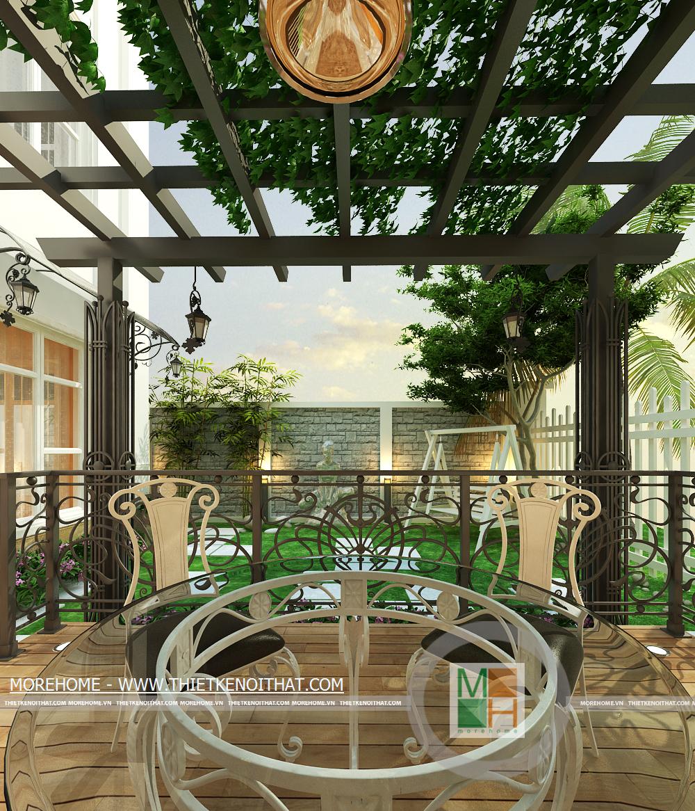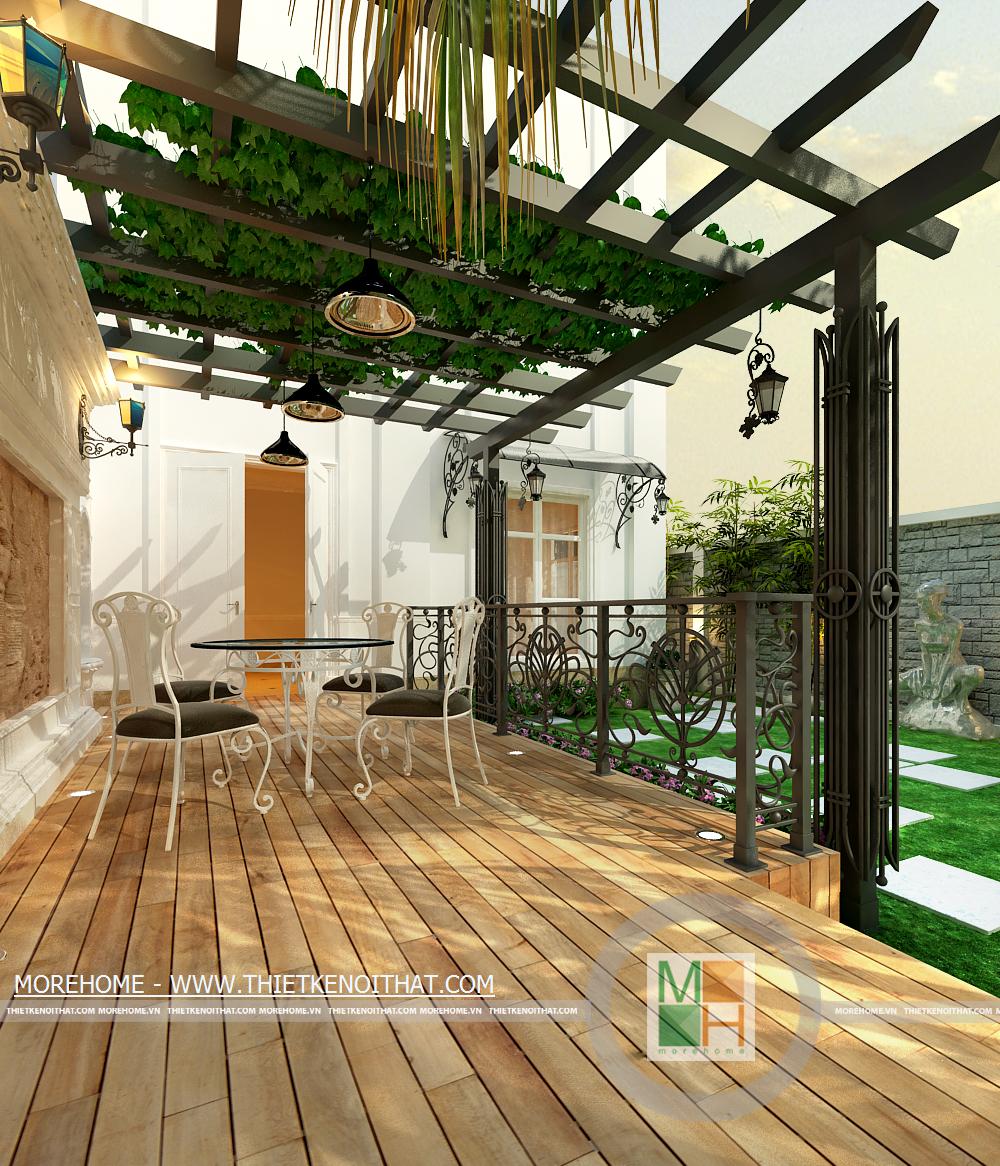 Khu vườn ở sân sau có diện tích tương đối lớn so với tổng thể. Chính nhờ ưu điểm về diện tích nên các kiến trúc sư đã tập trung ưu tiên cho các hoạt động ngoài trời. Các chi tiết cổ điển được khéo léo bài trí qua các cột thép, lan can hoa sắt nghệ thuật, giàn cây leo tạo bóng mát… không những thế mặt sân sử dụng chất liệu gỗ ngoài trời còn cho ta có cảm giác như đang được chiêm ngưỡng một khu resort cao cấp. Bộ bàn ghế nghỉ cũng được lựa chọn tinh tế để tạo ra sự tương phản với lan can, cột để không gian sinh động hơn.