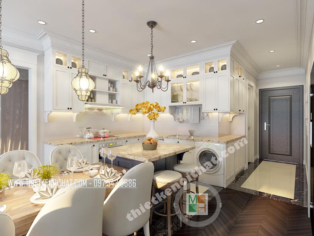 Thiết kế phòng bếp và phòng ăn liền kề tạo sự đồng nhất về mặt không gian cho căn nhà mang đến sự gần gũi cho gia chủ. Điểm mới lạ trong thiết kế bếp đó là sự kết hợp khéo léo của chiếc máy giặt mang đến sự tiện nghi tối ưu cho căn nhà và mang đến một không gian sống thoải mái cho gia chủ.
