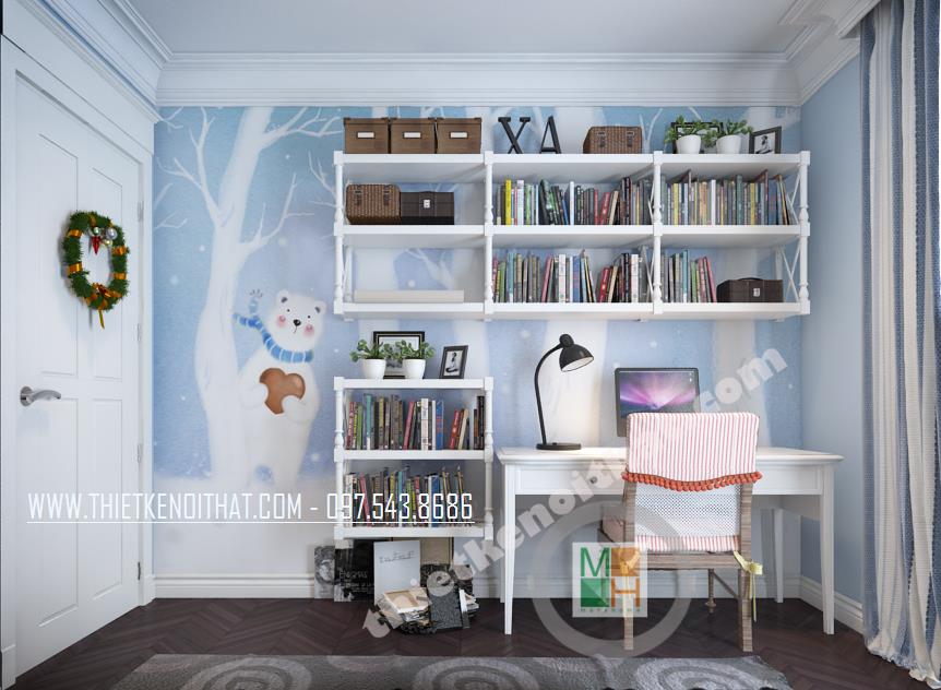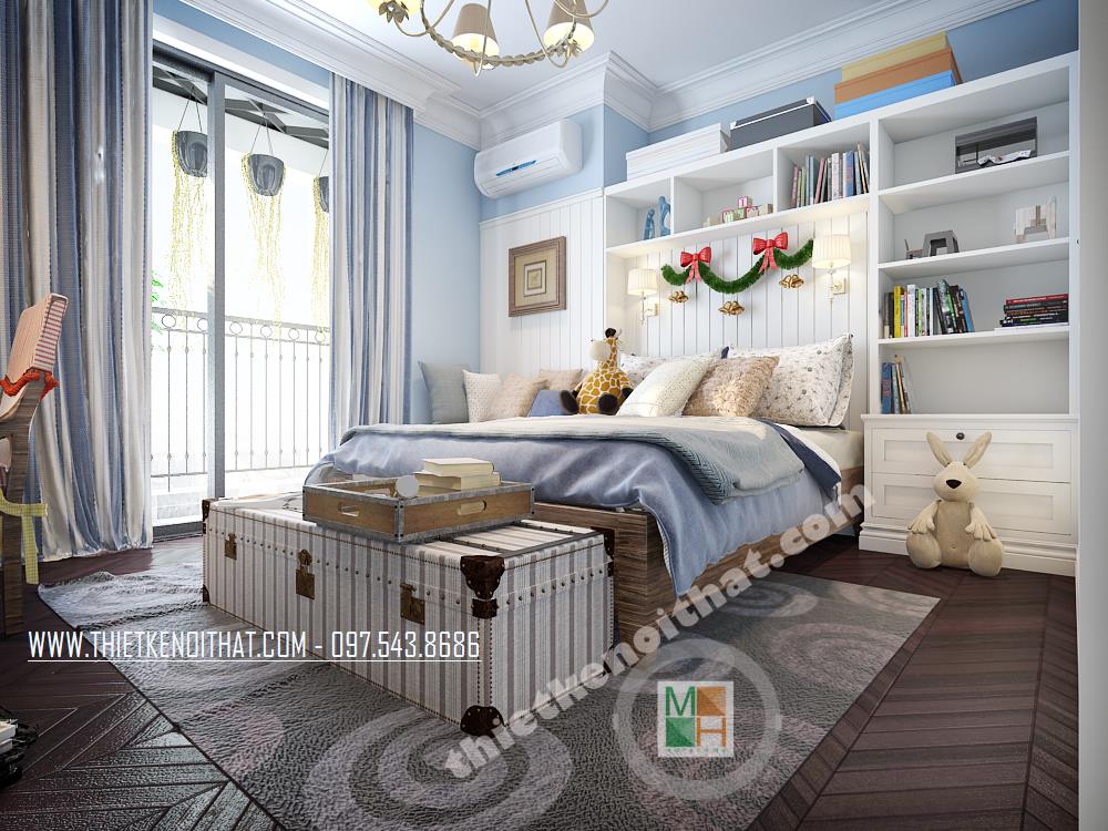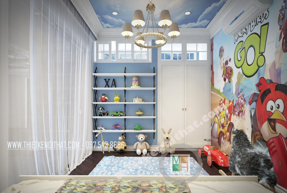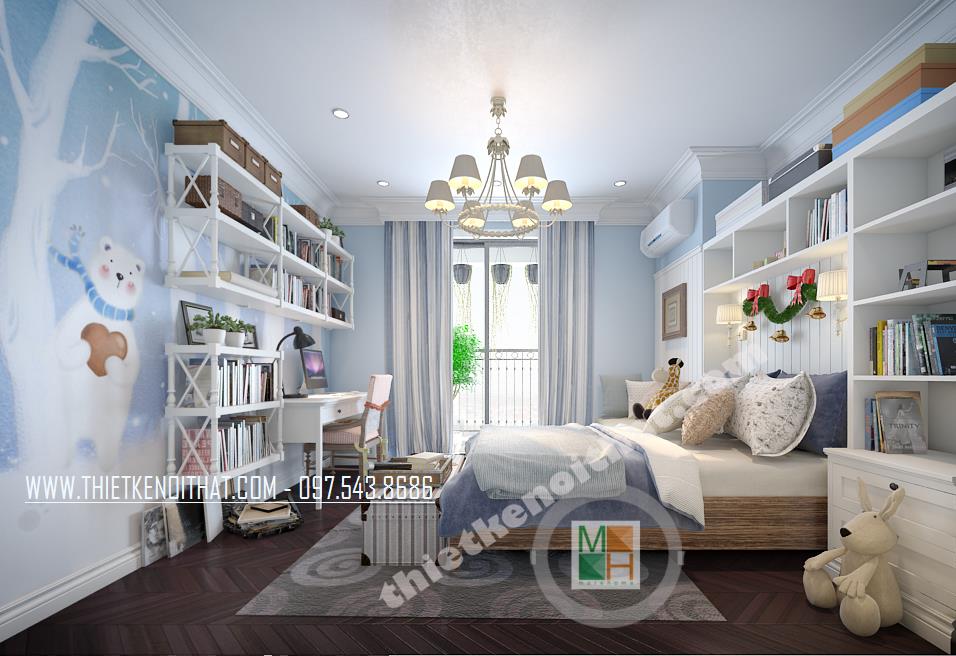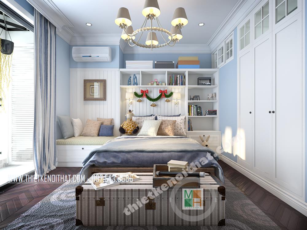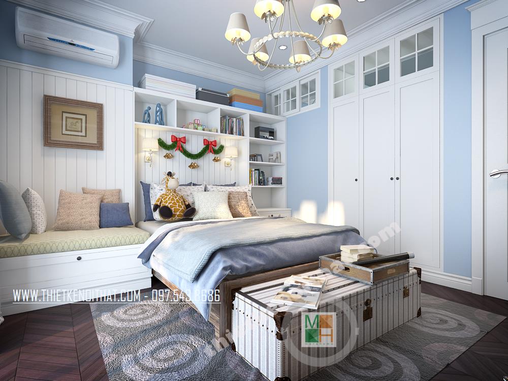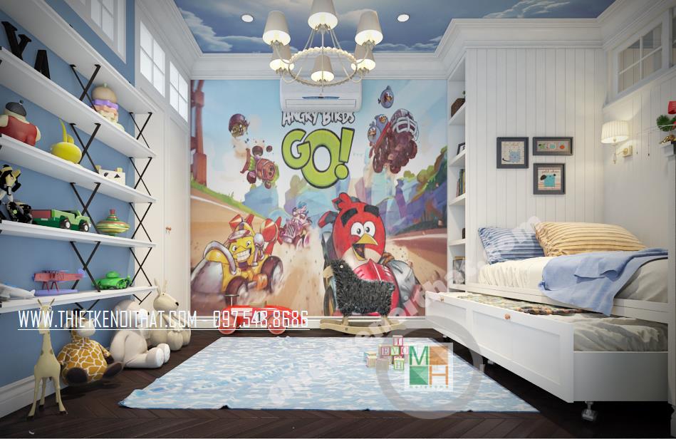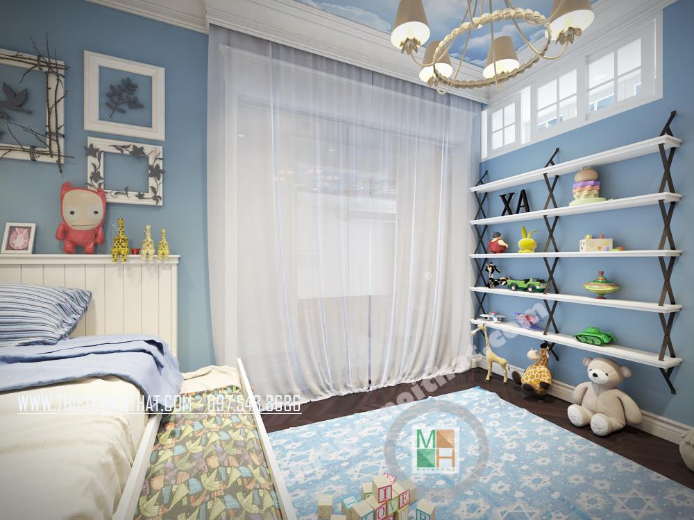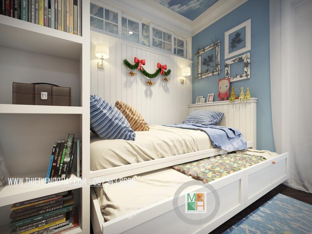 Căn phòng ngủ thứ hai được thiết kế dành riêng cho trẻ nhỏ. Màu xanh da trời nhẹ mang đến cảm giác bình yên và thư thái. Ngoài ra, cách bố trí sáng tạo và các vật dụng trang trí cách điệu làm không gian trở nên “năng động”, góp phần khơi gợi sự sáng tạo cho trẻ nhỏ. Các bức tường và trần nhà sử dụng giấy dán tường với màu sắc và chi tiết vui tươi chính là điểm nhấn mang lại sự thú vị cho căn phòng.