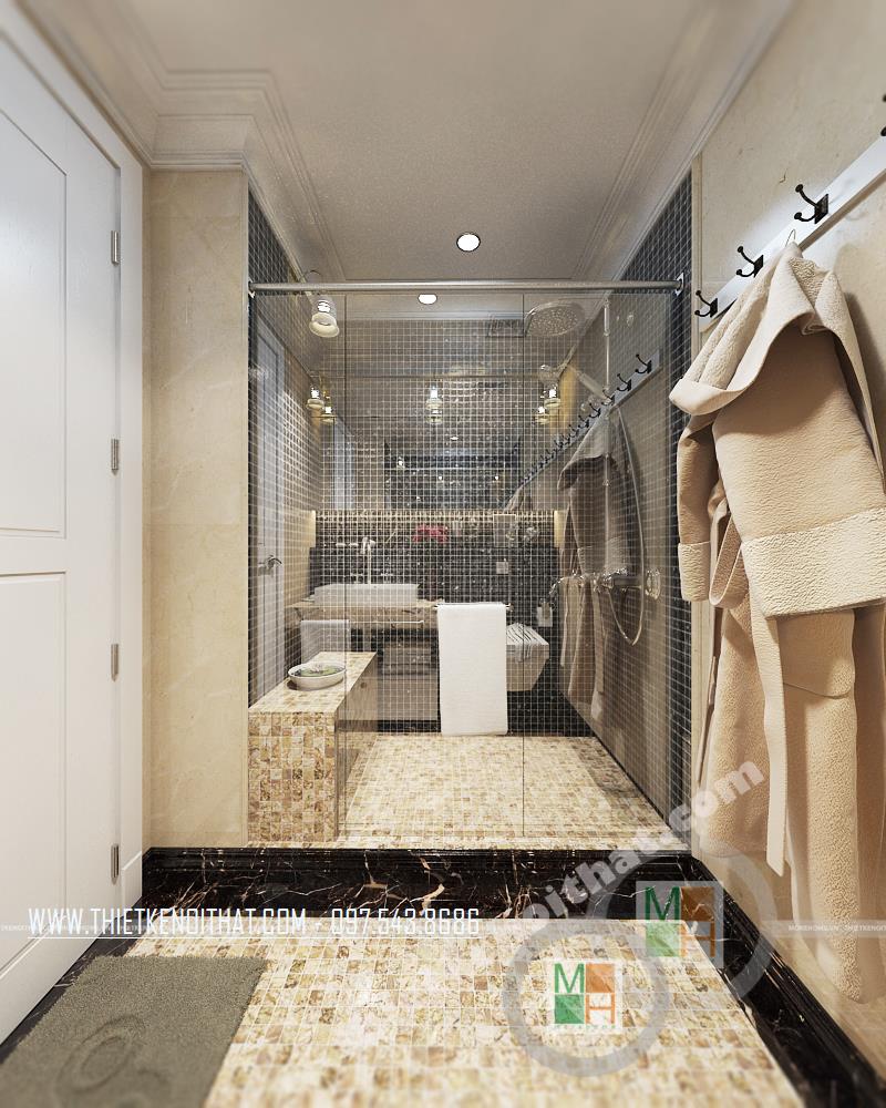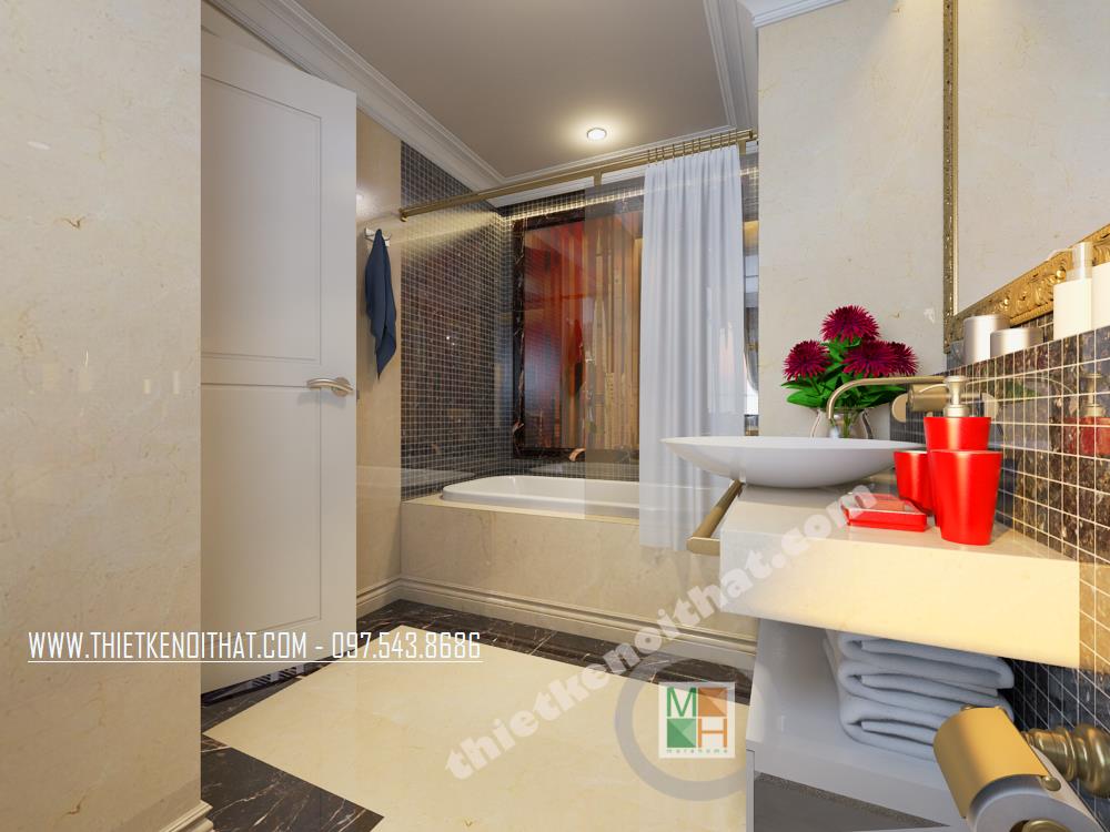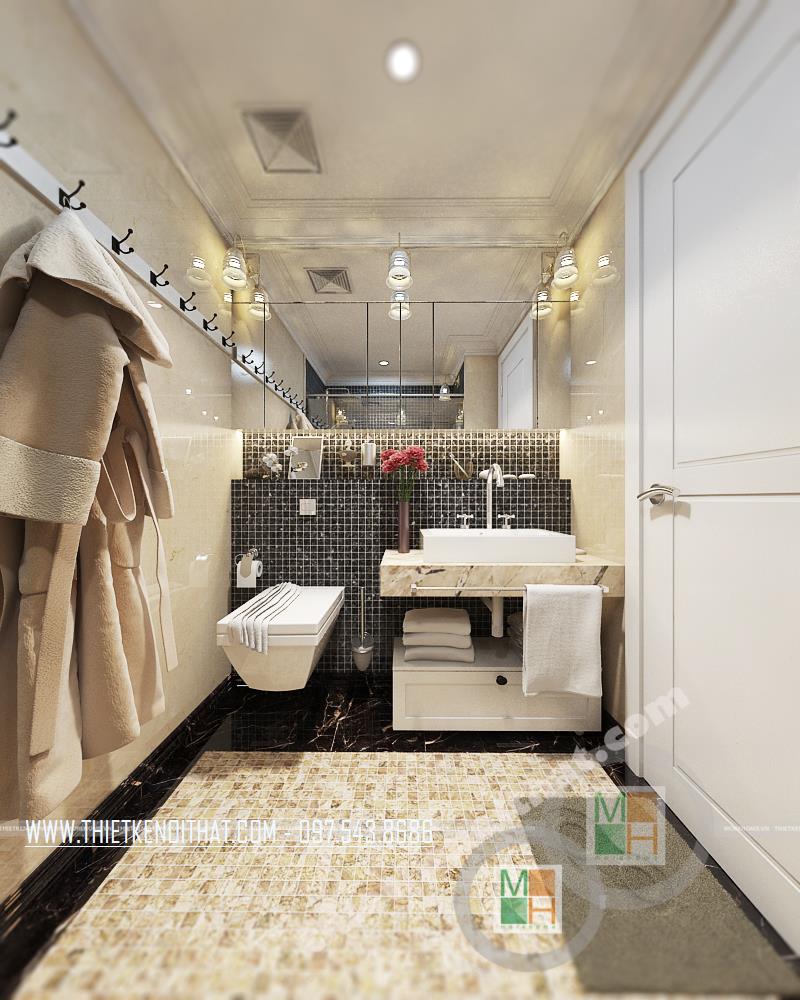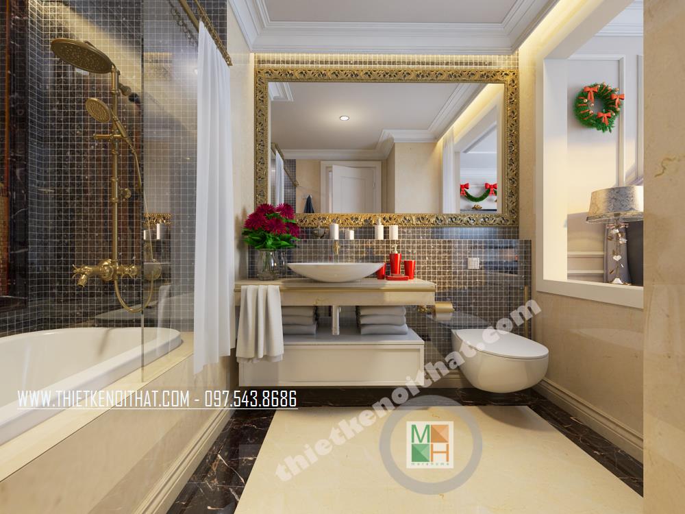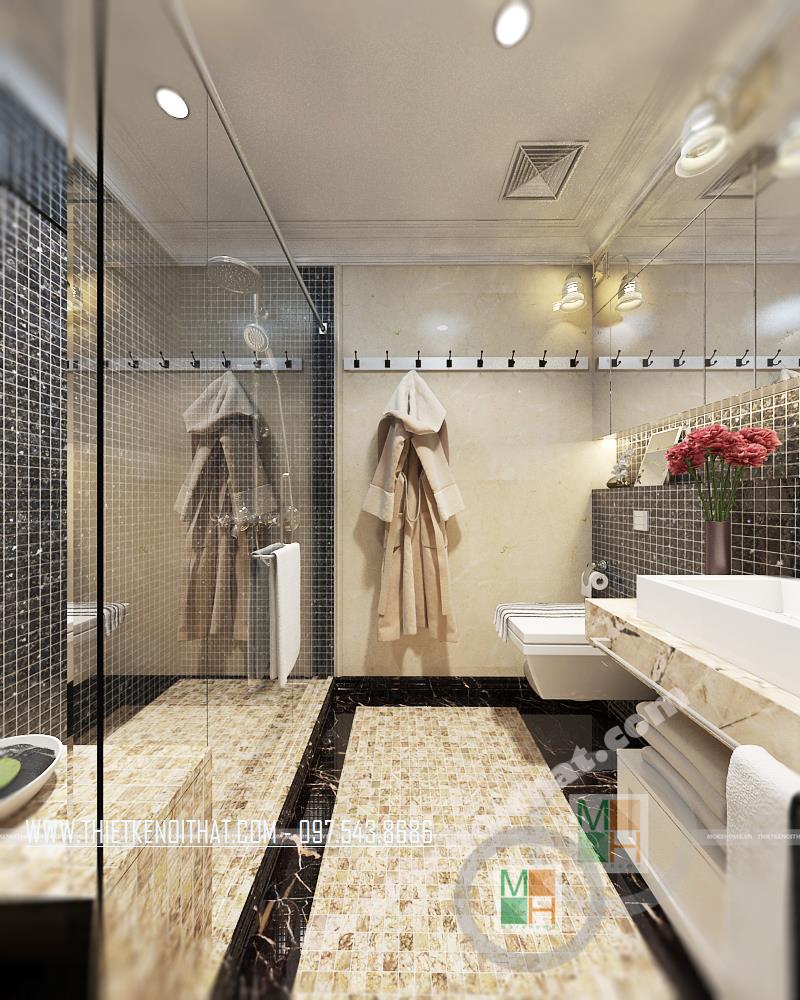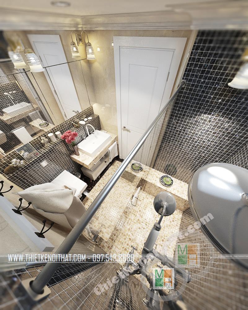 Thiết kế phòng tắm thu hút và cầu kỳ. Các vật liệu nhẹ như gương và kính cường lực được sử dụng để tạo độ phản chiếu trong không gian nhỏ hẹp, từ đó diện tích căn phòng dường như được mở rộng khá nhiều. Ngoài ra, các chi tiết trang trí nhỏ trên gương hay trên tường tạo không gian trang trí tinh tế và mềm mại cho căn phòng.