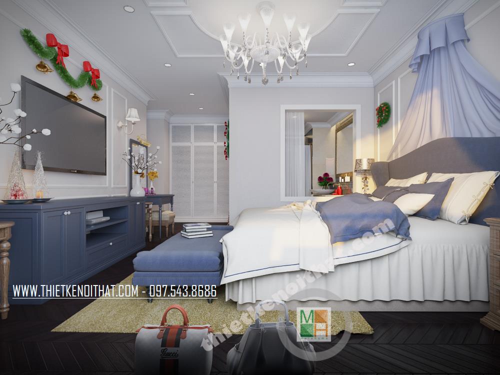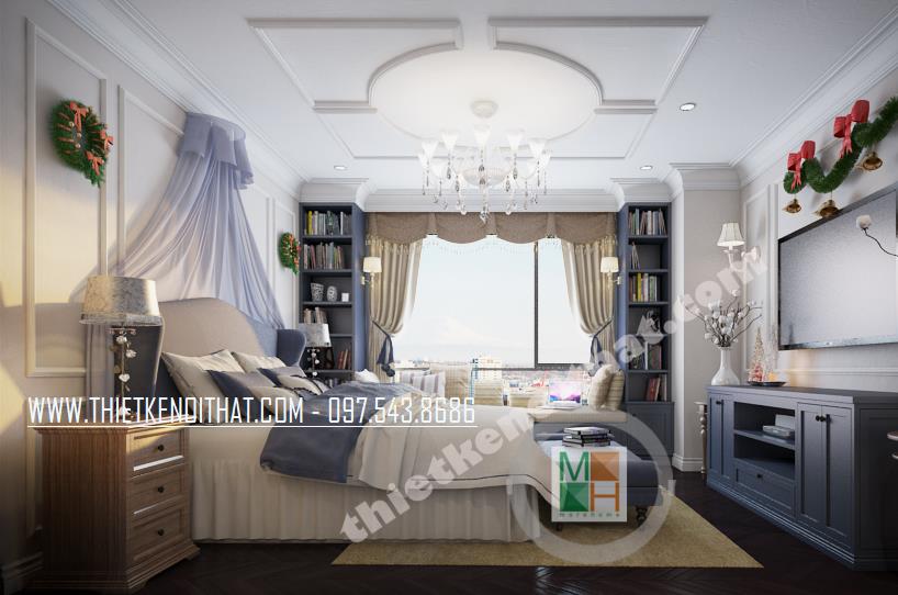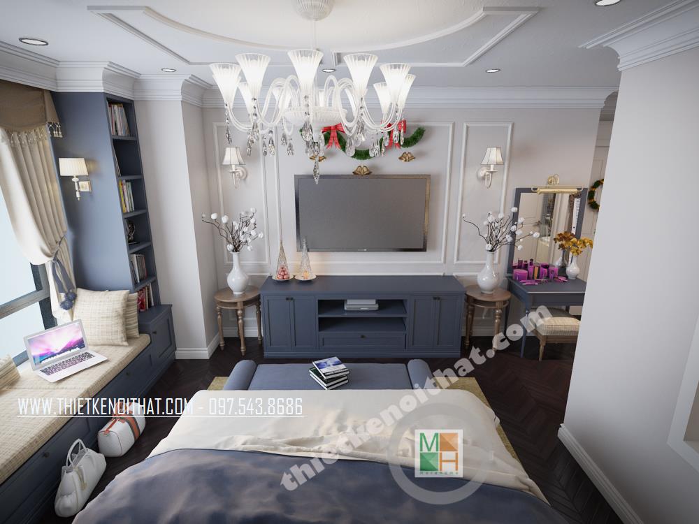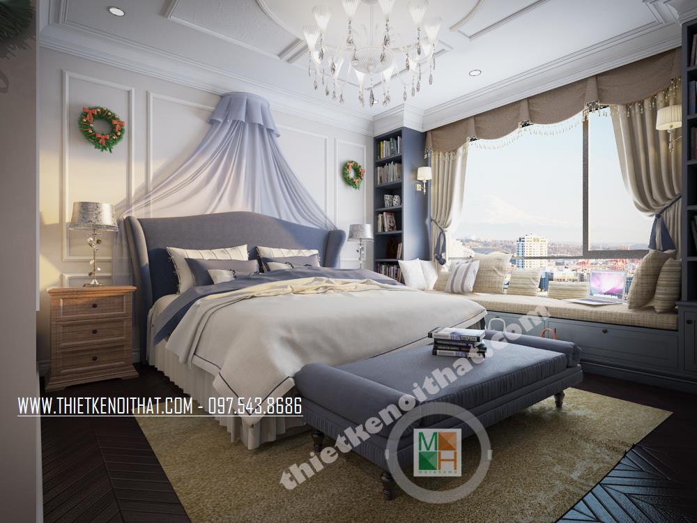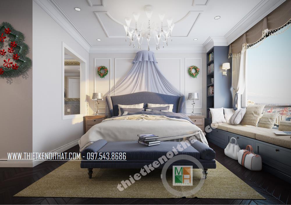 Thiết kế phòng ngủ mang phong cách tân cổ điển sáng tạo. Khung cửa sổ rộng được tận dụng làm không gian đọc sách tiện nghi và thư giãn. Tông màu xanh tối được khéo léo kết hợp với màu nền trắng mang đến cảm giác hài hòa và trang nhã cho căn phòng. Bên cạnh đó, để khắc phục nhược điểm về mặt diện tích của căn phòng, kiến trúc sư đã bố trí những tâm gương lớn tạo độ phản chiếu và tạo độ mở cho không gian.