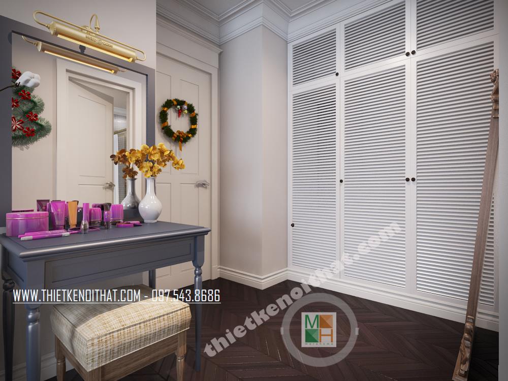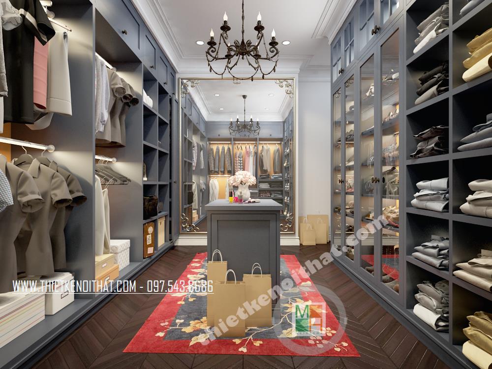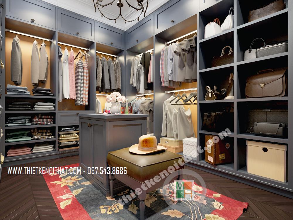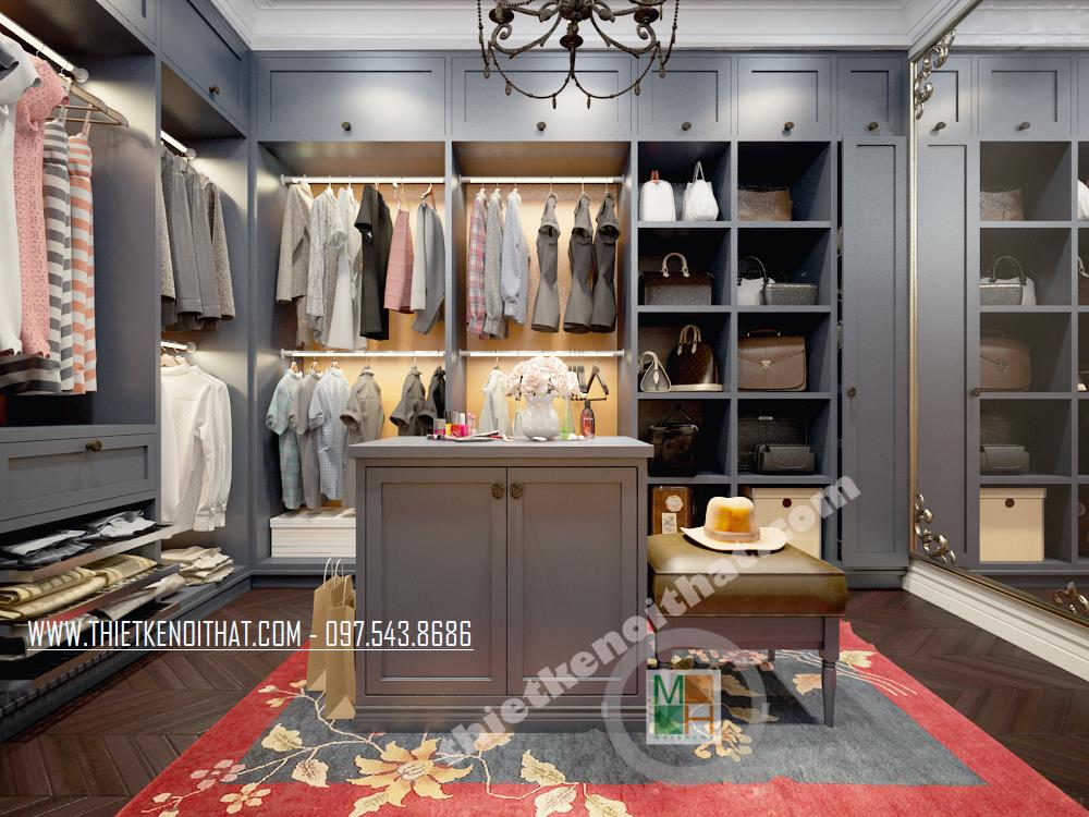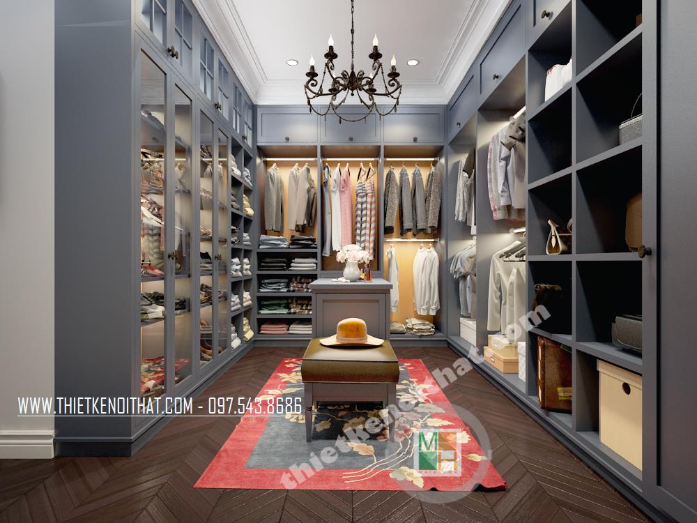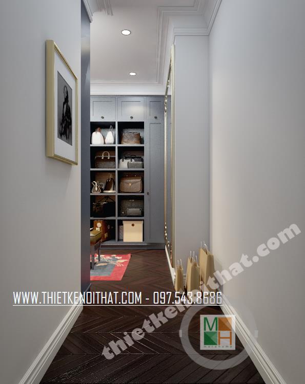 Với các thiết kế chung cư cao cấp hiện đại, không gian phòng thay đồ là nơi không thể thiếu được. Hiểu một cách đơn giản, đây là không gian nhà kho đơn giản giúp bạn sắp xếp và bố trí đồ đạc từ quần áo, giày dép đến các thiết bị gia đình chưa dùng tới. Điểm quan trọng nhất trong thiết kế không gian này chính là phải làm sao để tối ưu hóa sự tiện nghi mà vẫn không làm căn phòng trở nên bí bách và ngột ngạt của một nhà kho thông thường. Để khắc phục điều đó, một tấm gương lớn đã được kiến trúc sư bố trí, từ đó vẫn giữ được yếu tố thẩm mỹ và tạo cảm giác mở rộng không gian. Hệ thống tủ kệ được thiết kế dọc hai bên phòng mang đến sự tiện nghi cho gia chủ.