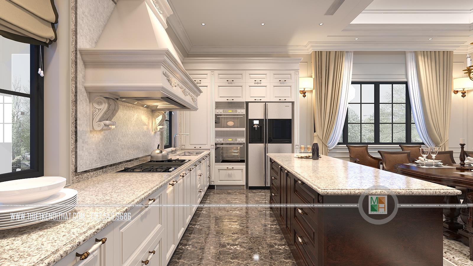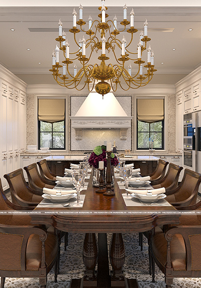 Vì không muốn thiết kế phòng khách và phòng ăn liền kề nhau nên khi đến đây, từ phòng khách bạn phải đi ra phía hành lang 1 đoạn ngắn để đến phòng khách được nằm yên tĩnh, kín đáo tại 1 góc trong. Phòng ăn và phòng bếp liền kề nhau được thiết kế thật lung linh và rực rỡ. Tại đây, hầu hết nội thất đều được làm từ gỗ tự nhiên cao cấp, toát lên vẻ đẹp đẳng cấp, thời thượng. Trong đó, tương phản với màu trắng sứ của hệ thống tủ bếp là kệ tủ và bàn ghế ăn màu nâu sang chảnh. Ngoài chiếc bàn ăn bằng gỗ với 4 chiếc ghế bành lớn 2 bên và bàn ăn hình bầu dục lượn cong ở các góc thì ở 1 góc tường cạnh đó, gia chủ còn lắp đặt 1 bộ bàn ghế nữa với chiếc bàn nhỏ và 2 ghế bành 2 bên, rất tiện lợi trong sinh hoạt.
