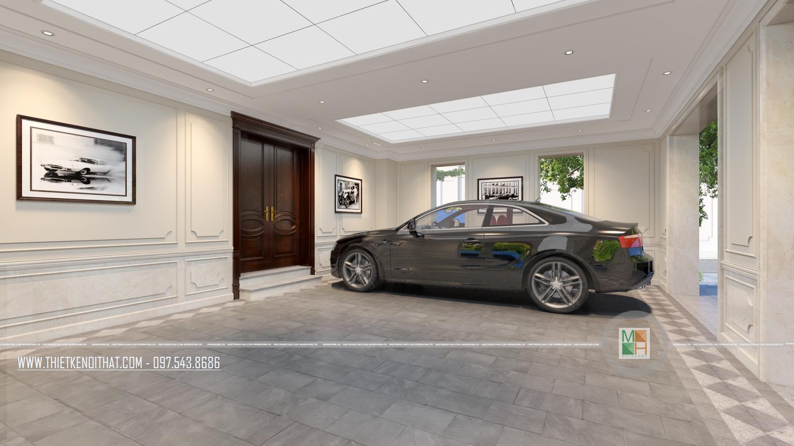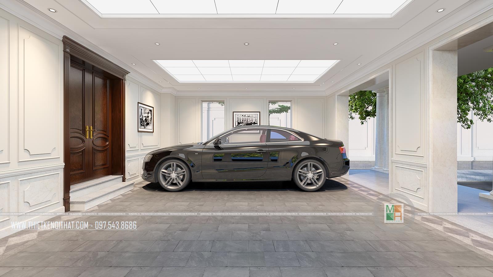 Tầng trệt cuối cùng của căn biệt thự là gara để ô tô và được gia chủ thiết kế khá bắt mắt, rộng rãi. Nó cũng có thể dùng làm nhà kho hay khu vực chứa đồ cũng khá hợp lý.