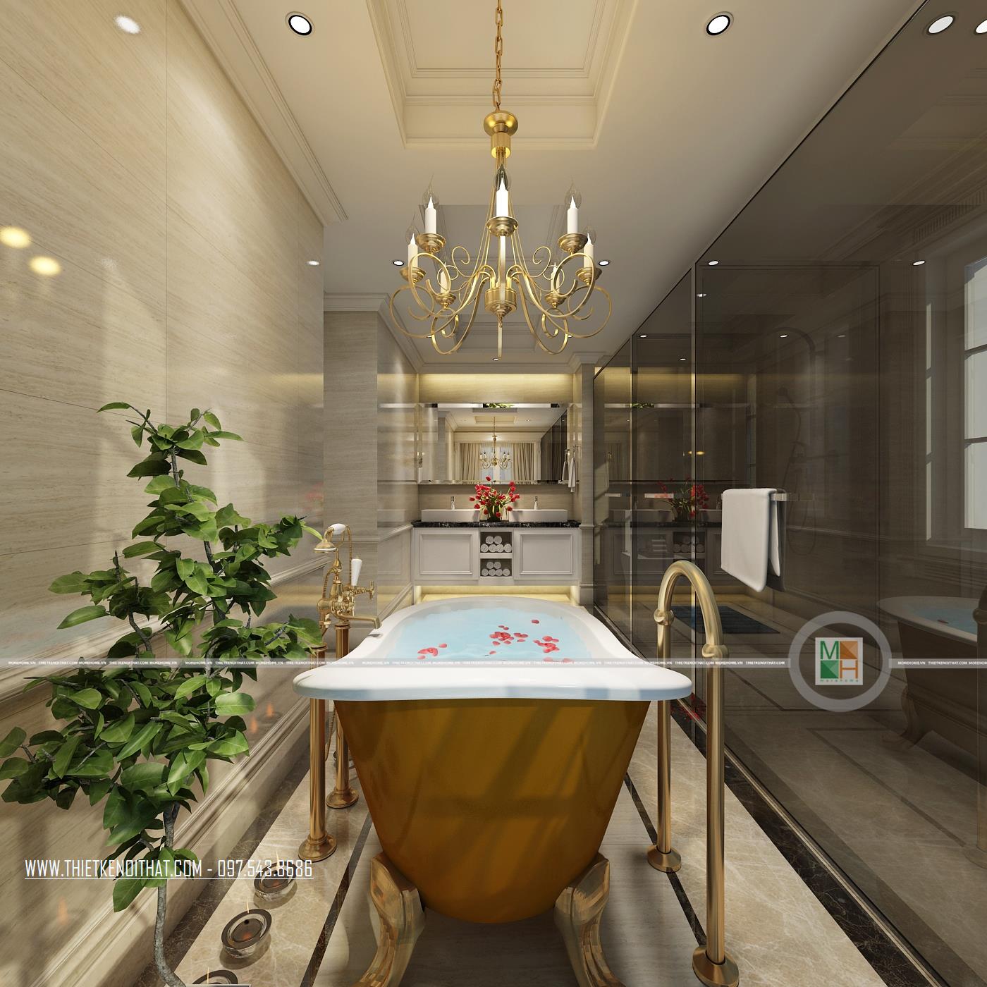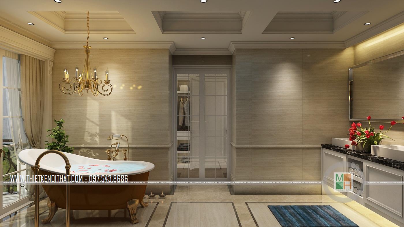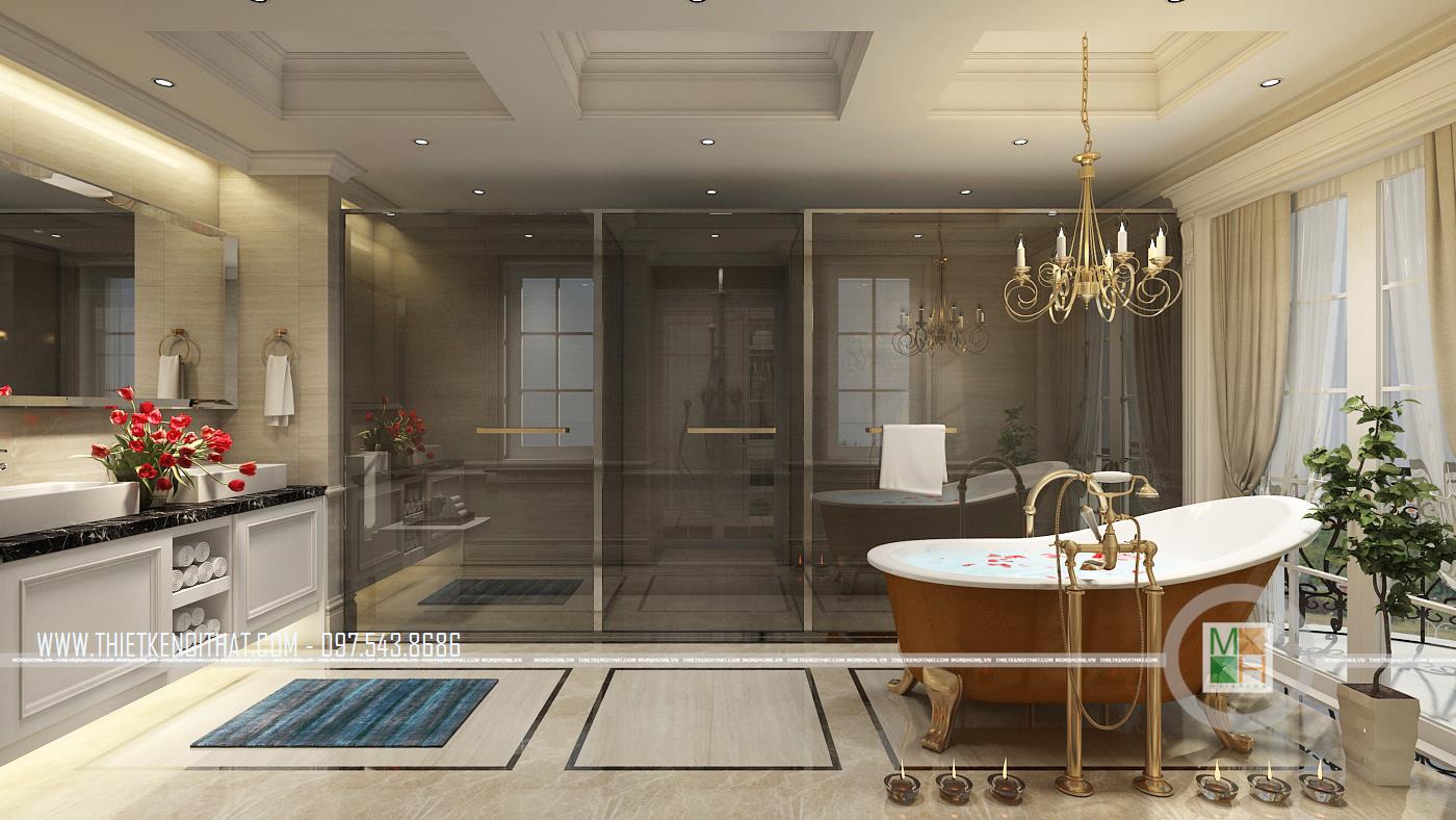 Nói đến phòng vệ sinh của căn biệt thự là nói đến sự cầu kì trong từng chi tiết của các mẫu nội thất. Từ hệ thống đèn, bồn tắm đến gương soi, bồn rửa mặt, tủ kệ đựng đồ đều có vẻ đẹp lung linh đến hoàn hảo. Gia chủ chắc hẳn cũng là người yêu thiên nhiên khi đã trang trí cả cây xanh và hoa tươi trong không gian này, khiến phòng tắm đã lung linh lại càng thêm lãng mạn. Bên cạnh đó, để tạo sự sạch sẽ, khô thoáng và pha chút hiện đại cho phòng tắm, gia chủ đã chọn phương án lắp đặt vách tắm kính.