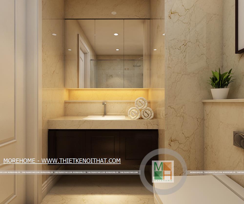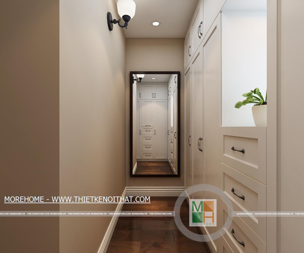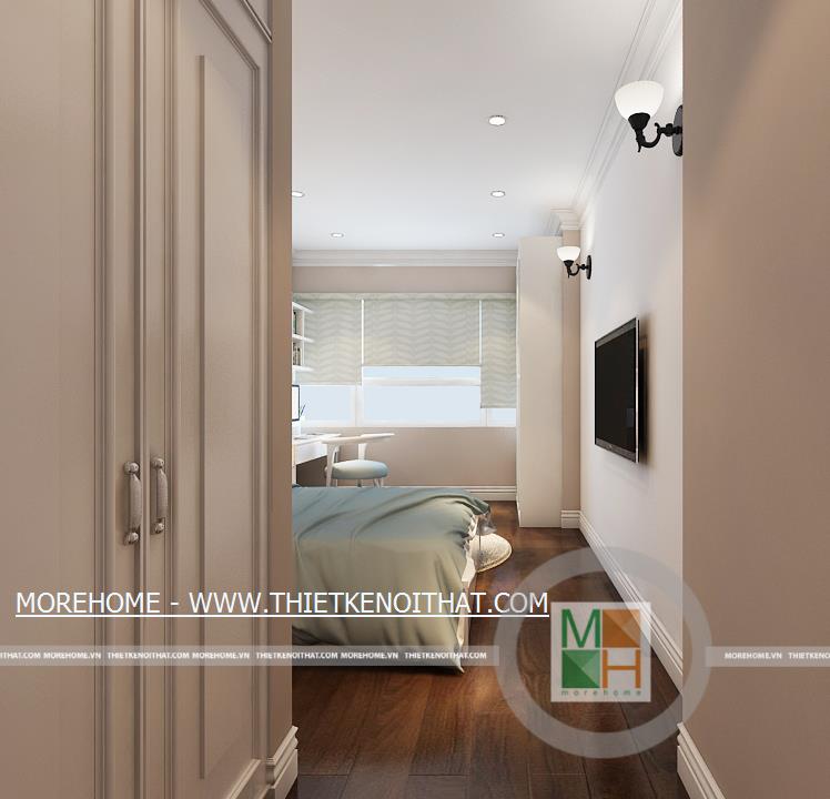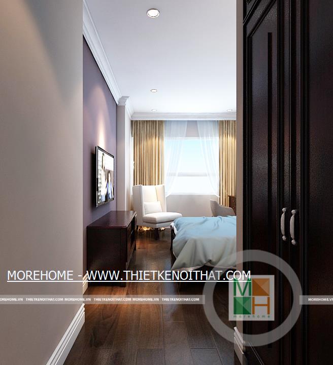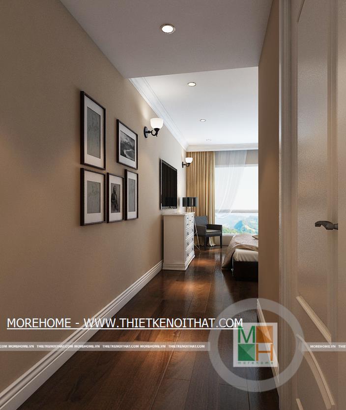 Phòng ngủ master có lối đi lại dài và rộng, trên tường còn được trang trí một vài bức tranh cổ điển. Phía trong là khu vực thay đồ, ở đây có một cửa sổ nhỏ giúp cho không khí thêm thoáng đãng hơn. Không gian phòng ngủ master rộng rãi thoáng đáng với ánh sáng tự nhiên từ hệ thống cửa sổ lớn. Bên cạnh cửa sổ được đặt một bàn làm việc nhỏ, đối diện với bàn làm việc là kệ sách lớn được kê ốp sát vào tường. WC master với nội thất tiện nghi và đầy đủ, toàn bộ tường và sàn nhà đều được ốp đá, trên tường còn được trang trí bằng một bức tranh cùng một vài chậu cây nhỏ.