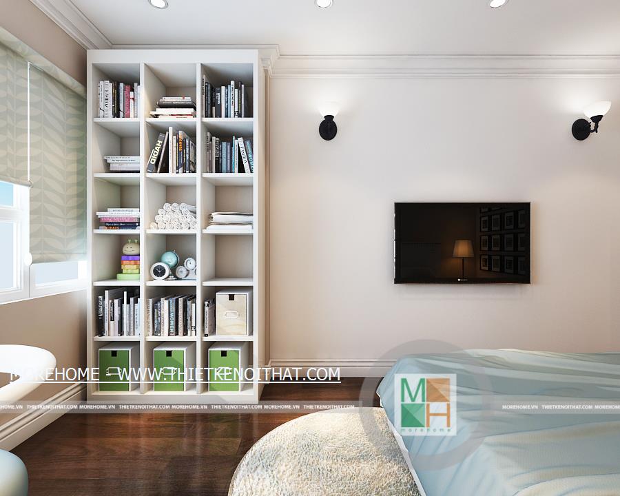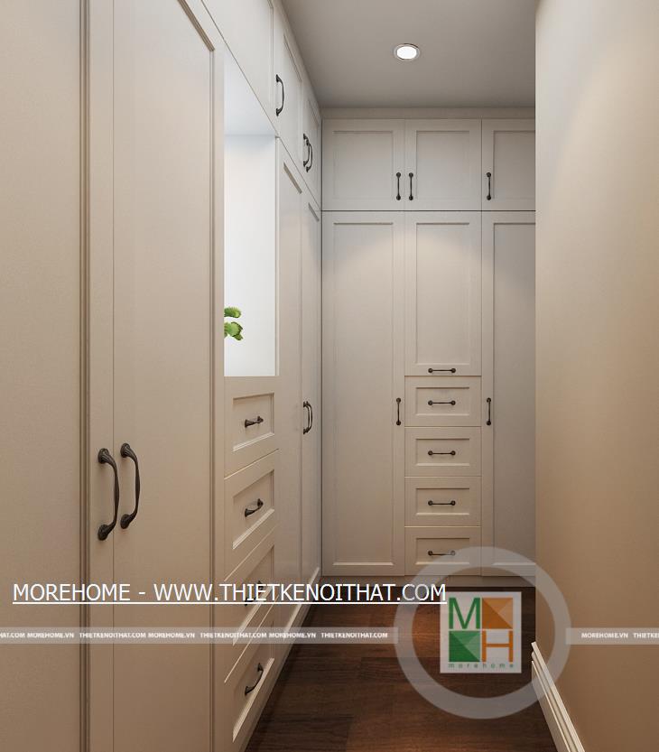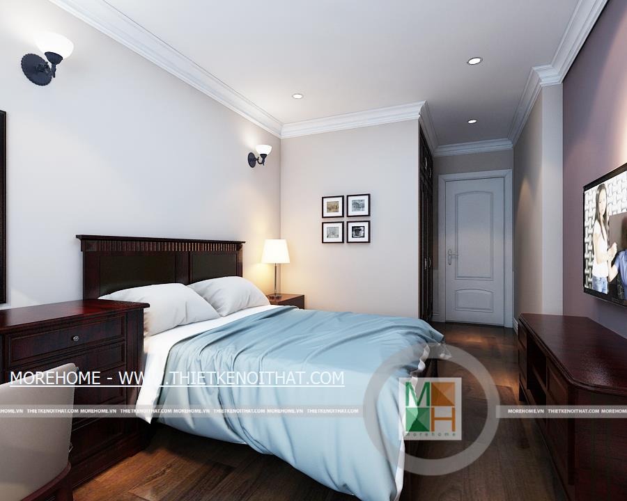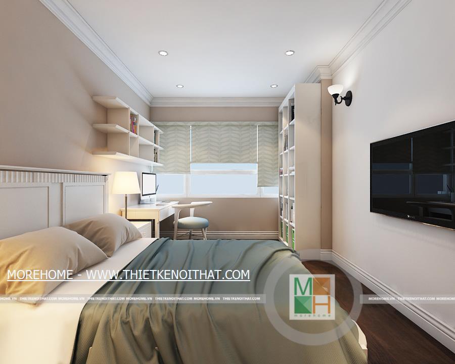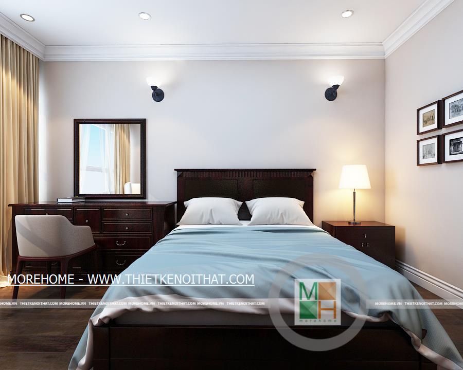 Phòng ngủ master có lối đi lại dài và rộng, trên tường còn được trang trí một vài bức tranh cổ điển. Phía trong là khu vực thay đồ, ở đây có một cửa sổ nhỏ giúp cho không khí thêm thoáng đãng hơn. Không gian phòng ngủ master rộng rãi thoáng đáng với ánh sáng tự nhiên từ hệ thống cửa sổ lớn. Bên cạnh cửa sổ được đặt một bàn làm việc nhỏ, đối diện với bàn làm việc là kệ sách lớn được kê ốp sát vào tường. WC master với nội thất tiện nghi và đầy đủ, toàn bộ tường và sàn nhà đều được ốp đá, trên tường còn được trang trí bằng một bức tranh cùng một vài chậu cây nhỏ.