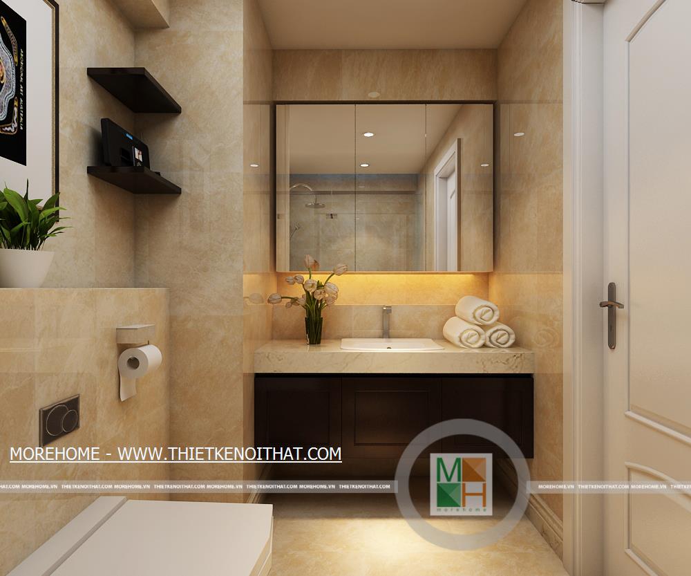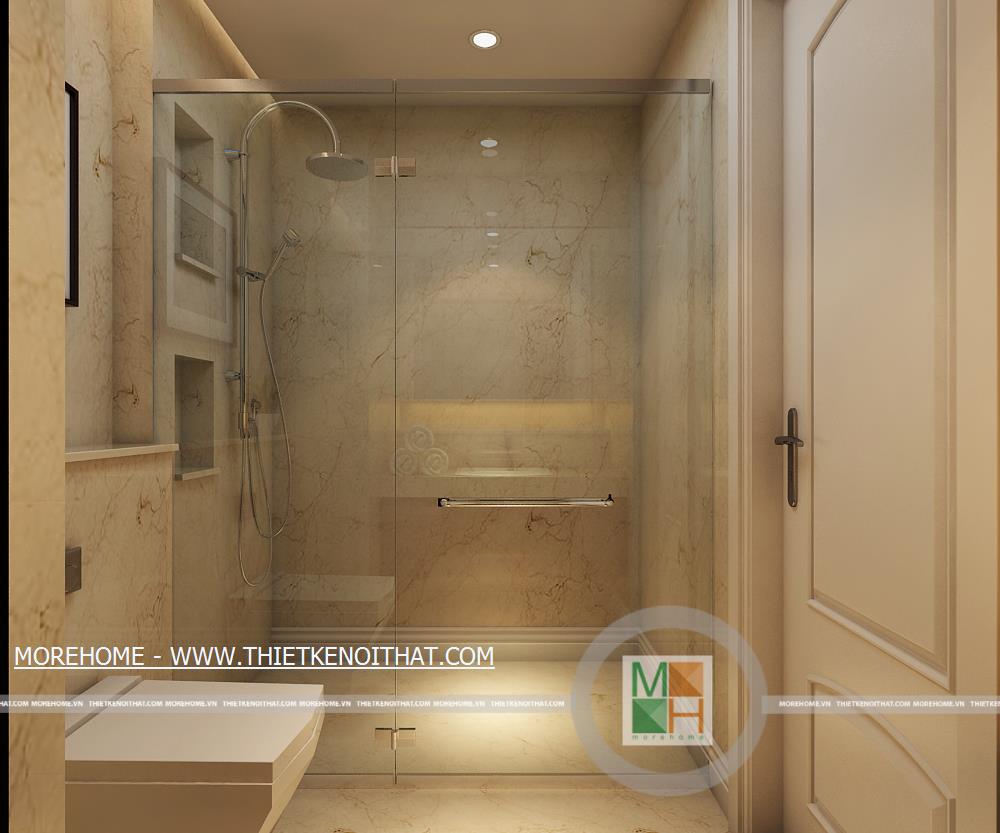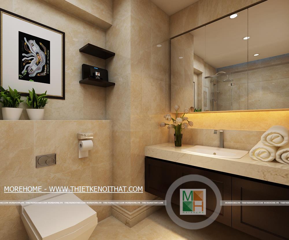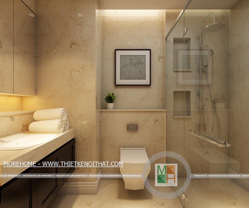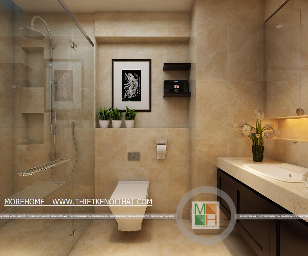 WC chung có tường và sàn nhà hoàn toàn được ốp đá tự nhiên, không gian thoải mái và sạch sẽ, trong phòng còn đặt một cây xanh nhỏ tạo sự thân thiện. Buồng tắm lớn được ngăn cách với bên ngoài bằng một lớp kính dày.