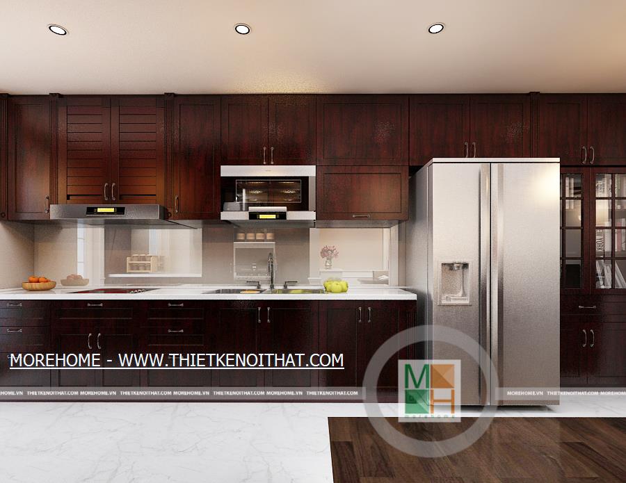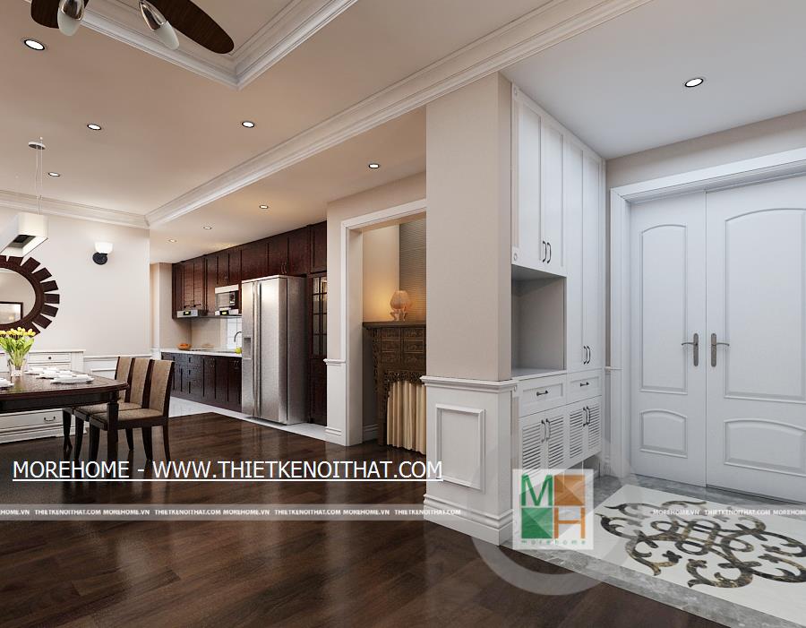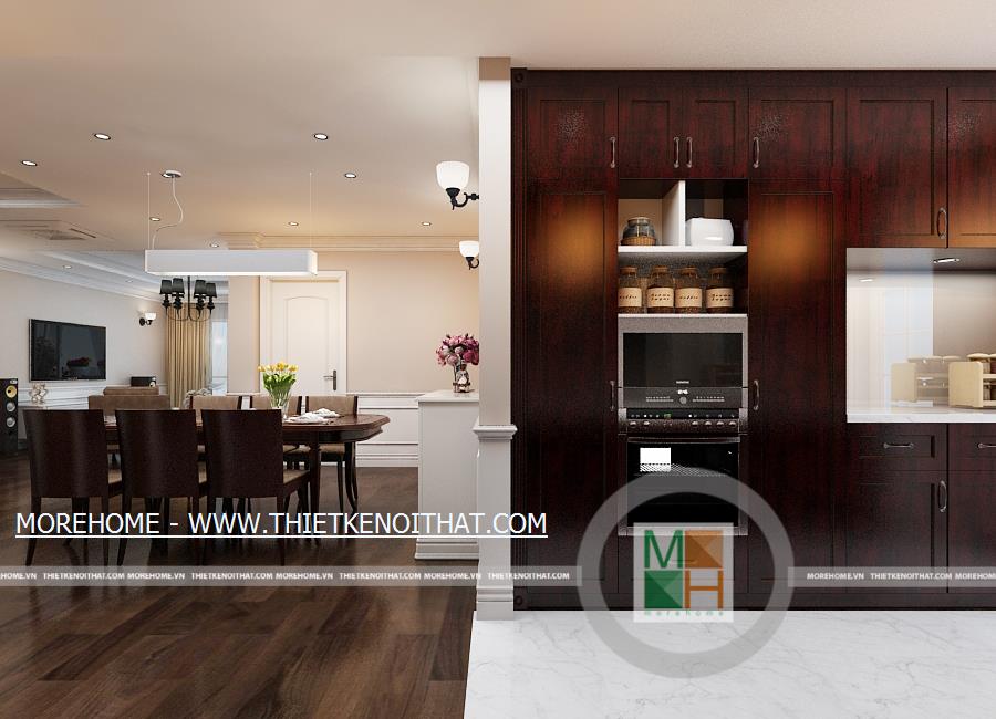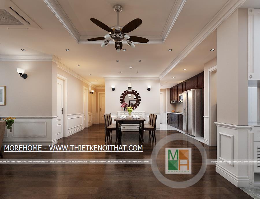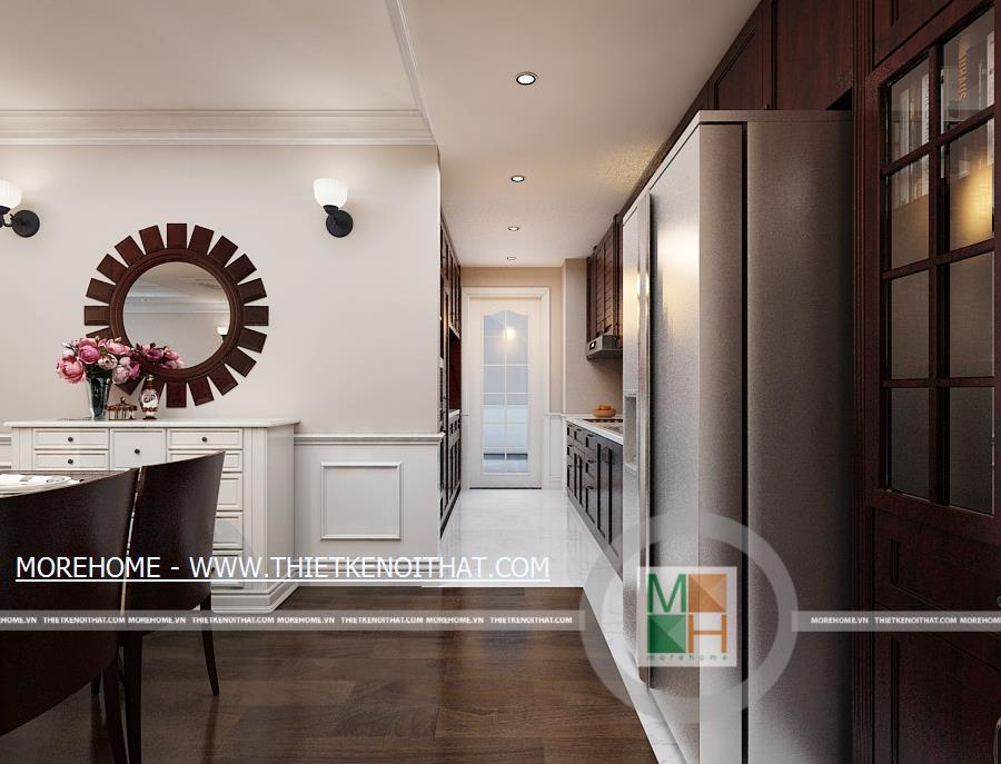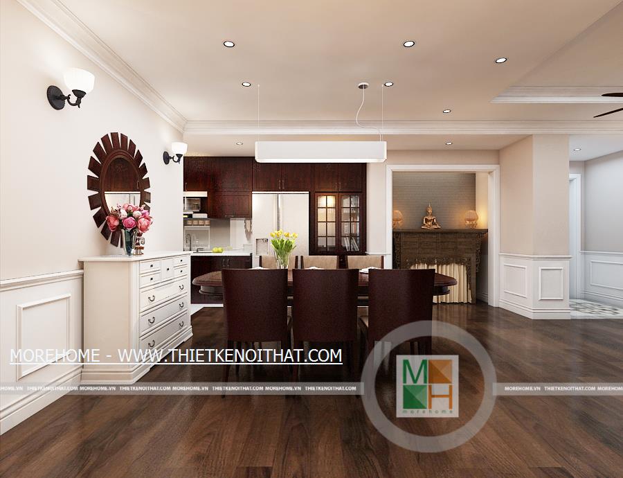 Phòng ăn với không gian rộng rãi và thoái mái, bộ bàn ăn bằng gỗ kiểu dáng đơn giản đặt giữa phòng. Khu vực nấu ăn sạch sẽ, được trang bị nhiều tủ gỗ cùng màu sắc với sàn nhà. Sự sang trọng và hiện đại của phòng ăn còn được thể hiện ở hệ thống ánh sáng cùng một số đồ trang trí như lọ hoa, kệ và gương treo tường. Không gian phòng ăn dường như ấm cúng hơn khi có bàn thờ phật được đặt bên cạnh khu nấu ăn.