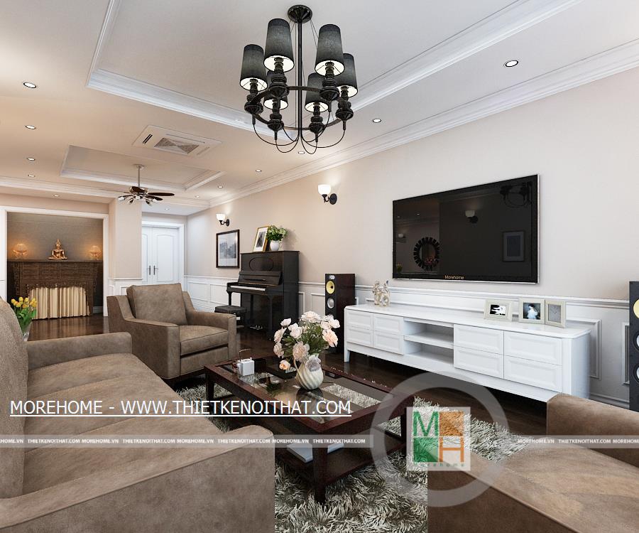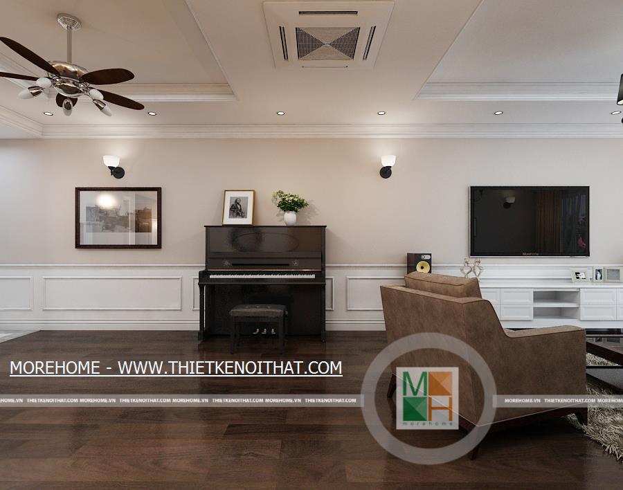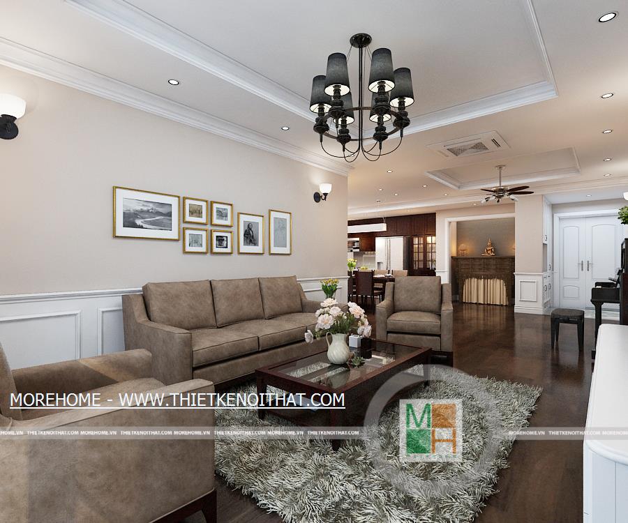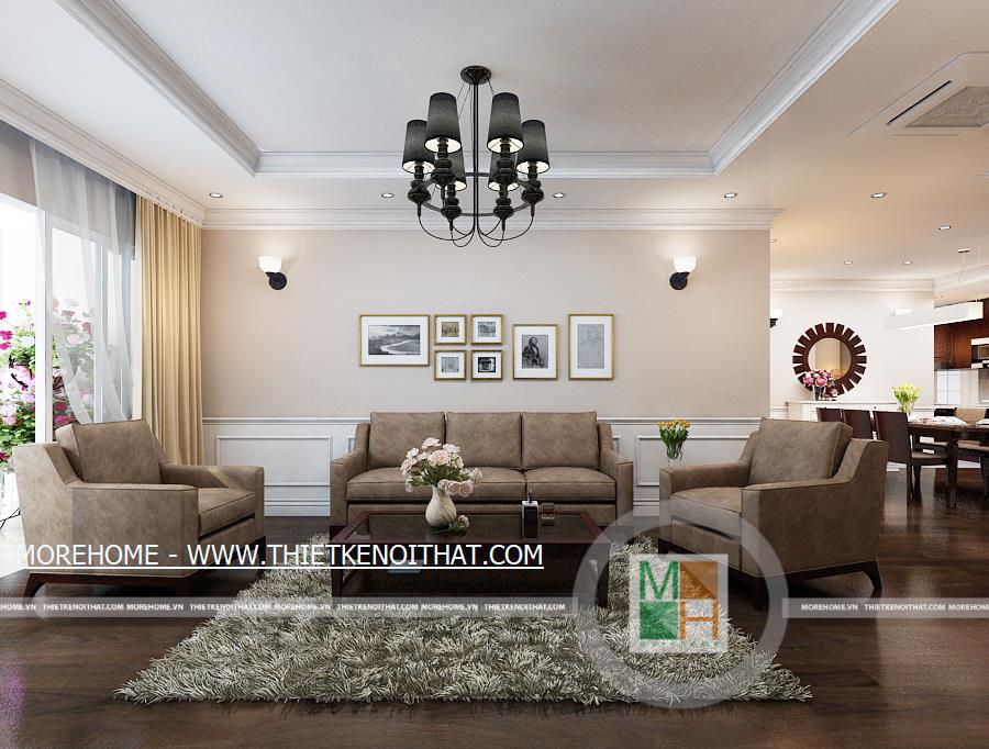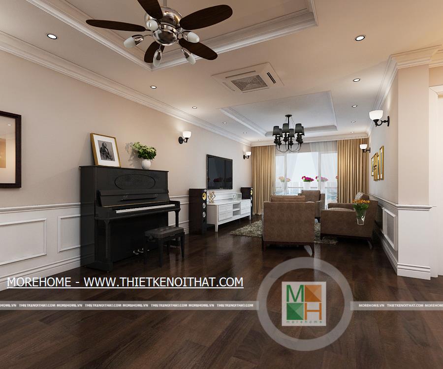 Căn hộ được thiết kế mở thông phòng khách và nhà ăn nhưng vẫn giữ được sự tách biệt nhờ cách vách tường chia không gian. Phòng khách nổi bật với bộ sô pha màu trầm, kết hợp hài hòa với màu nâu của sàn gỗ tự nhiên. Không gian phòng khách đơn giản nhưng vẫn thể hiện được sự hiện đại nhờ cách bố trí nội thất cùng các đồ trang trí. Hệ thống đèn chùm, đèn mắt trâu cùng đèn tường trang trí làm cho căn phòng thêm màu sắc và trang hoàng hơn. Chiếc piano nhỏ đặt trong phòng vừa làm vật trang trí nội thất cho căn phòng thêm phần sang trọng vừa thể hiện được sự đam mê âm nhạc của gia chủ. Cửa lớn hướng ra bên ngoài mang lại không khí và anh sáng tự nhiên cho toàn bộ căn nhà.