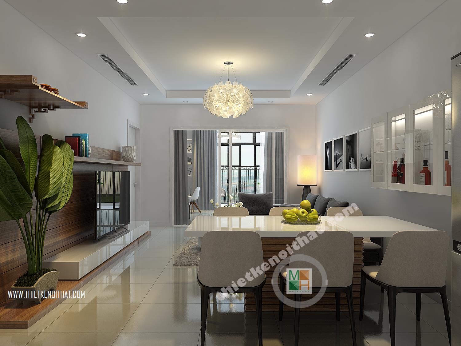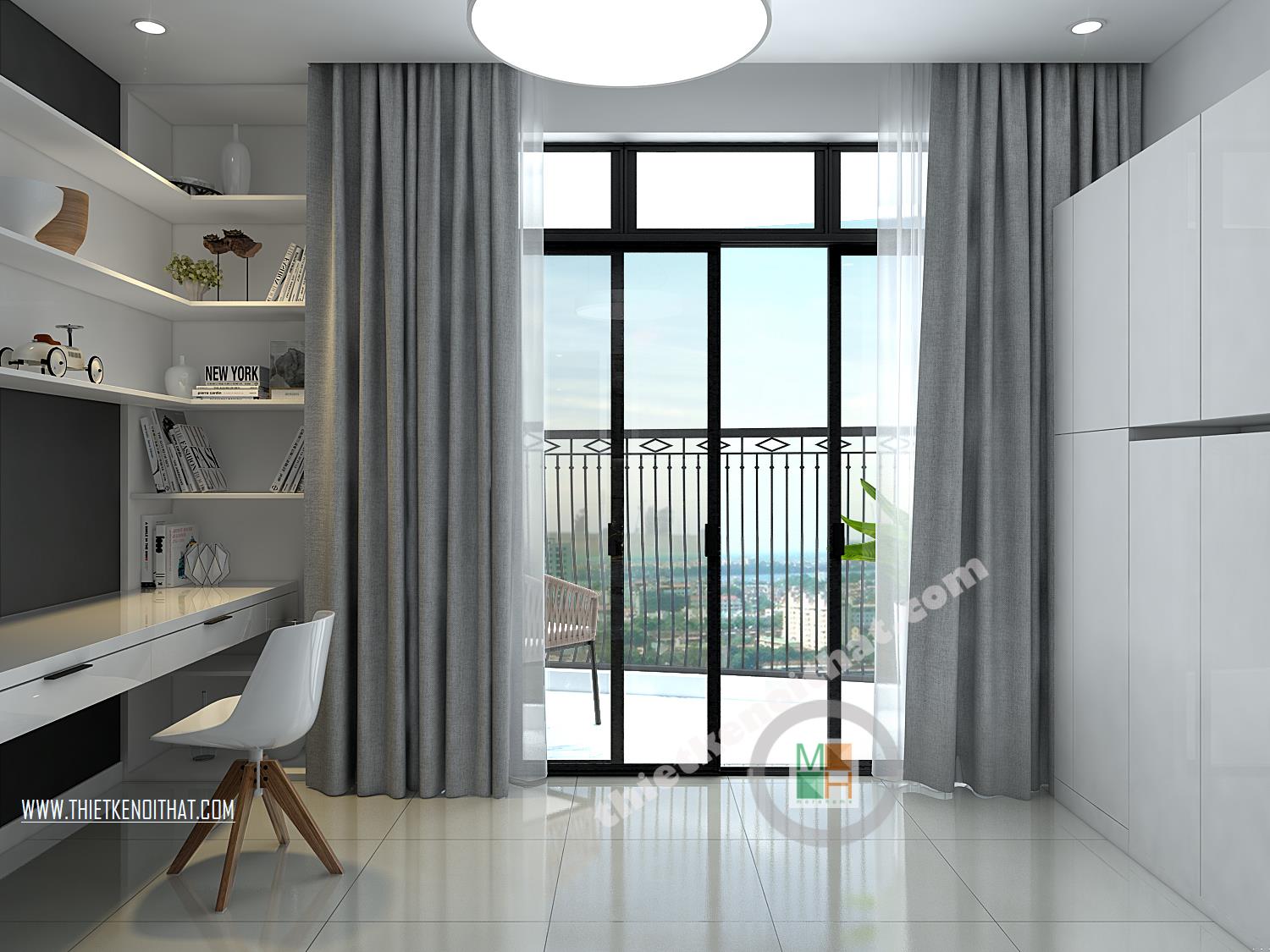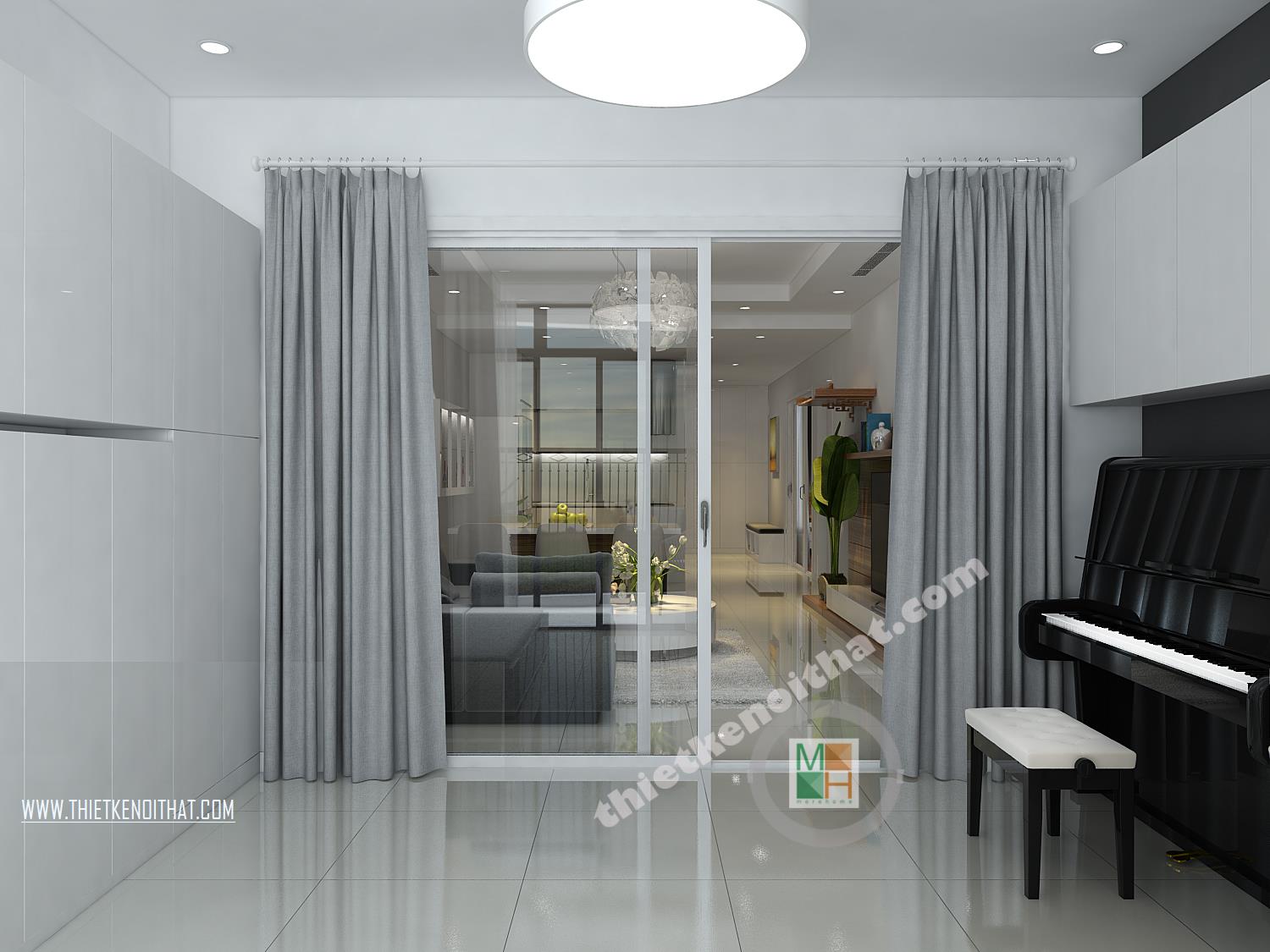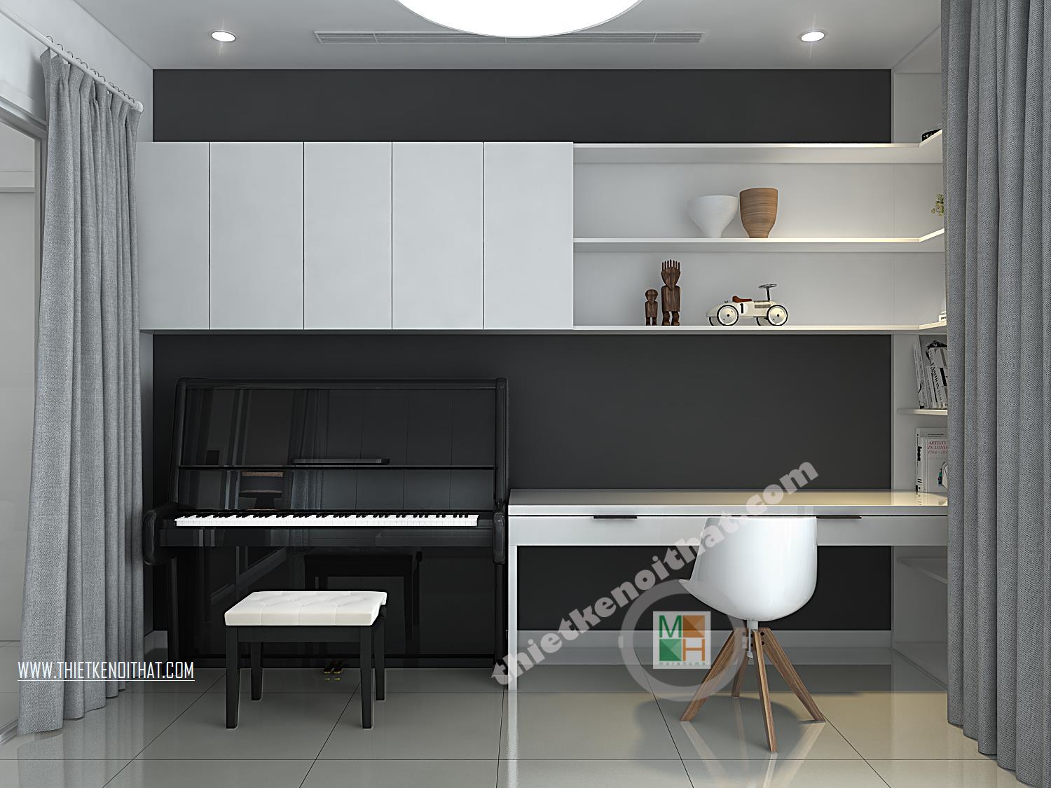 Thiết kế phòng khách đơn giản thông suốt với không gian phòng làm việc bằng lớp cửa kính trong suốt. Không gian làm việc và học tập được ưu ái thông suốt với ban công hướng ra sân trời mang đến một không gian sống đầy hứng khởi và thư giãn. Thiết kế không gian tối giản với kệ tủ thiết kế đồng nhất với tường giúp tiết kiệm không gian. Bàn học và khu luyện đàn piano thiết kế tối giản hóa mang phong cách trẻ trung và hiện đại, phù hợp với phong cách thiết kế chung của cả căn hộ.