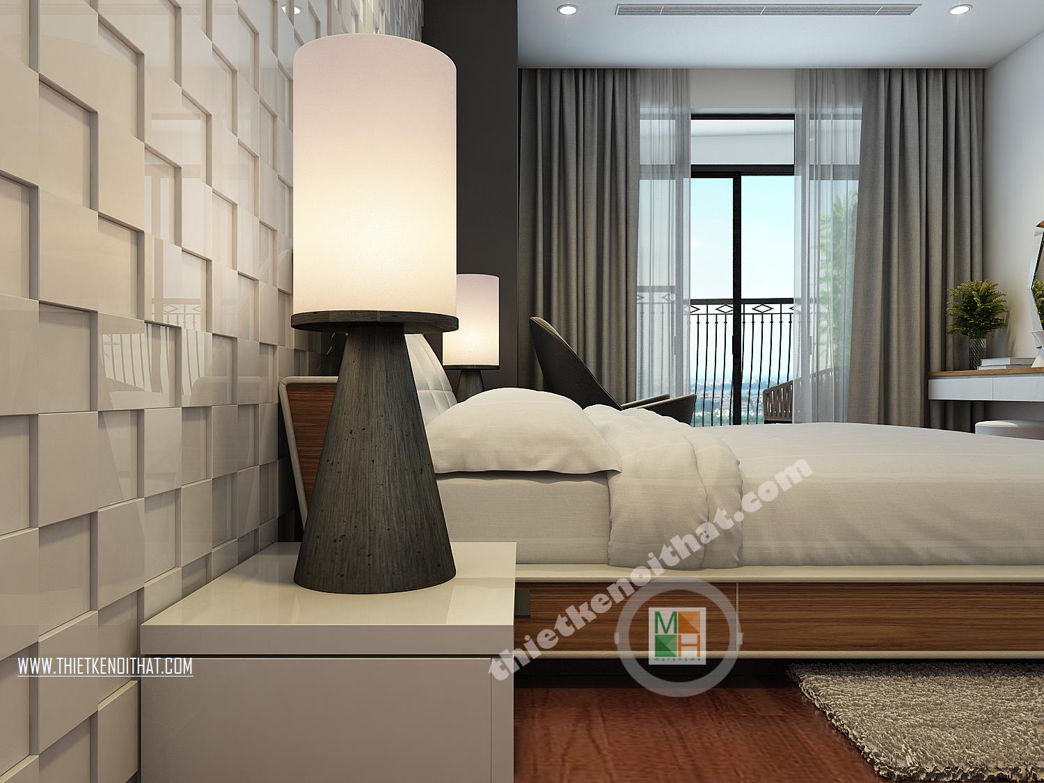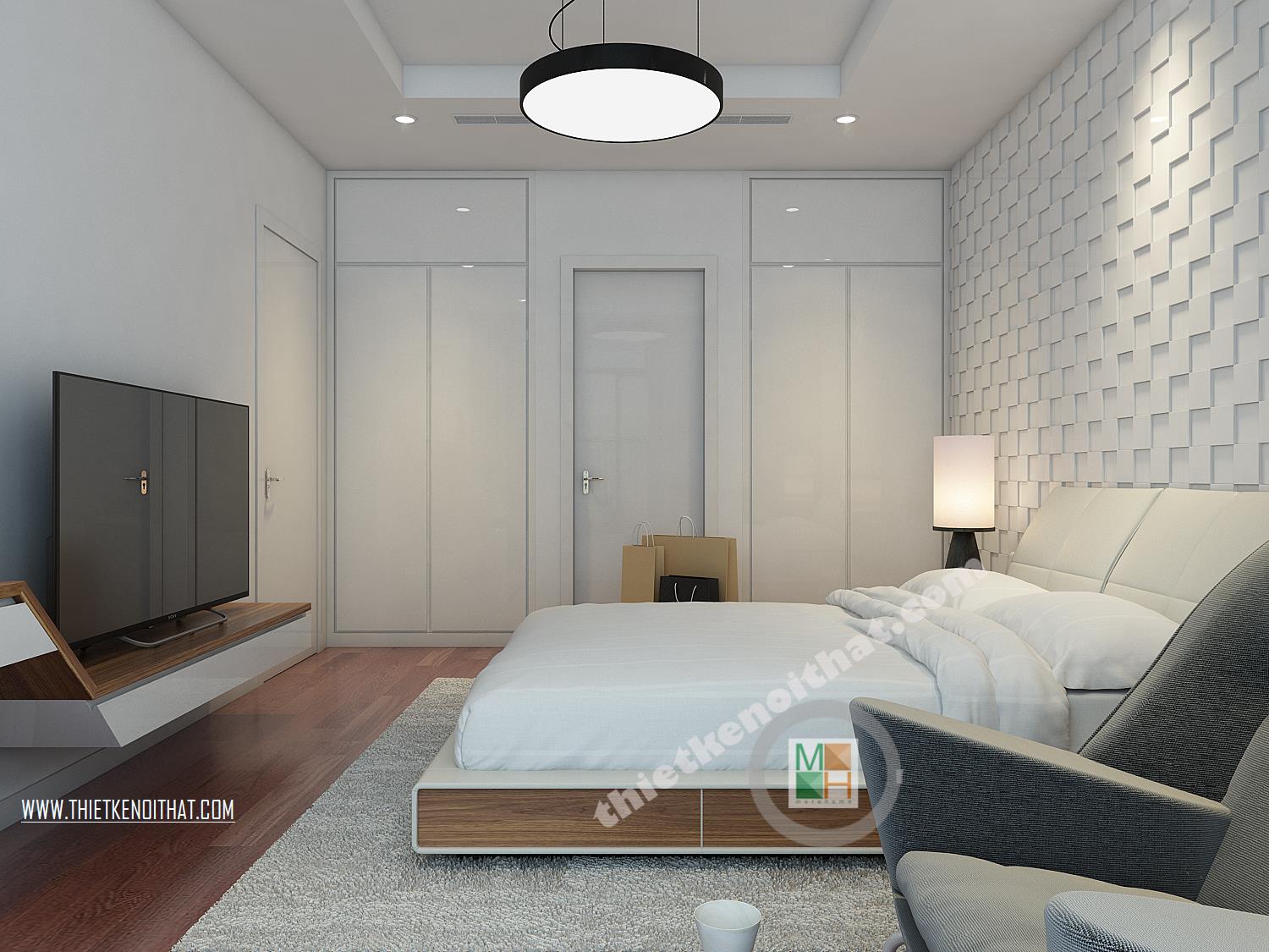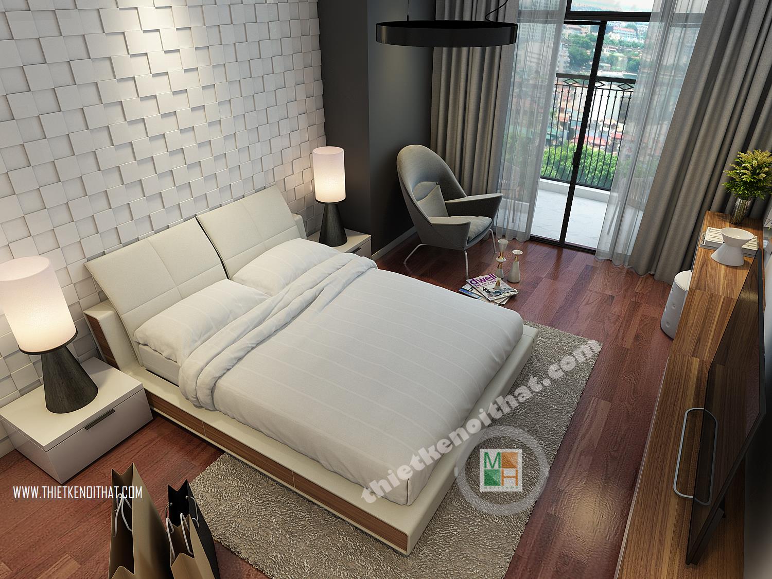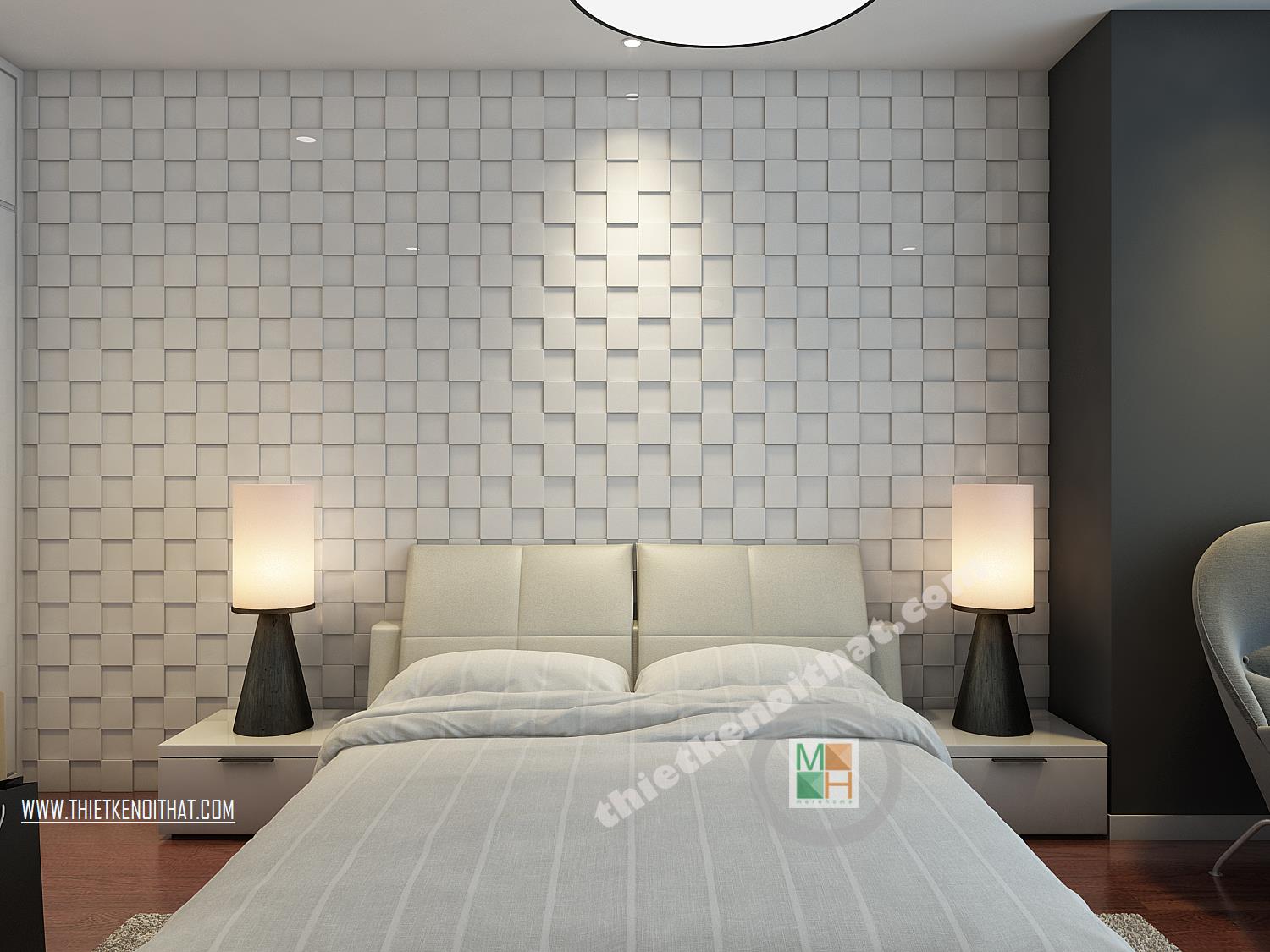 Thiết kế nội thất phòng ngủ hiện đại gây ấn tượng mạnh với thiết kế cách tân sáng tạo sử dụng những hình khối và màu sắc đơn giản. Với bức tường thô cứng, đơn điệu, kiến trúc sư đã xử lý khéo léo tạo thành một khối hình nổi 3D đặc sắc, tông màu trắng vẫn được giữ nguyên vẹn đảm bảo không làm mất đi tính thống nhất trong thiết kế nội thất. Trong nguyên tắc thiết kế nói chung và sử dụng màu sắc nói riêng, một không gian không nên sử dụng quá 3 màu khác biệt, không gian phòng ngủ lại là nơi thư giản và cần sự thoải mái, sự lựa chọn tông màu xám khói và trắng là hai tông màu trung tính hài hòa được nghiên cứu là rất phù hợp để mai lại cảm giác gần gũi và an tâm cho gia chủ. Khung cửa ra sân trời mở rộng đón ánh sáng tự nhiên mang lại sức sống cho căn phòng. Thiết kế kệ tủ theo phong cách tối giản giúp tiết kiệm không gian mà vẫn đảm bảo tính công năng sử dụng. Thiết kế vườn treo nhỏ ngay phía ban công là điểm nhấn xanh đầy đặc trưng cho các thiết kế hiện đại gần đây mang đến một không gian sống thân thiện và tích cực.