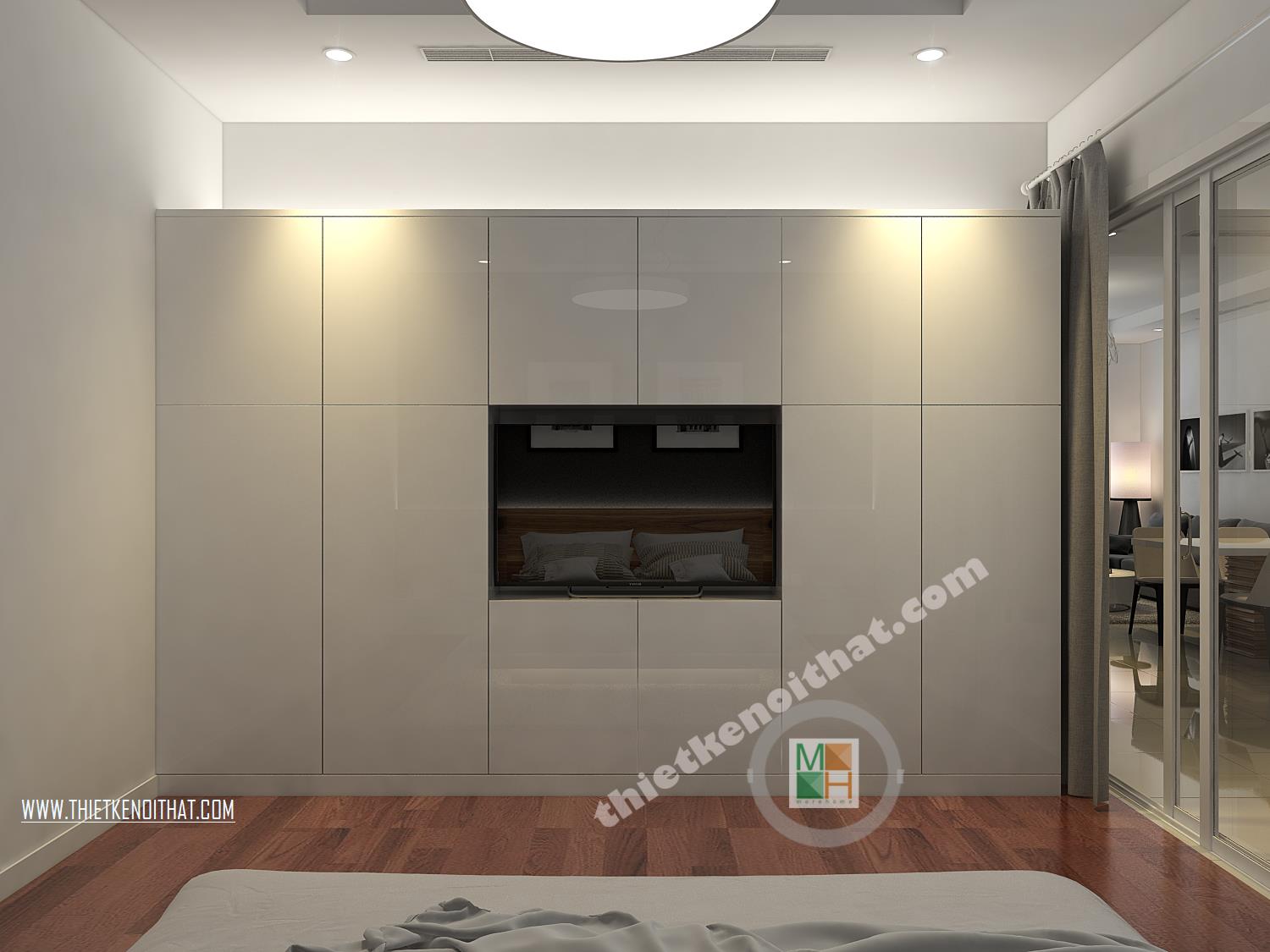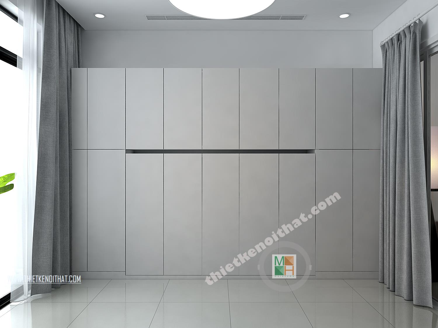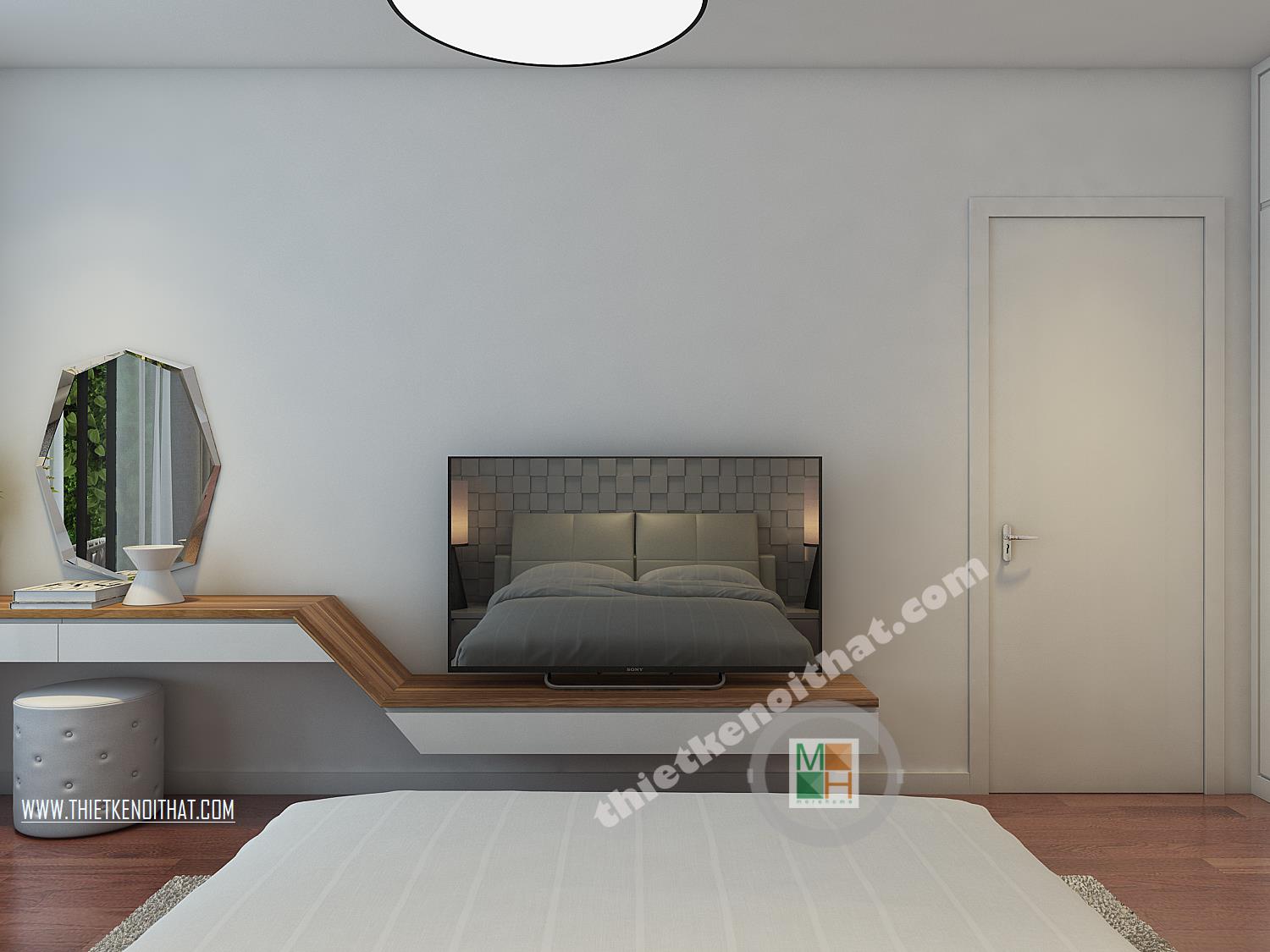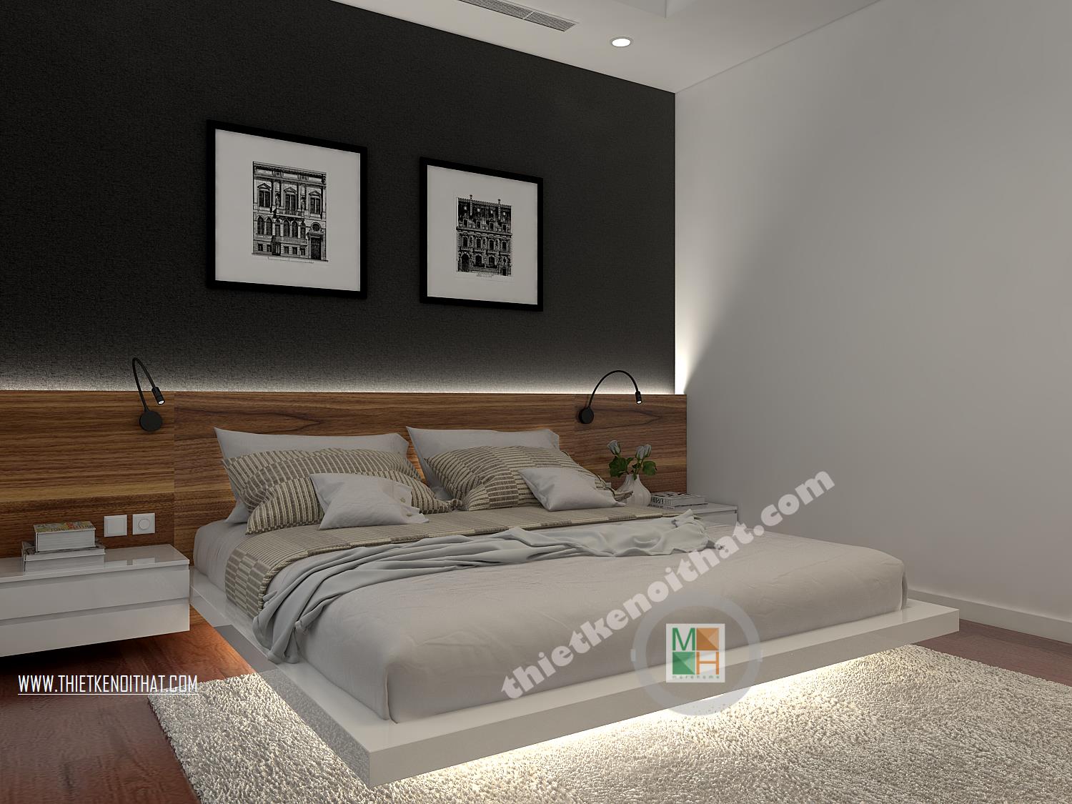 Thiết kế nội thất phòng ngủ hiện đại gây ấn tượng mạnh với thiết kế cách tân sáng tạo sử dụng những hình khối và màu sắc đơn giản. Với bức tường thô cứng, đơn điệu, kiến trúc sư đã xử lý khéo léo tạo thành một khối hình nổi 3D đặc sắc, tông màu trắng vẫn được giữ nguyên vẹn đảm bảo không làm mất đi tính thống nhất trong thiết kế nội thất. Trong nguyên tắc thiết kế nói chung và sử dụng màu sắc nói riêng, một không gian không nên sử dụng quá 3 màu khác biệt, không gian phòng ngủ lại là nơi thư giản và cần sự thoải mái, sự lựa chọn tông màu xám khói và trắng là hai tông màu trung tính hài hòa được nghiên cứu là rất phù hợp để mai lại cảm giác gần gũi và an tâm cho gia chủ. Khung cửa ra sân trời mở rộng đón ánh sáng tự nhiên mang lại sức sống cho căn phòng. Thiết kế kệ tủ theo phong cách tối giản giúp tiết kiệm không gian mà vẫn đảm bảo tính công năng sử dụng. Thiết kế vườn treo nhỏ ngay phía ban công là điểm nhấn xanh đầy đặc trưng cho các thiết kế hiện đại gần đây mang đến một không gian sống thân thiện và tích cực.